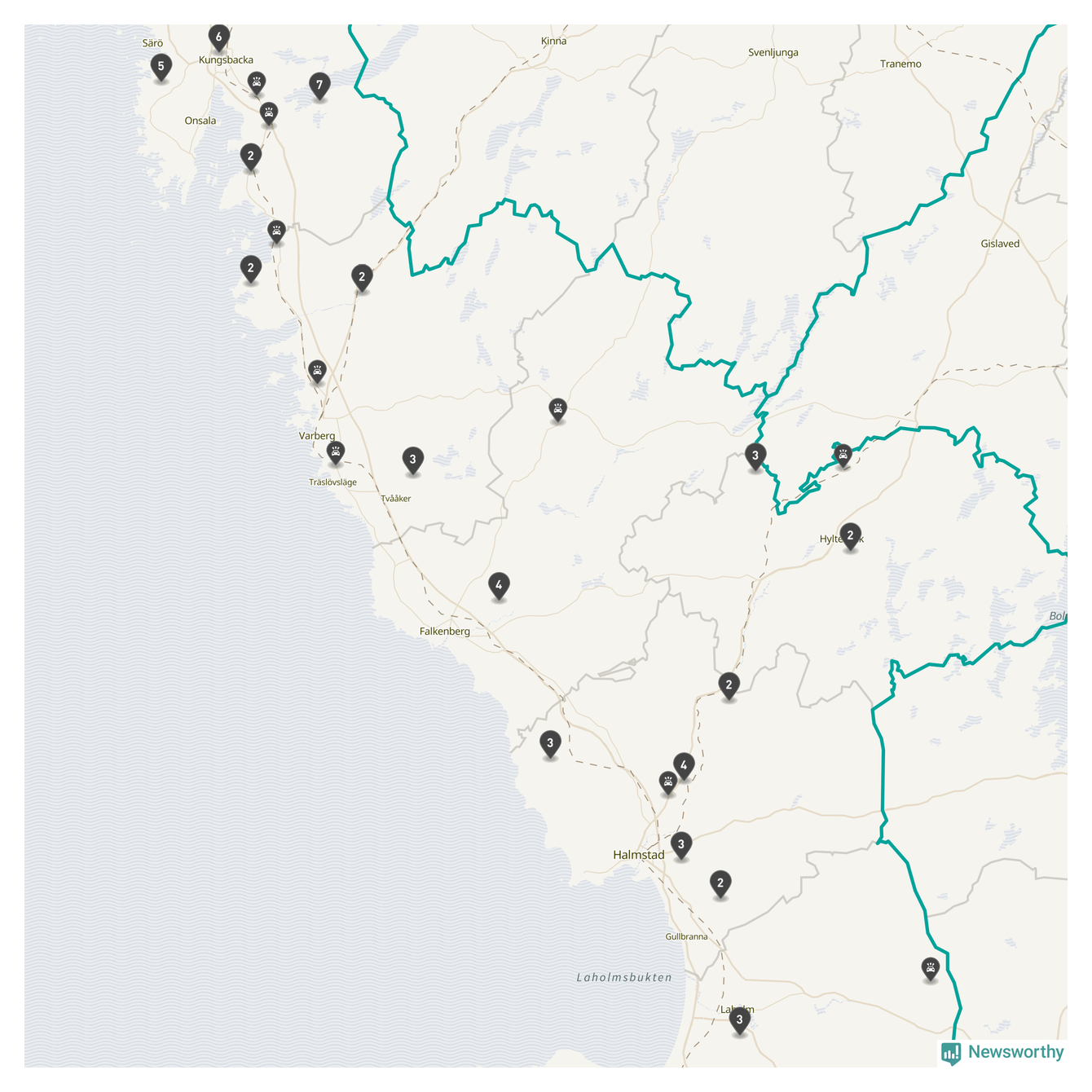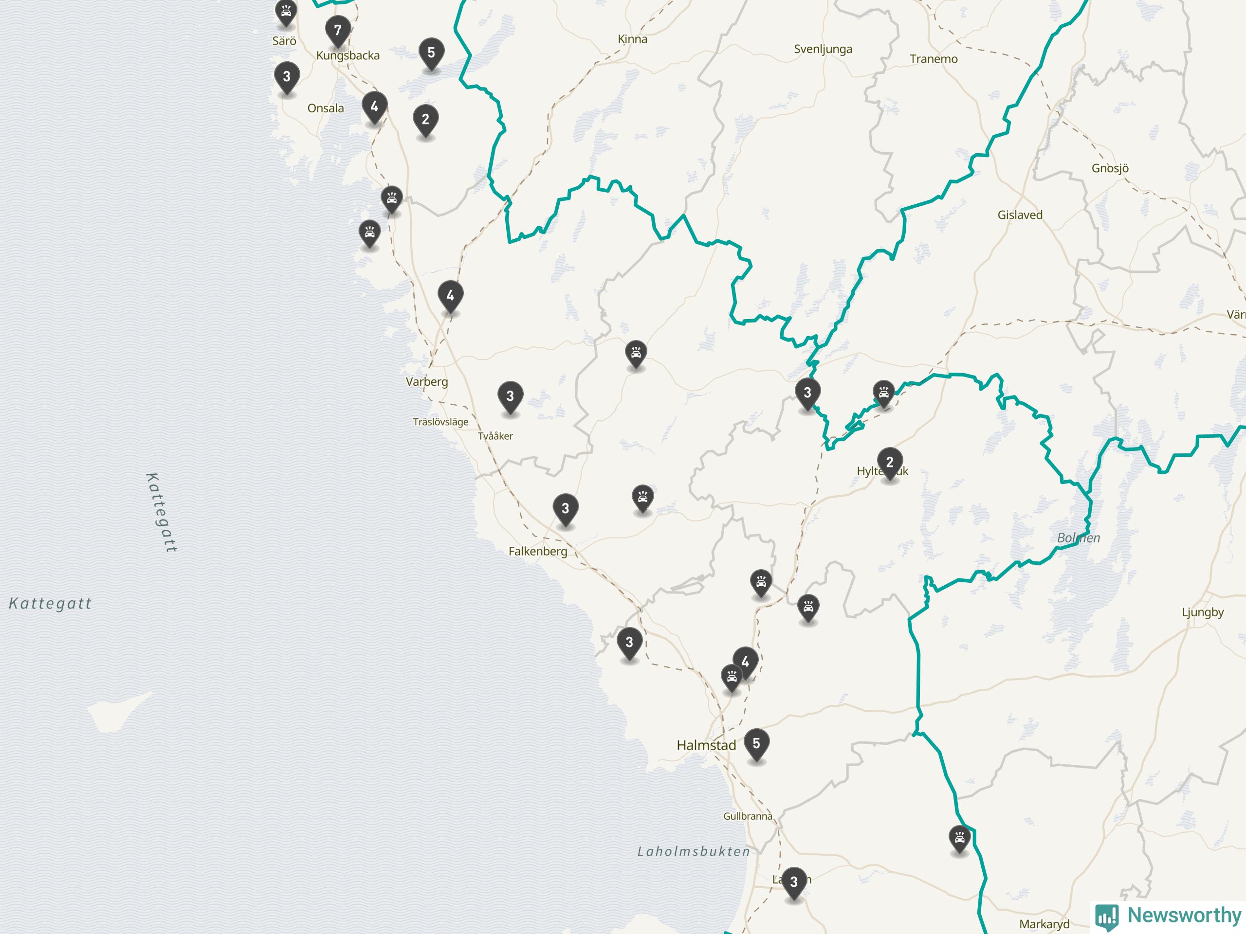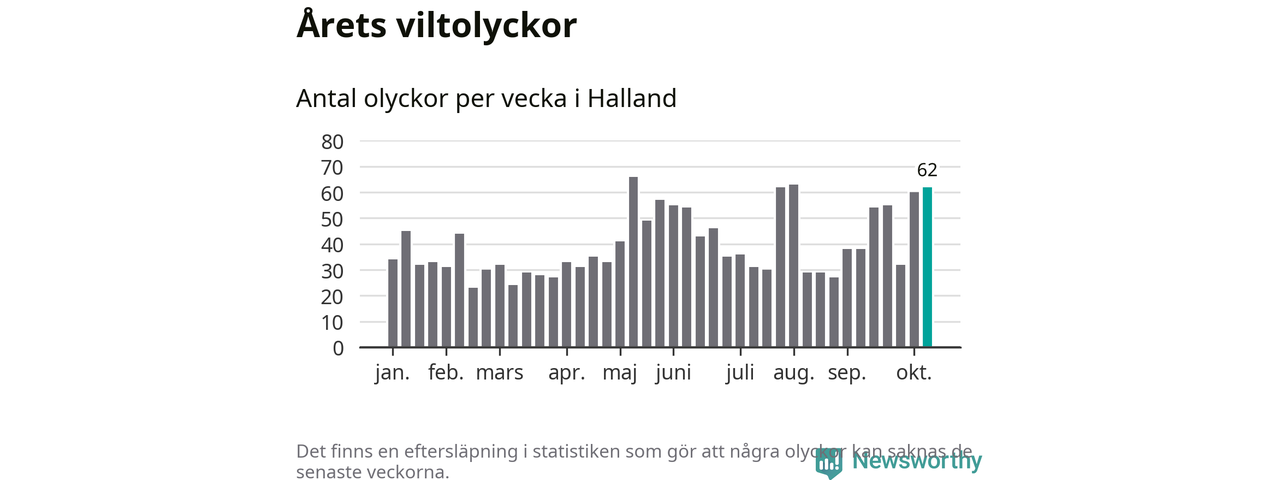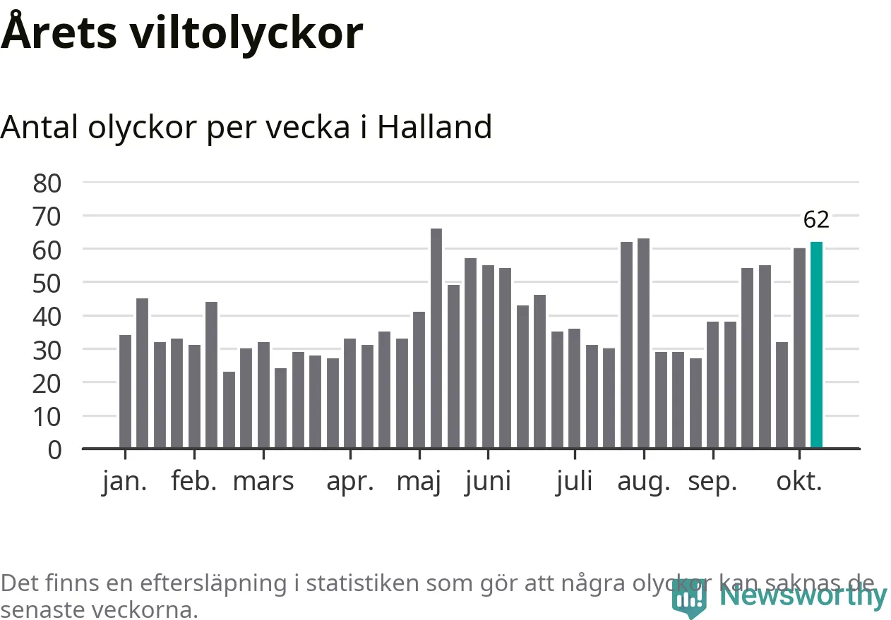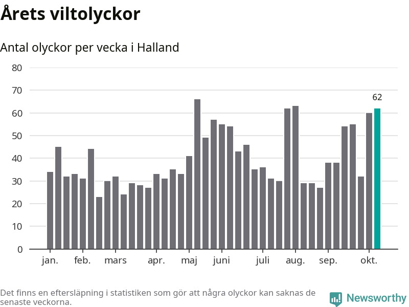 Hittills har 62 viltolyckor rapporterats in i Hallands län från vecka 42. Se listan här.