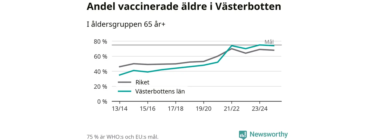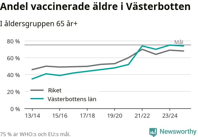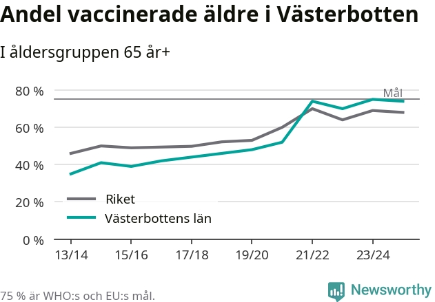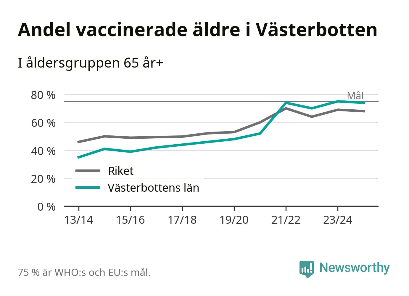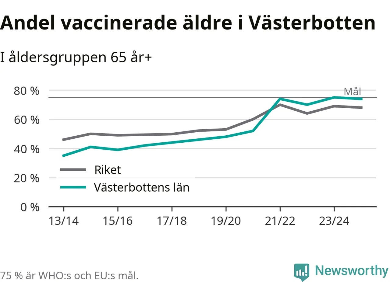 Region Västerbotten når alltså inte heller vaccinationsmålet, men har en avsevärt högre täckning nu än före pandemin. 2013/14 var andelen exempelvis bara 35 procent.