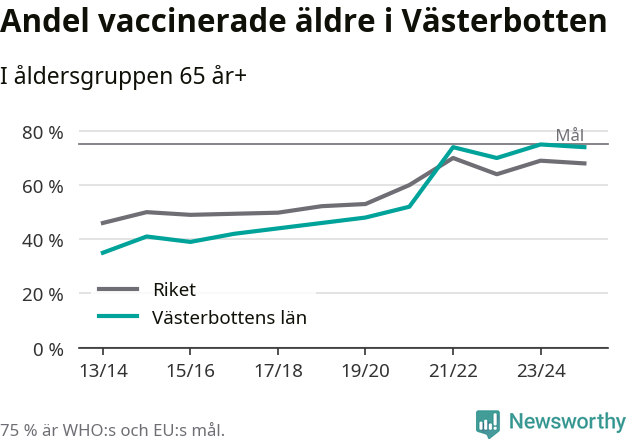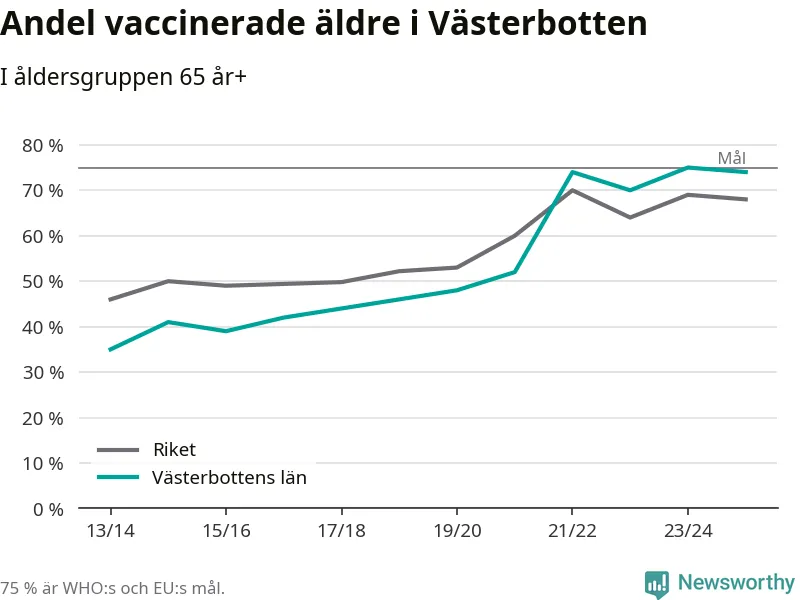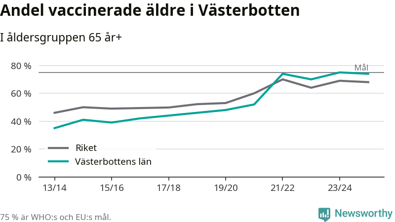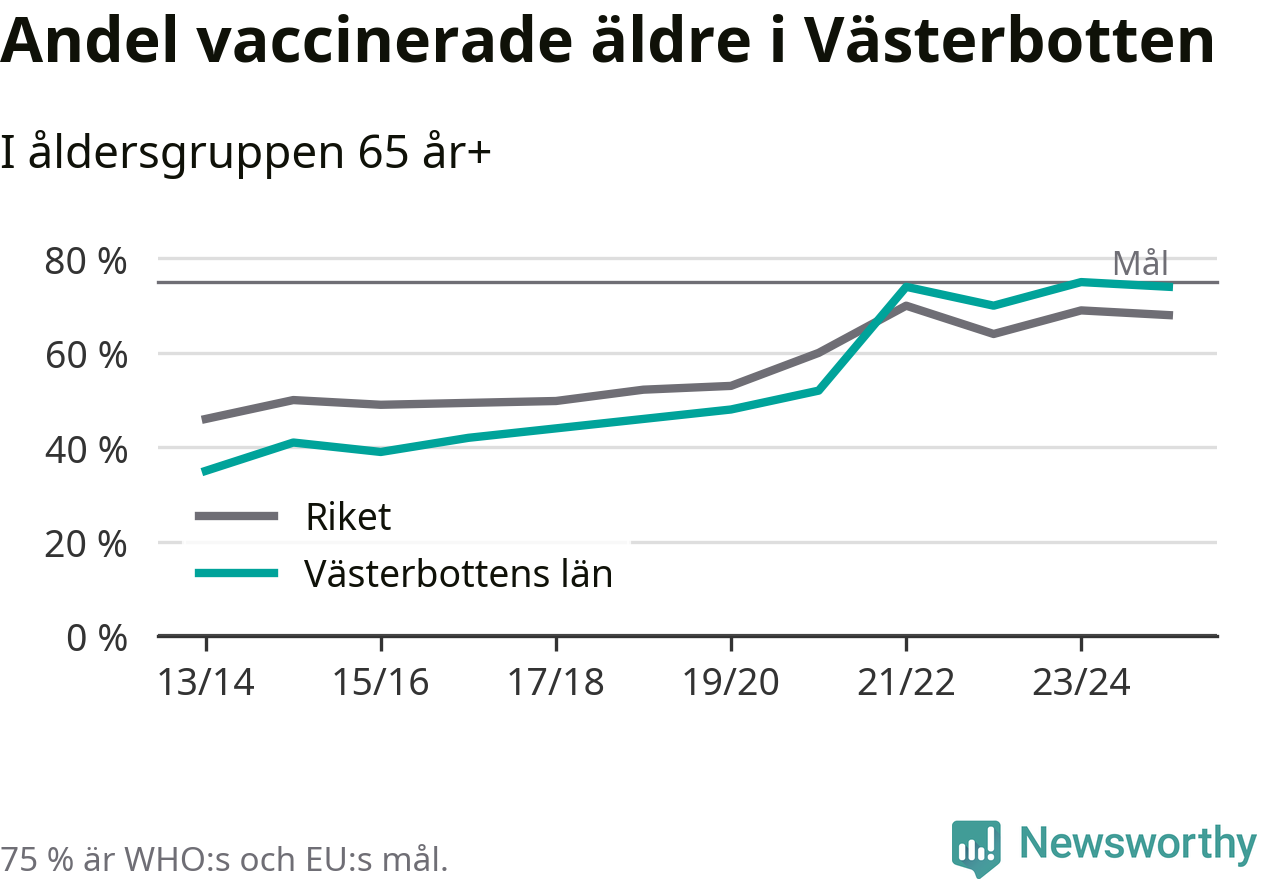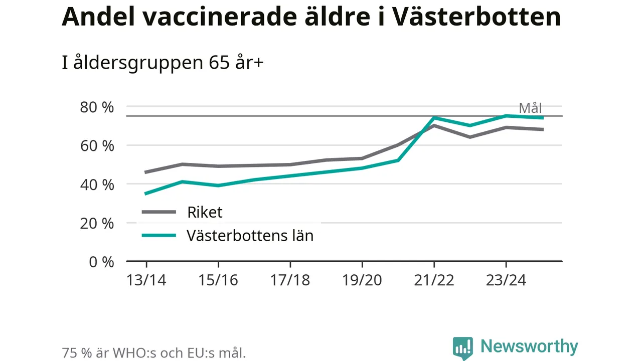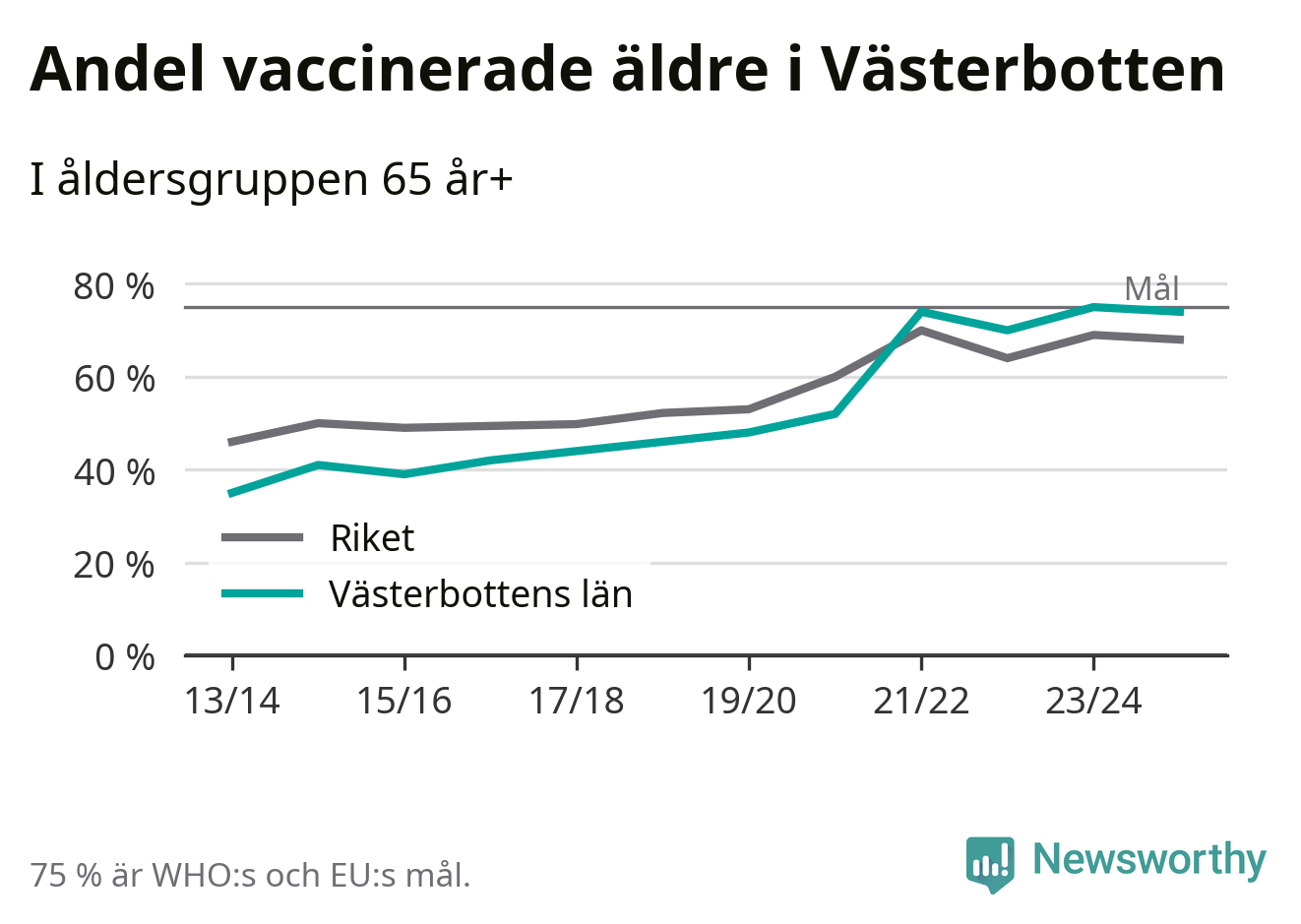 Region Västerbotten når alltså inte heller vaccinationsmålet, men har en avsevärt högre täckning nu än före pandemin. 2013/14 var andelen exempelvis bara 35 procent.