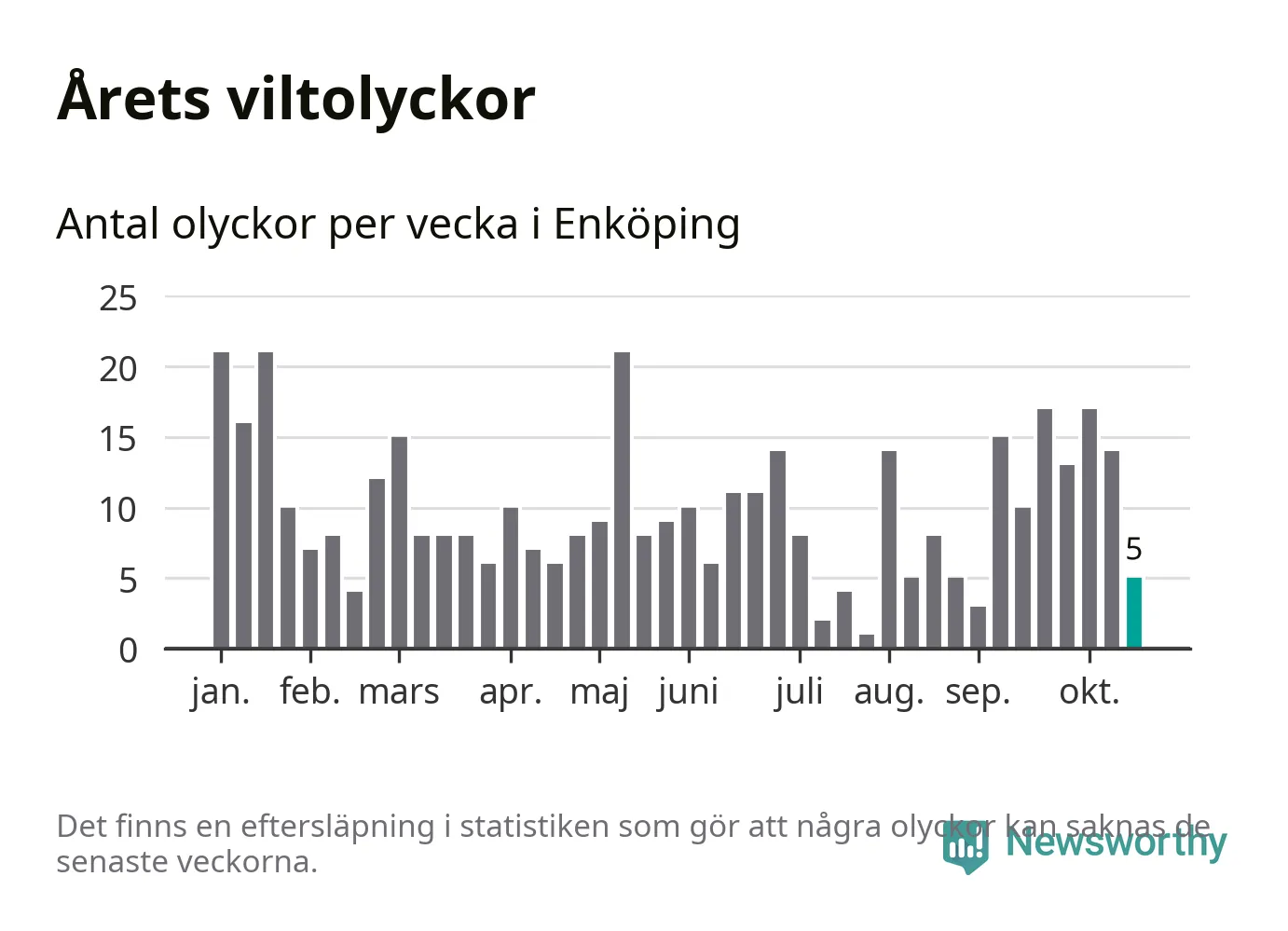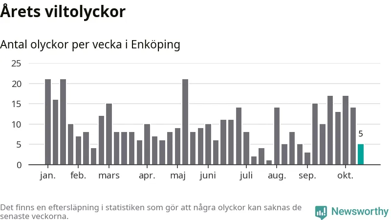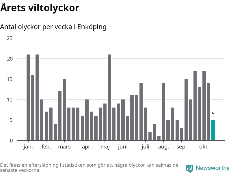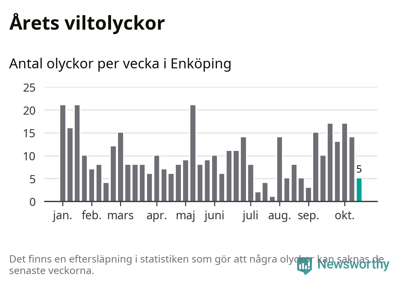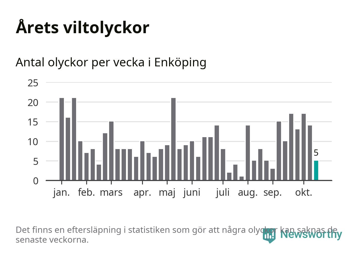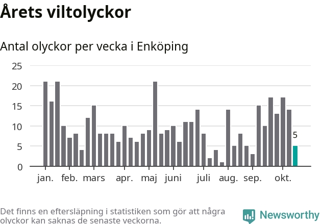 Hittills har fem viltolyckor rapporterats in i Enköpings kommun från vecka 43. Se listan här.