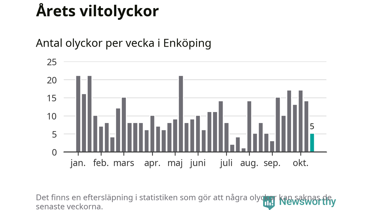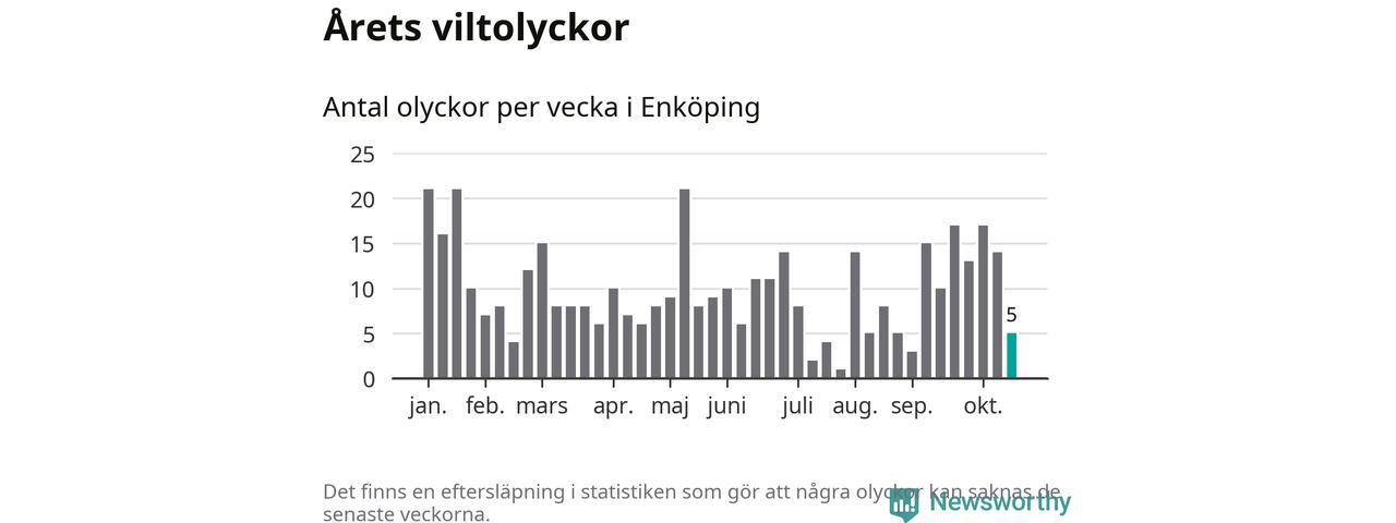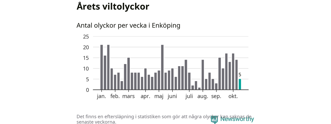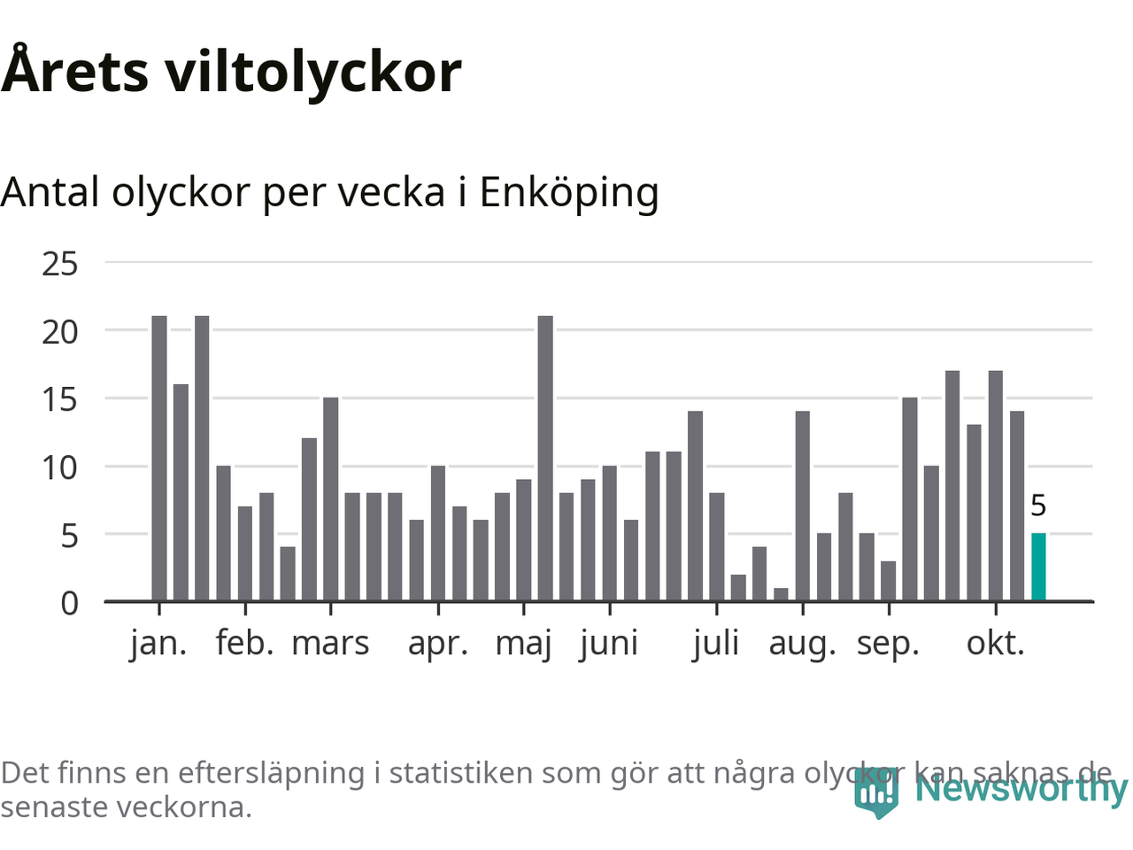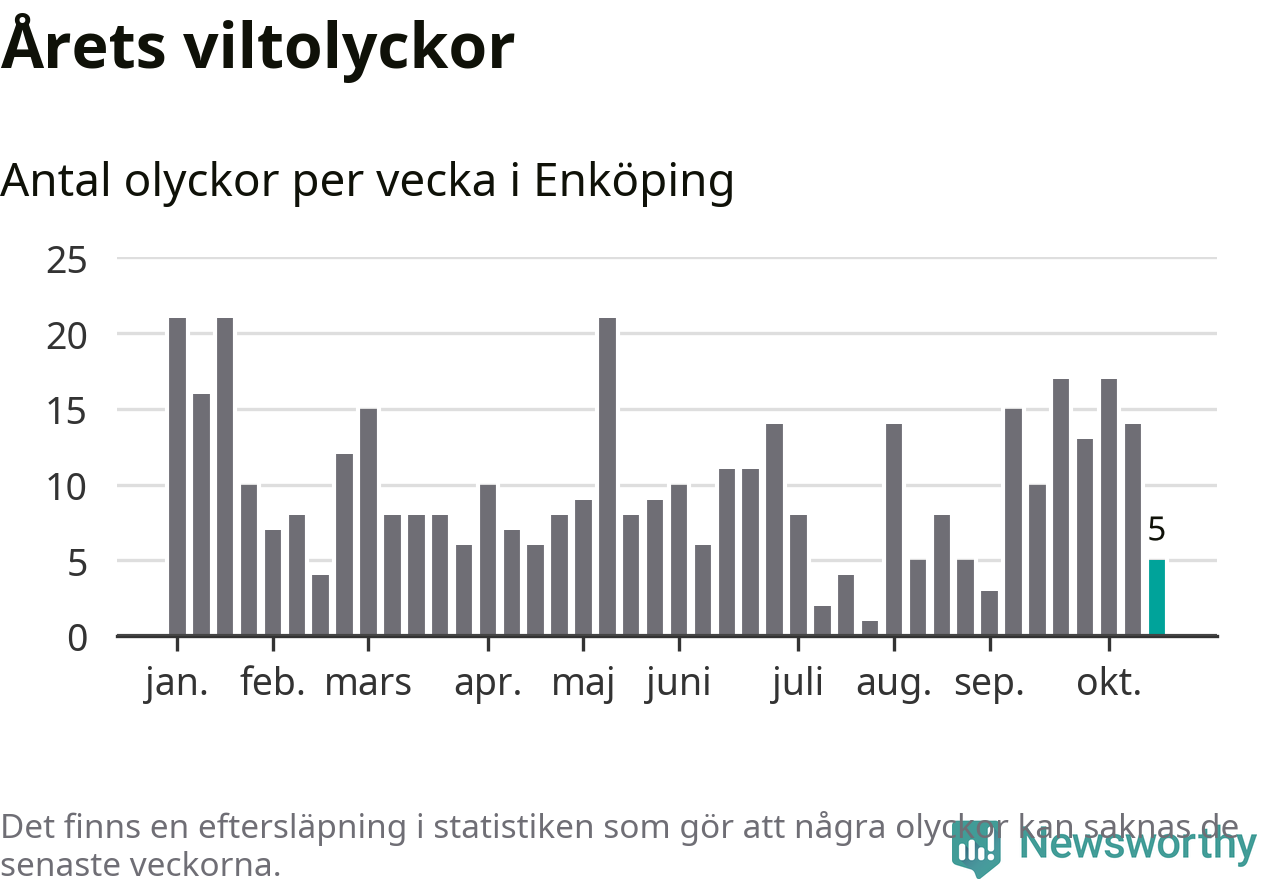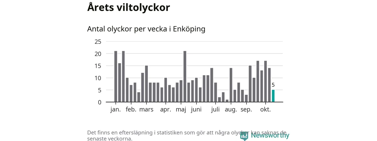 Hittills har fem viltolyckor rapporterats in i Enköpings kommun från vecka 43. Se listan här.
