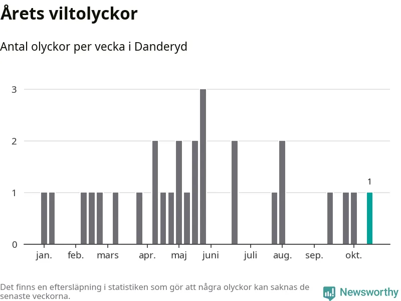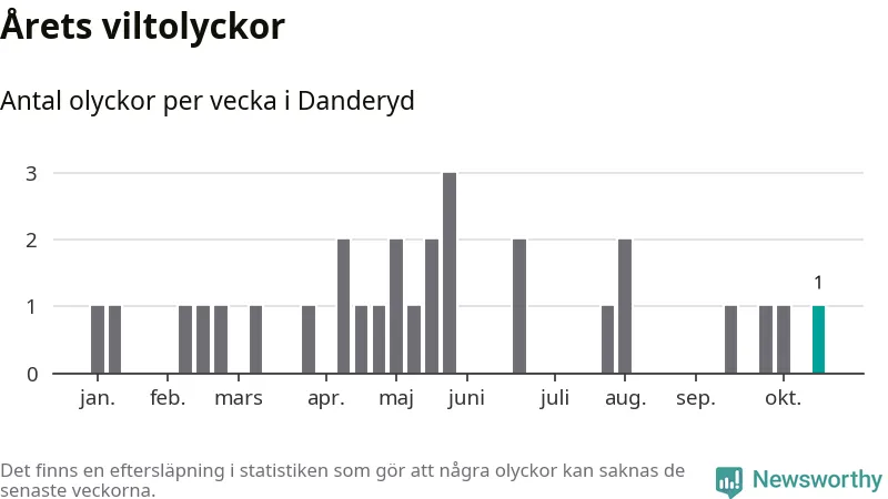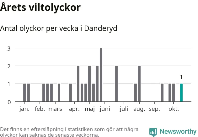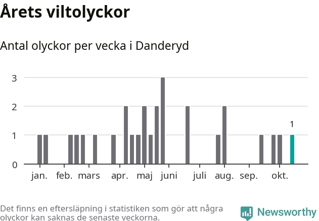 Totalt det här året har det inträffat 29 viltolyckor i kommunen. Det är mer än genomsnittet för motsvarande period (omkring 22) de senaste tio åren.