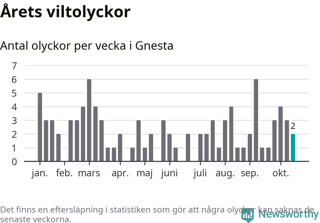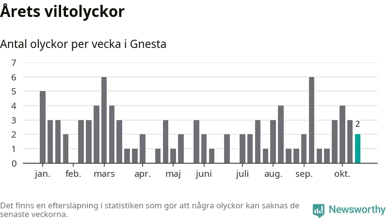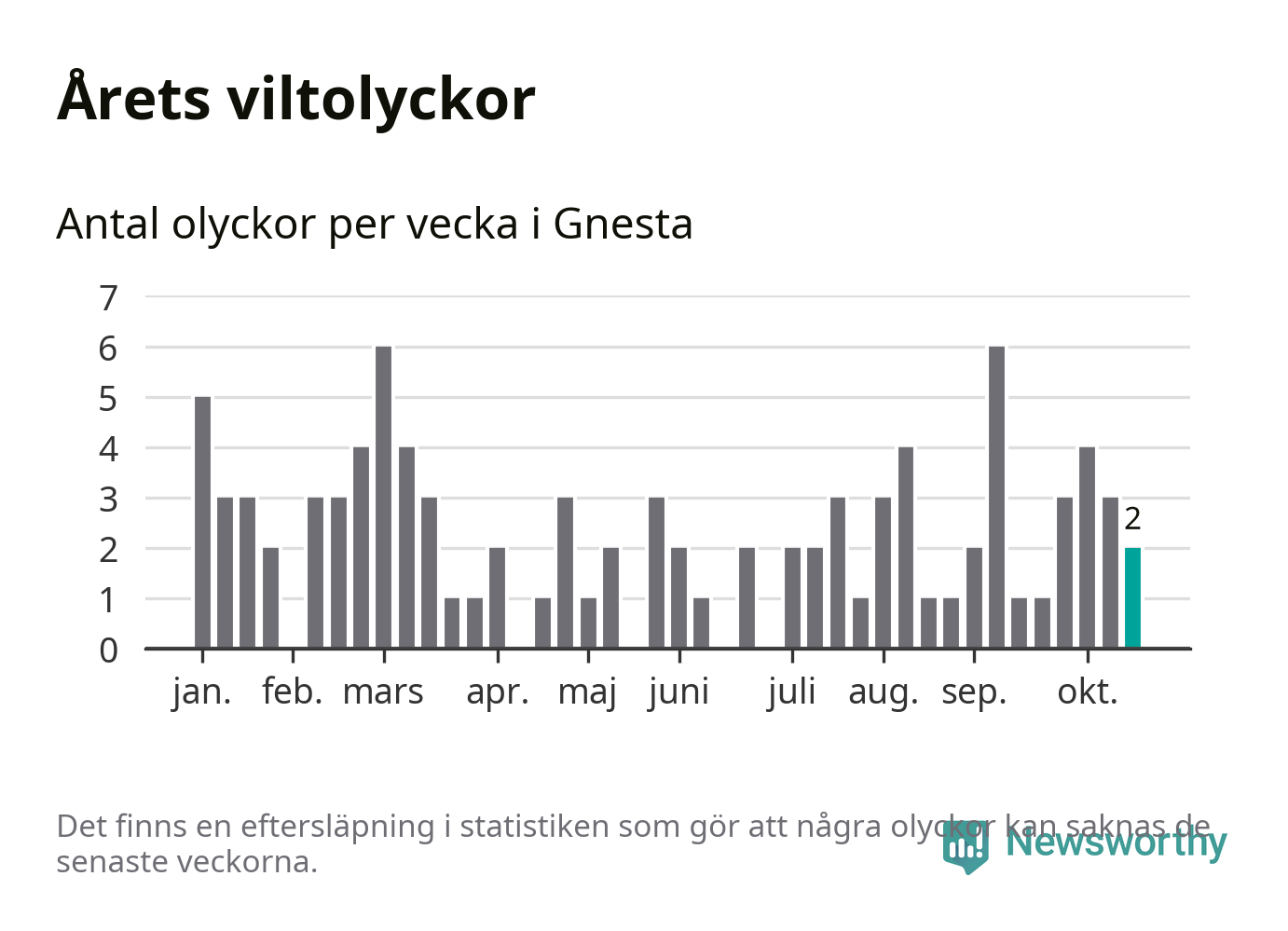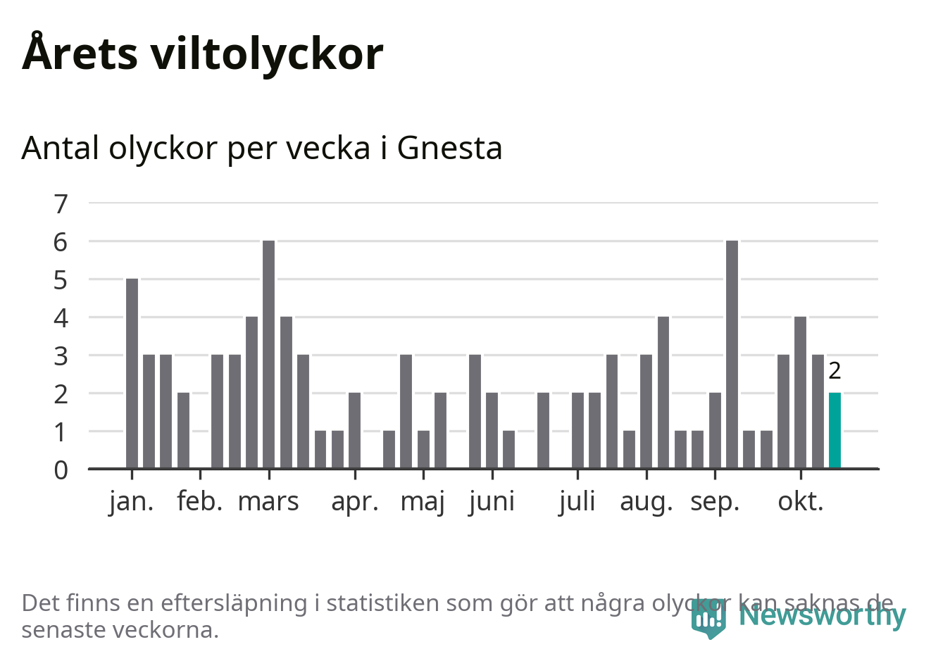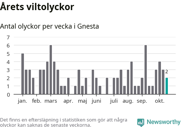 Hittills har två viltolyckor rapporterats in i Gnesta kommun från vecka 43. Se listan här.