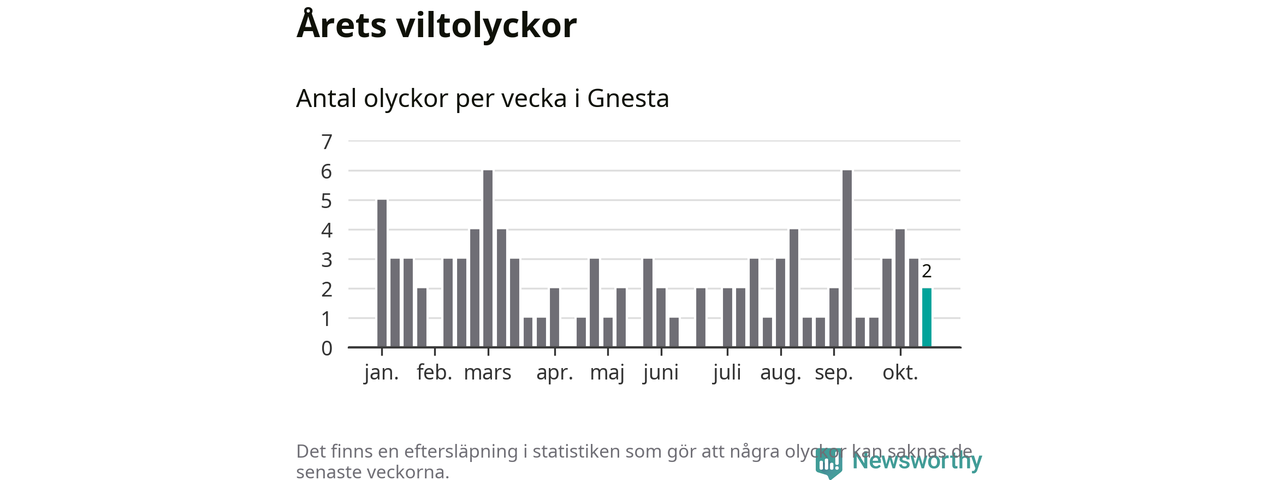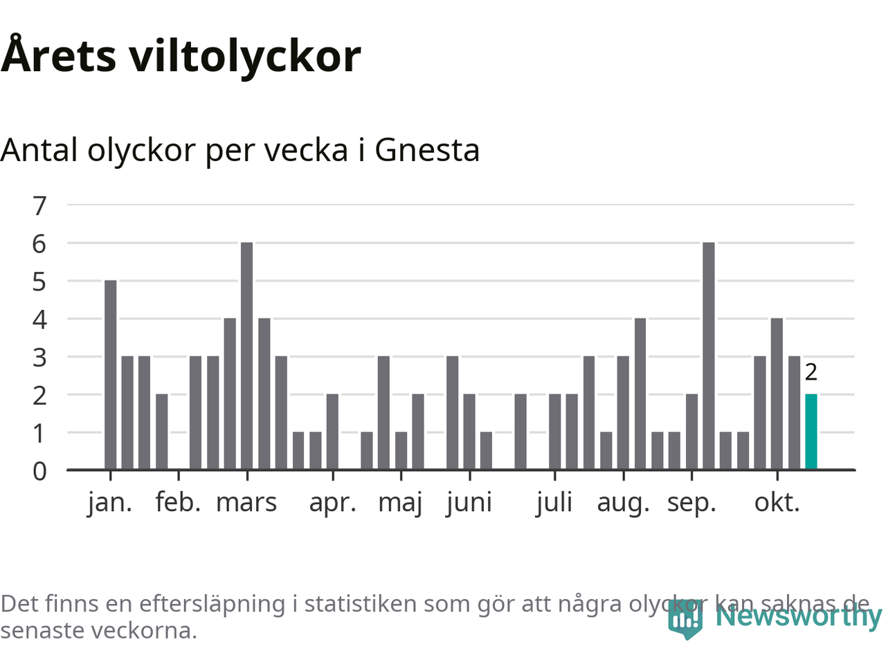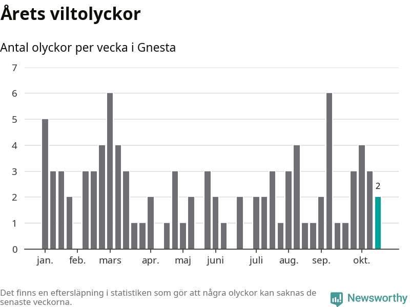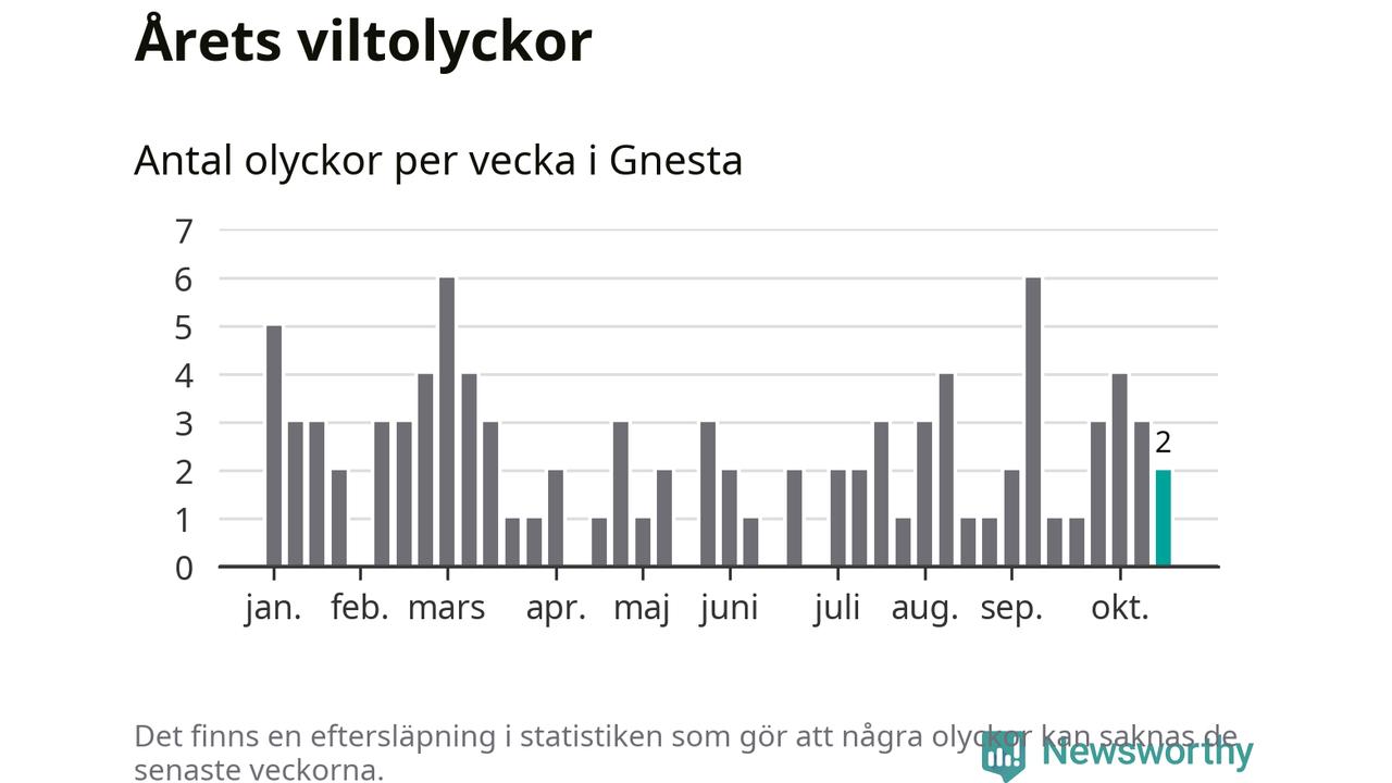 Hittills har två viltolyckor rapporterats in i Gnesta kommun från vecka 43. Se listan här.