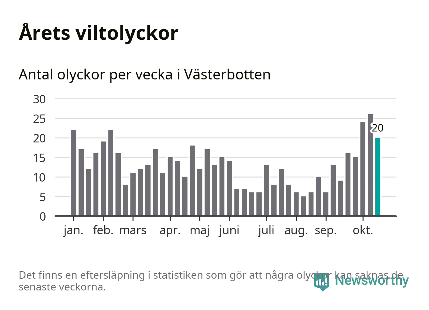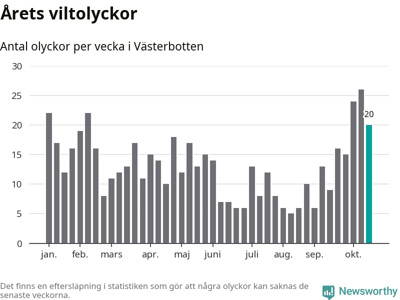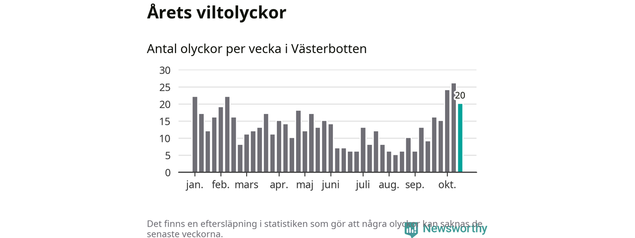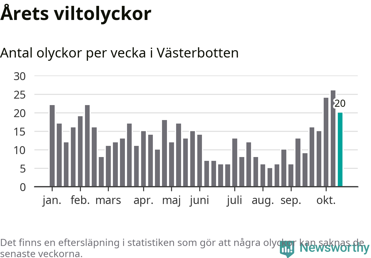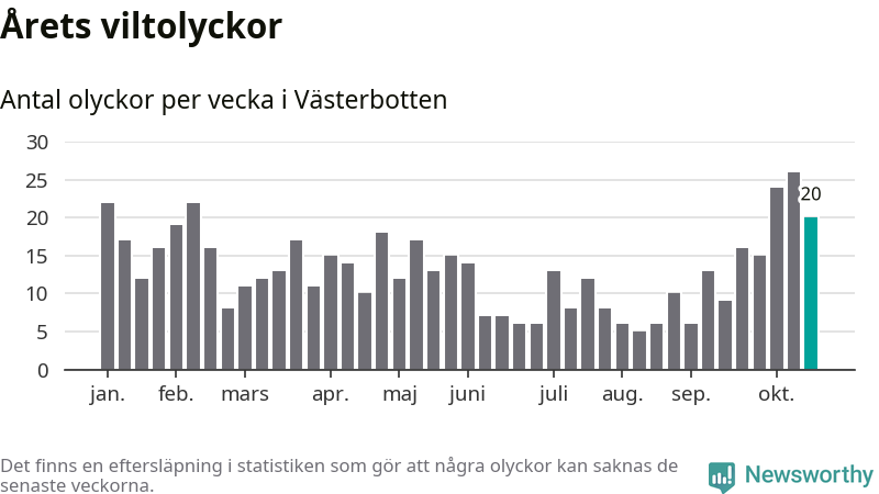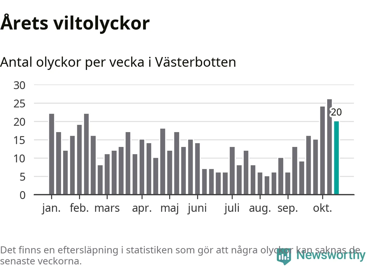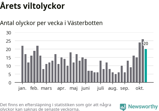 sett till de senaste tio årens statistik. I statistiken ingår inte olyckor med ren, som här räknas som tamdjur.