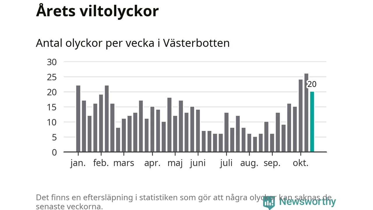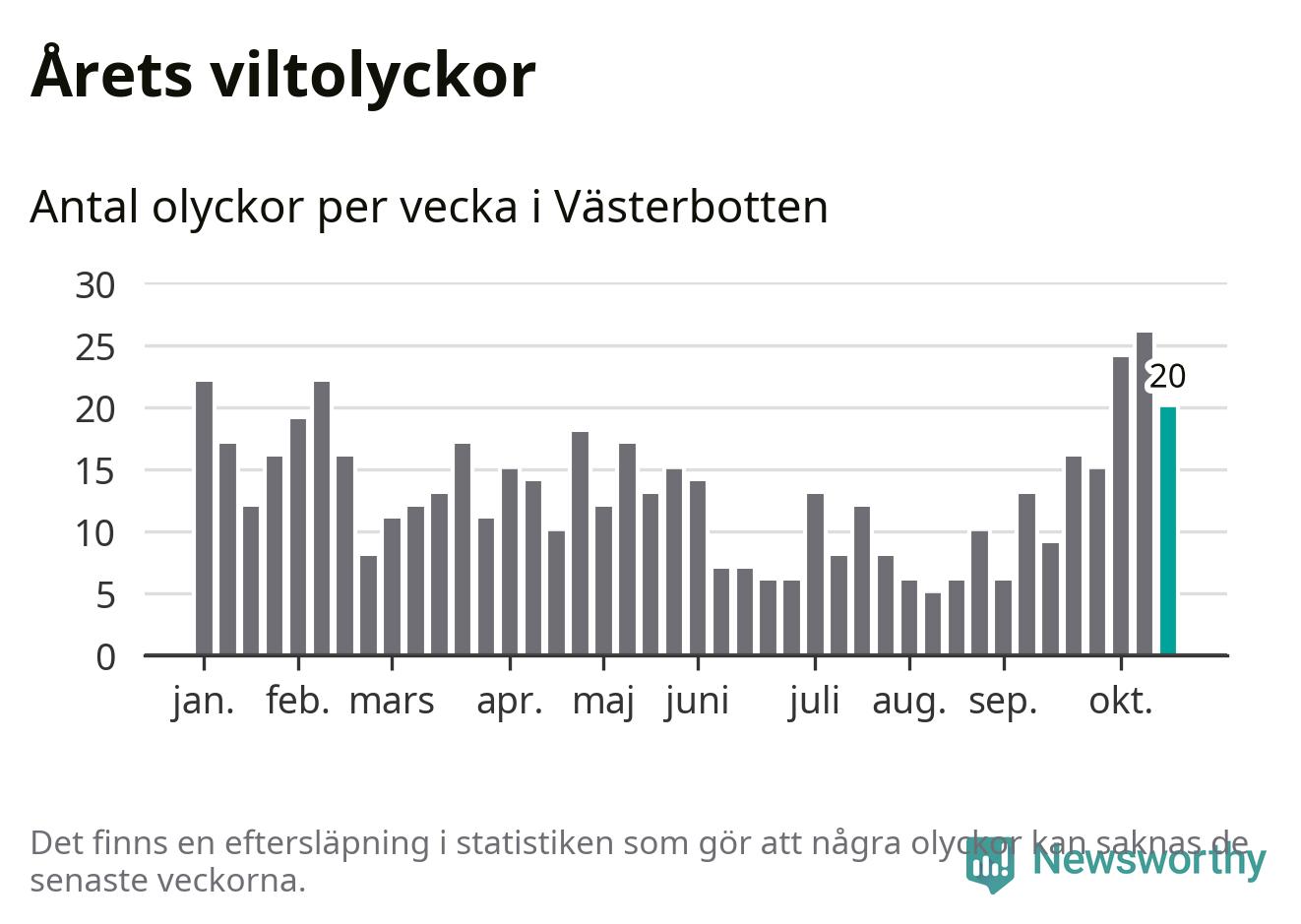 562 viltolyckor i länet. Det är en normal nivå i förhållande till hur det har sett ut under de senaste tio åren – genomsnittet för motsvarande period är 545.