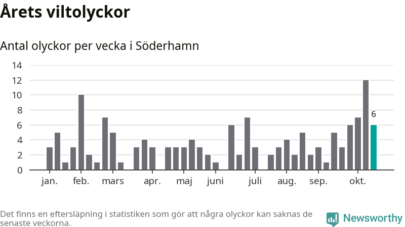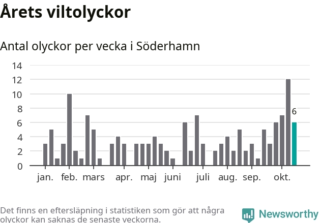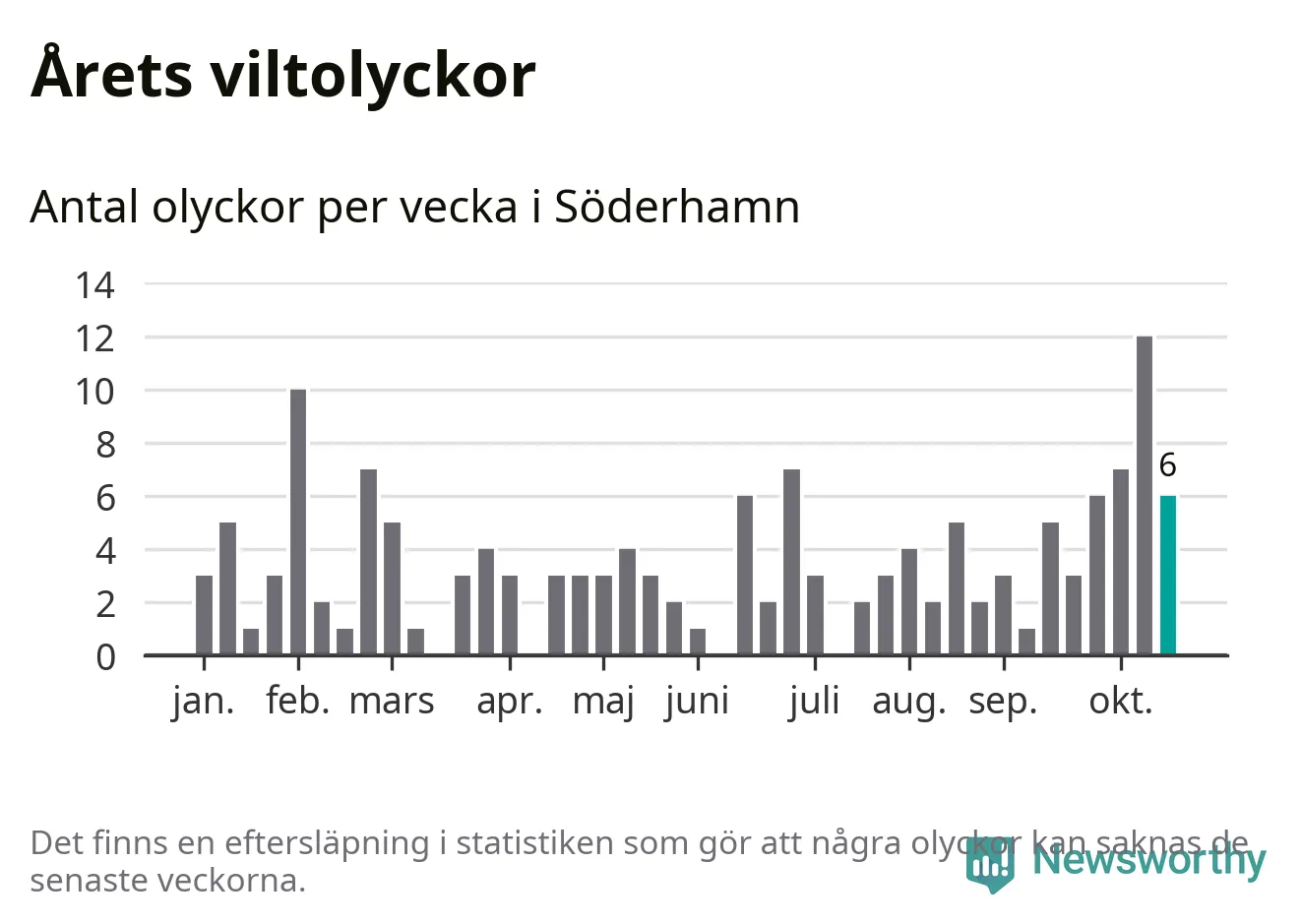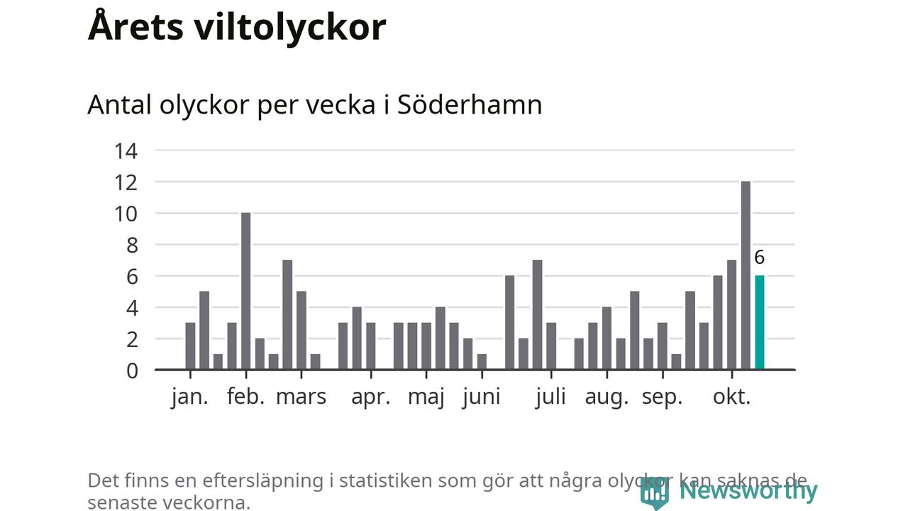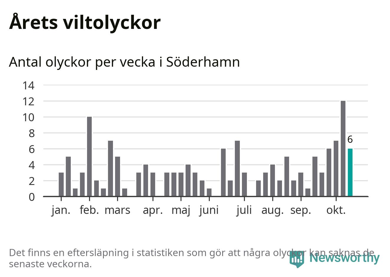 Hittills har sex viltolyckor rapporterats in i Söderhamns kommun från vecka 43. Se listan här.