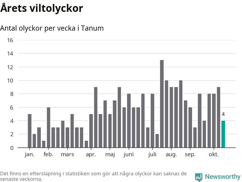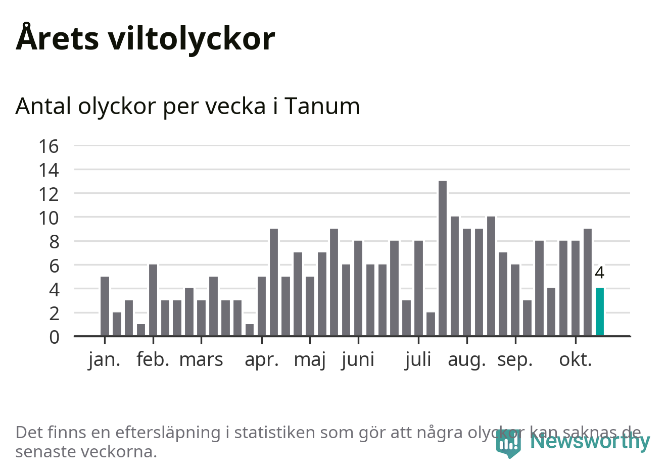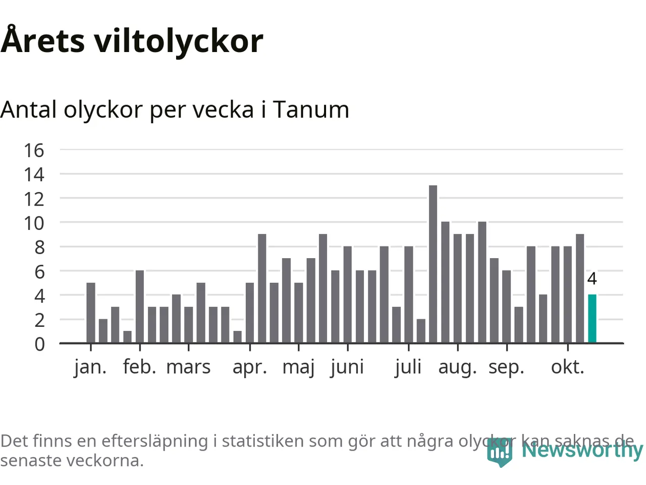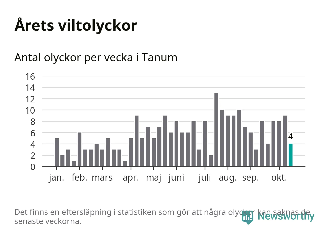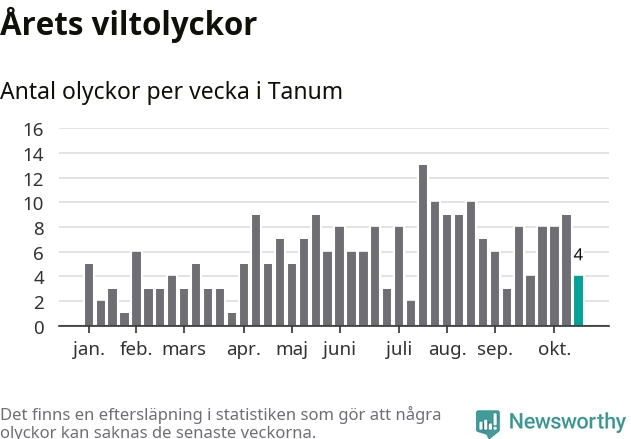Hittills har fyra viltolyckor rapporterats in i Tanums kommun från vecka 43. Se listan här.