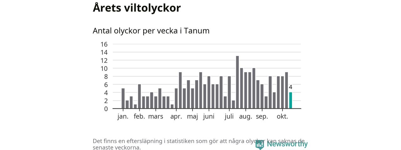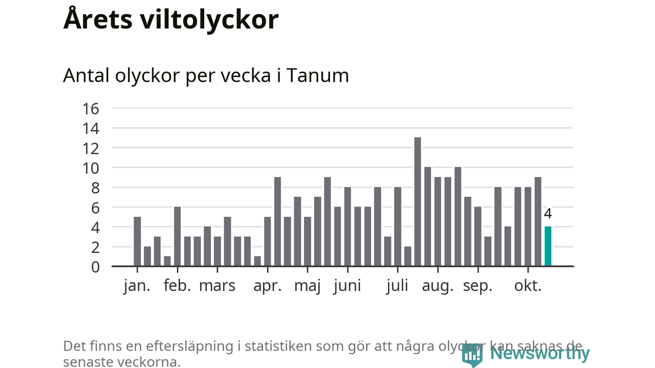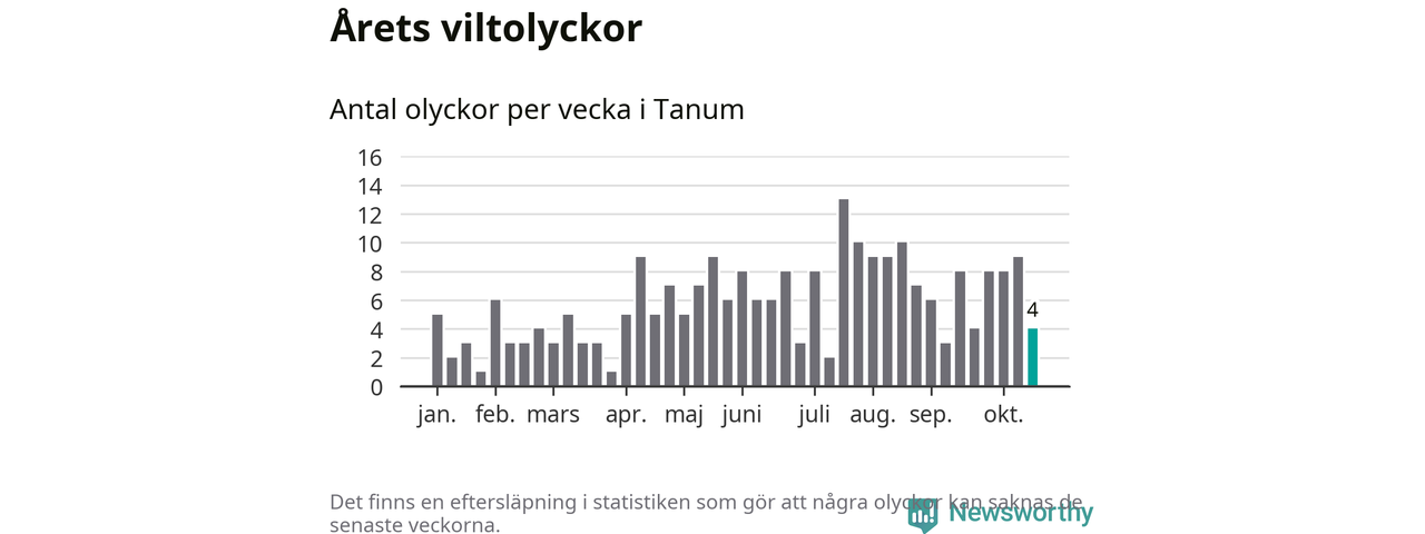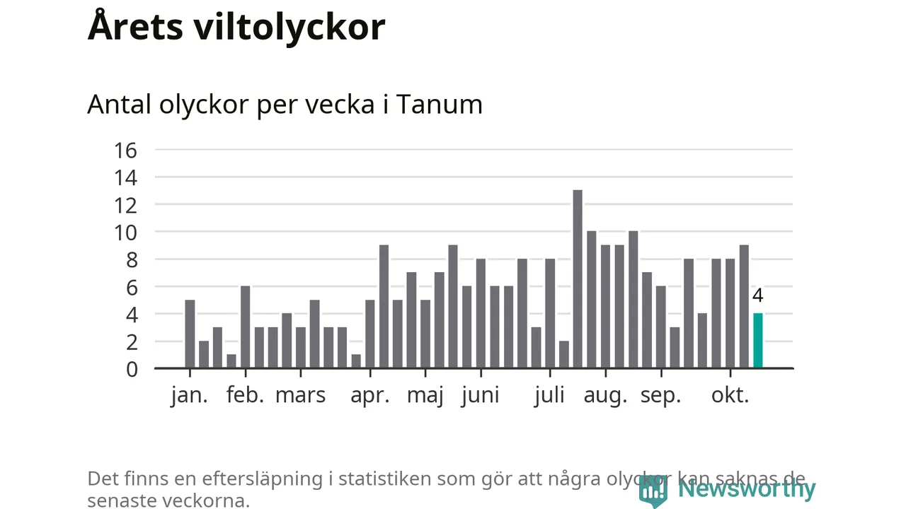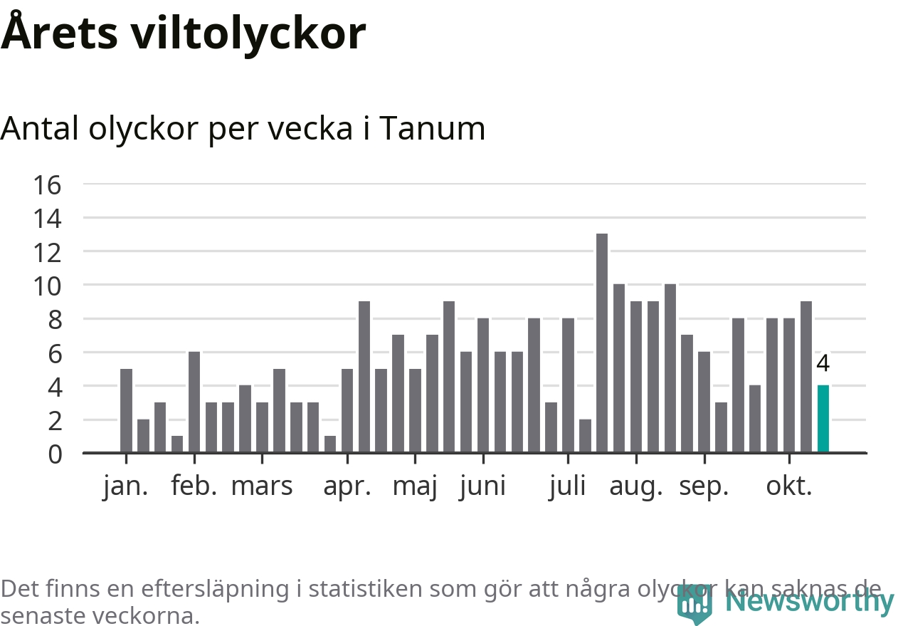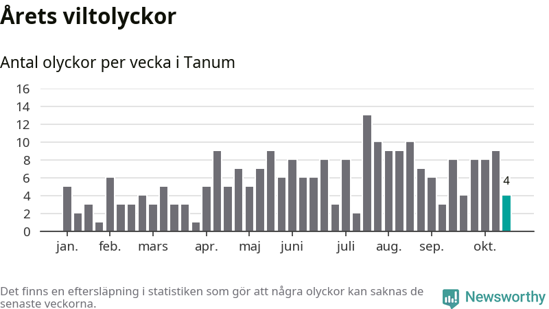 Hittills har fyra viltolyckor rapporterats in i Tanums kommun från vecka 43. Se listan här.
