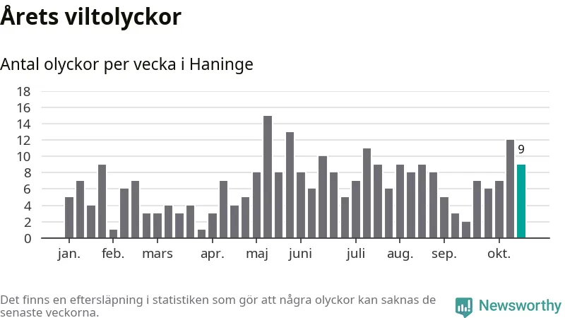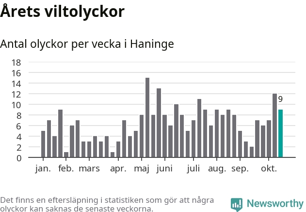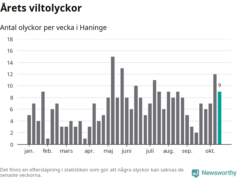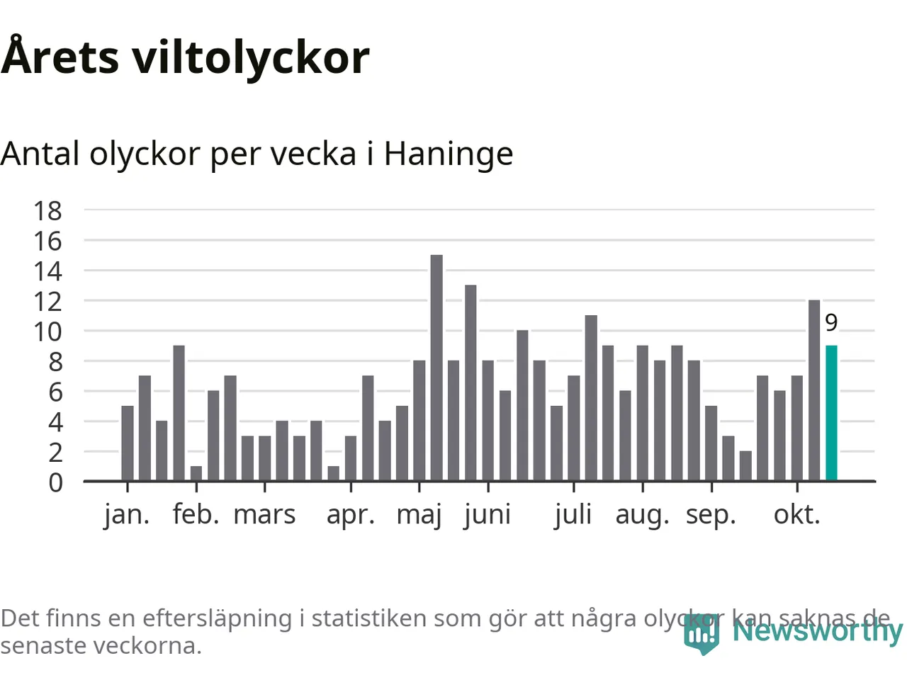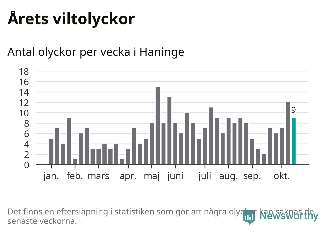 Hittills har nio viltolyckor rapporterats in i Haninge kommun från vecka 43. Se listan här.