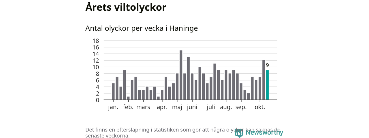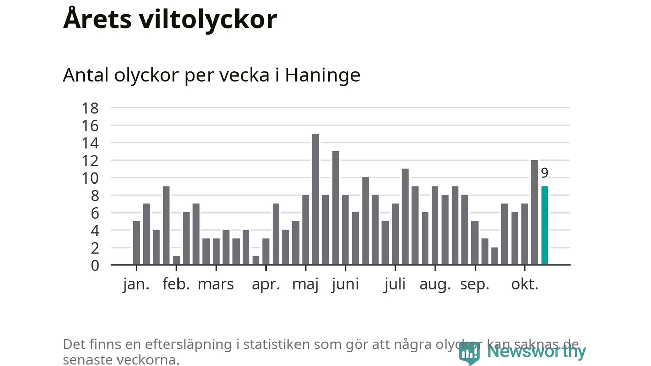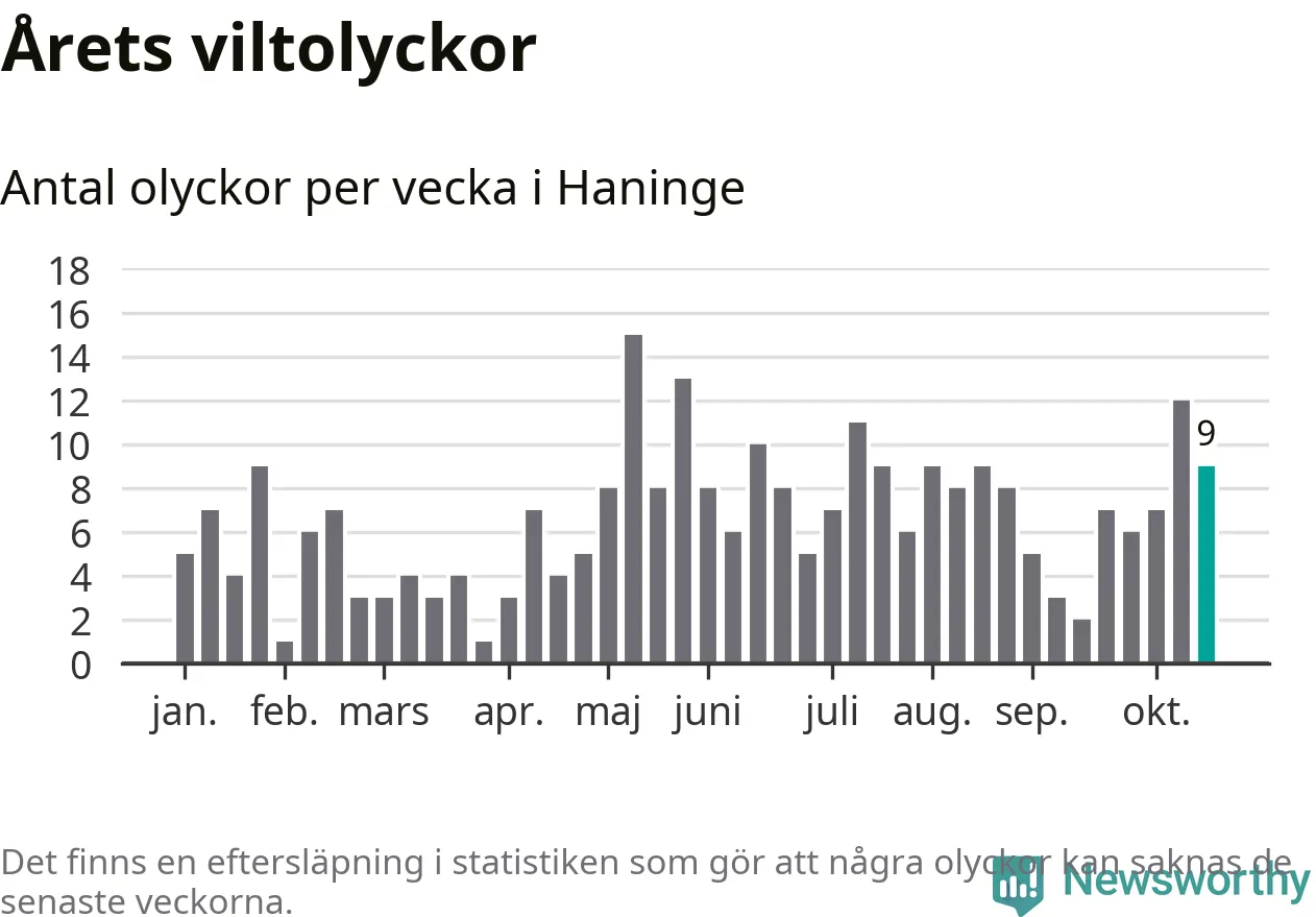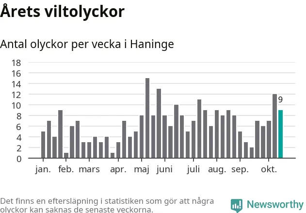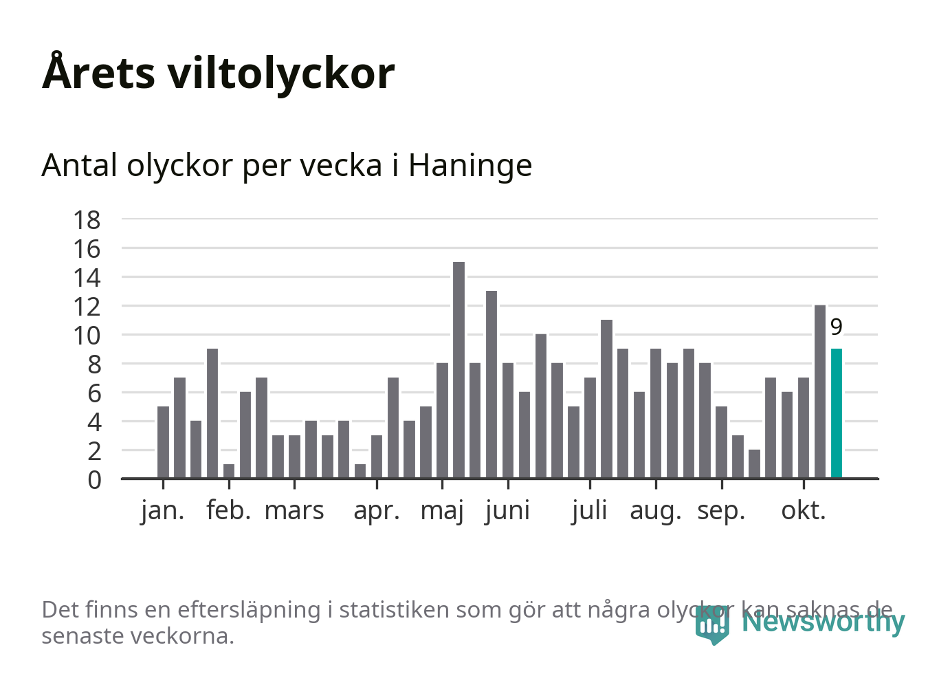 Hittills har nio viltolyckor rapporterats in i Haninge kommun från vecka 43. Se listan här.