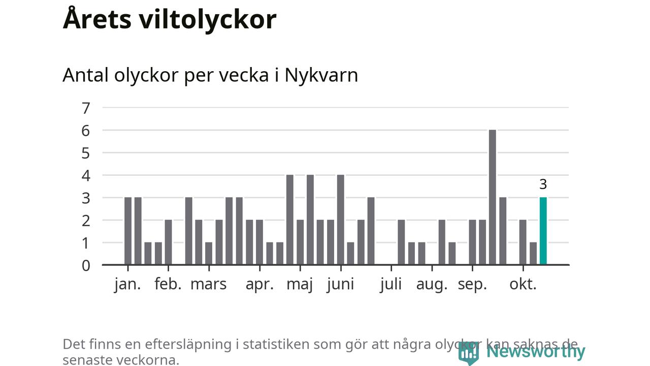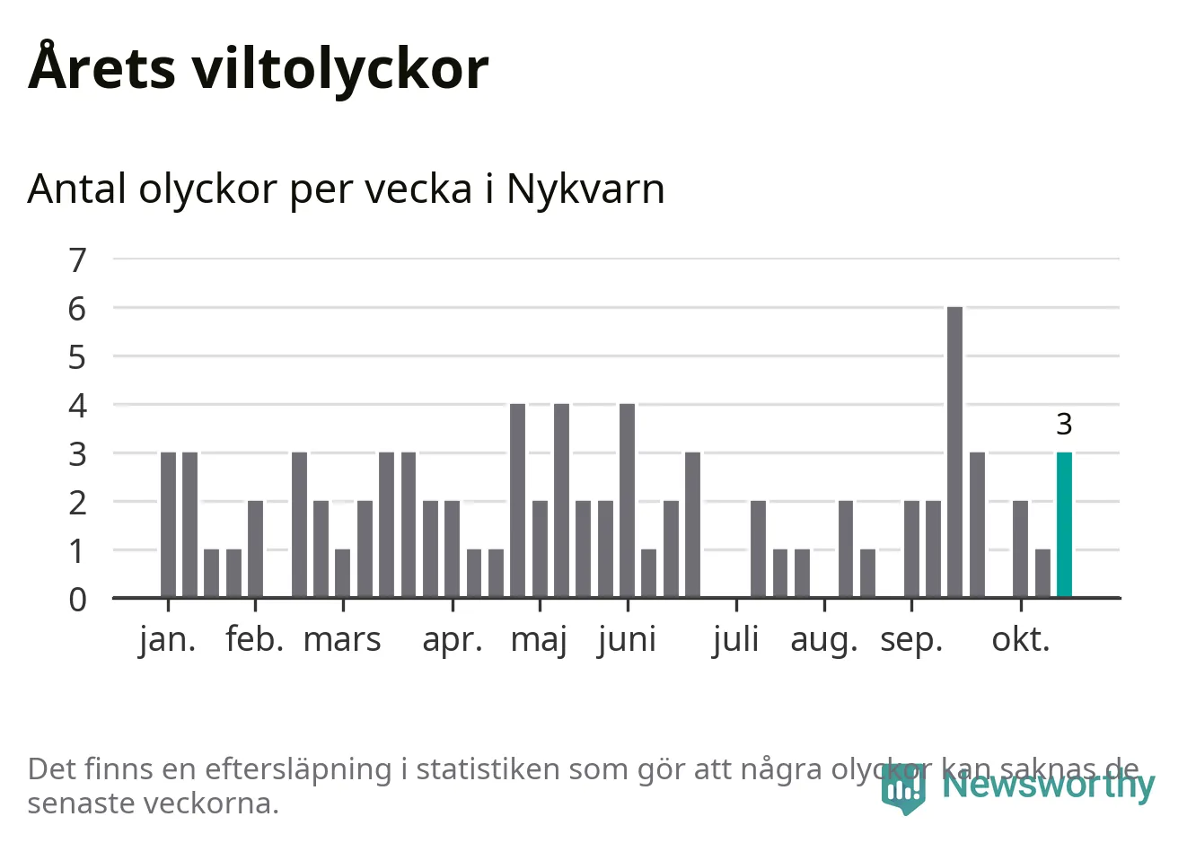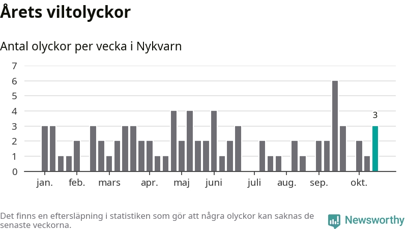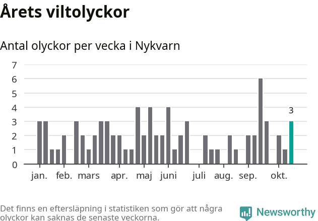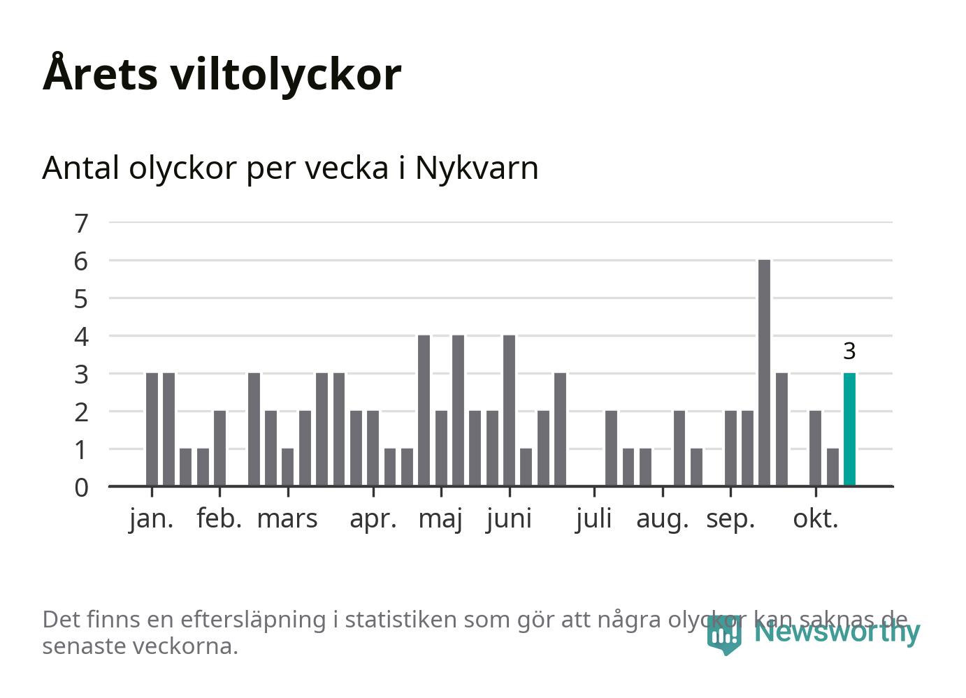 Hittills har tre viltolyckor rapporterats in i Nykvarns kommun från vecka 43. Se listan här.
