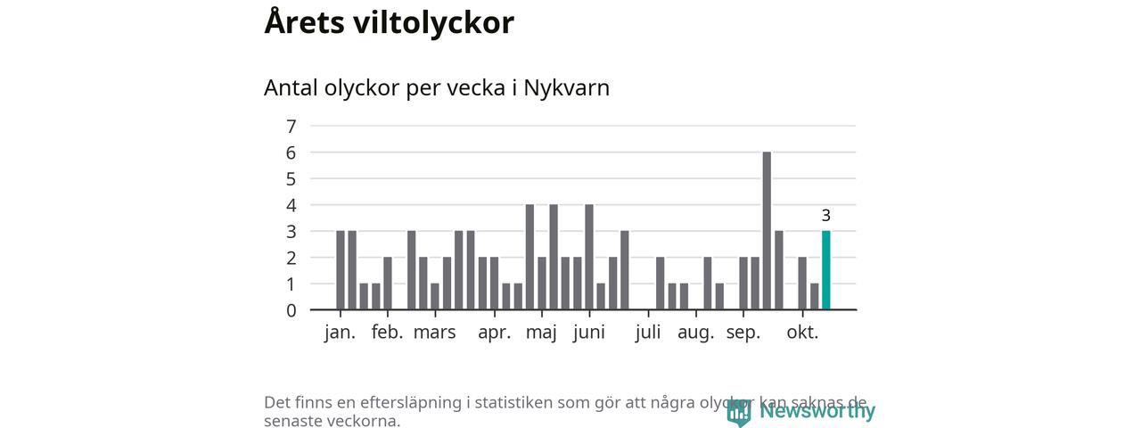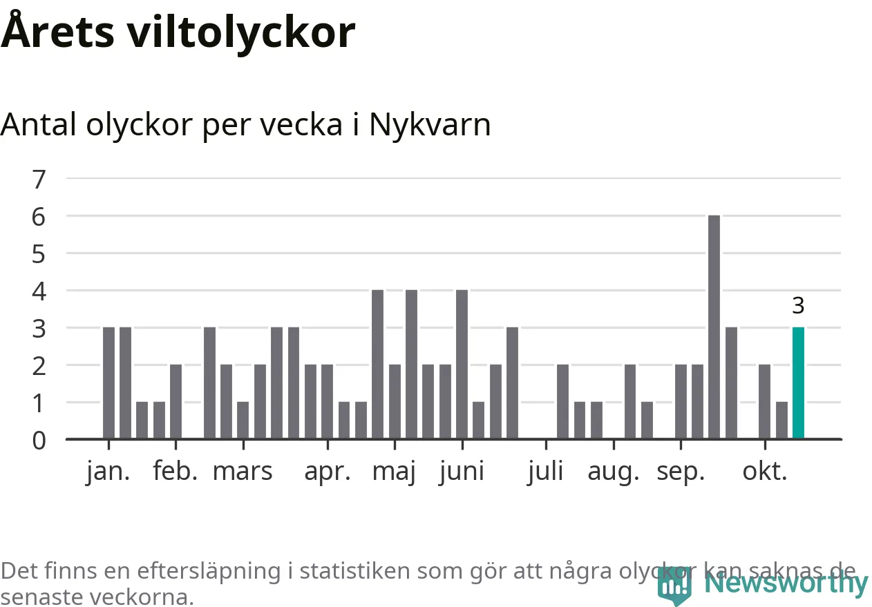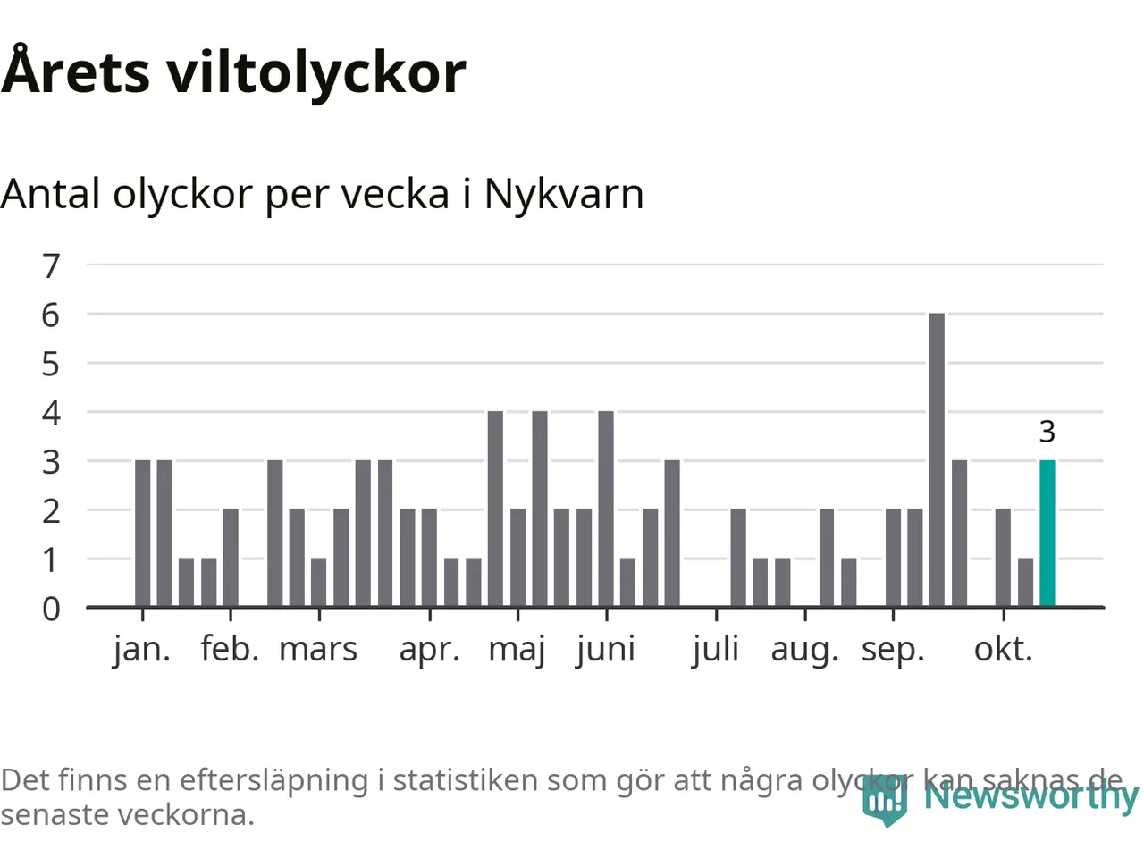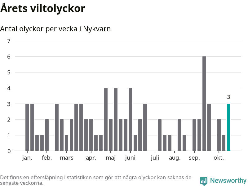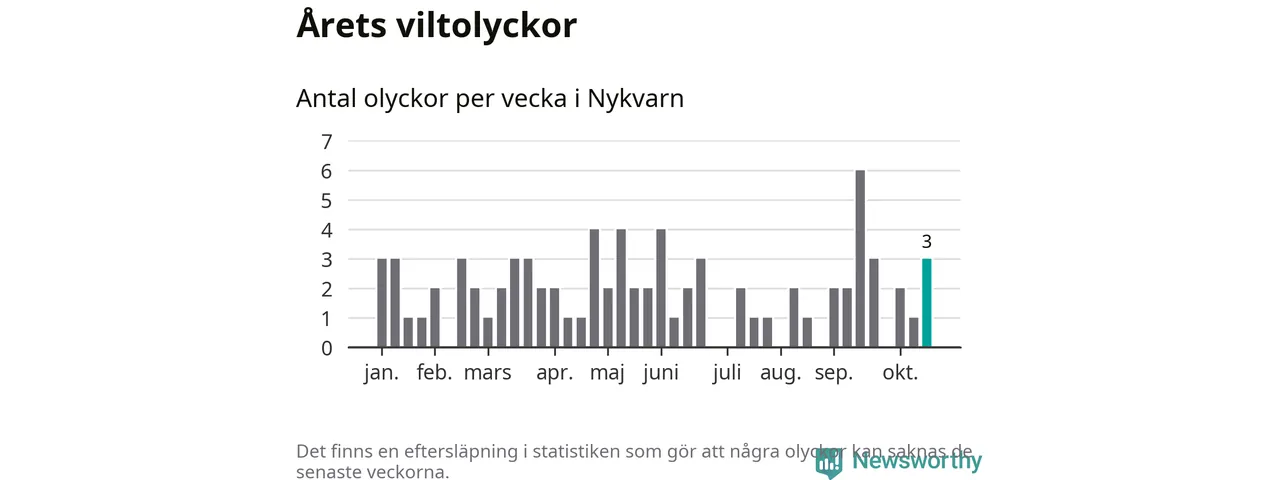 Hittills har tre viltolyckor rapporterats in i Nykvarns kommun från vecka 43. Se listan här.