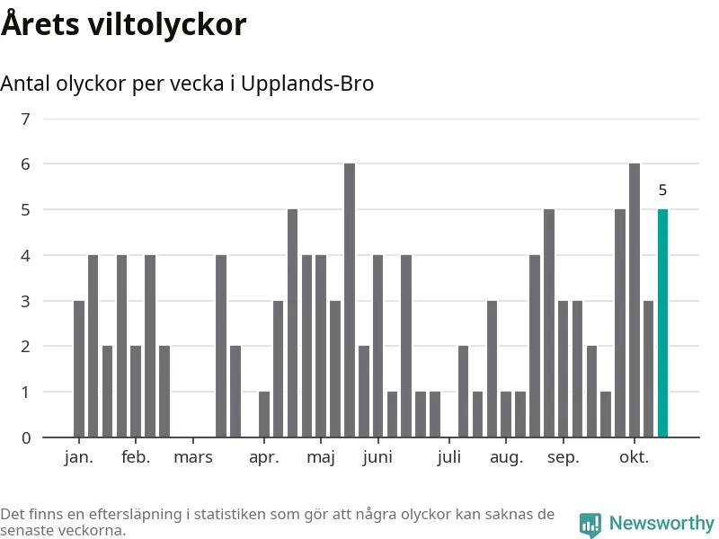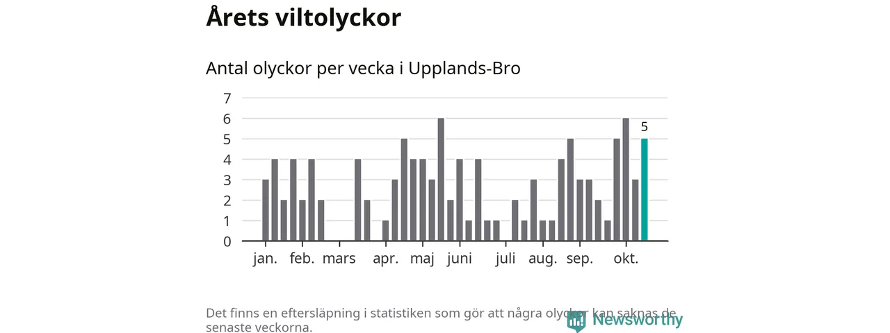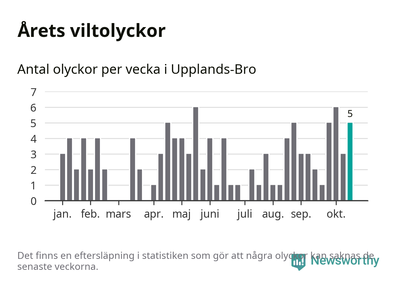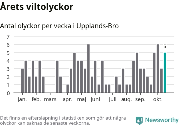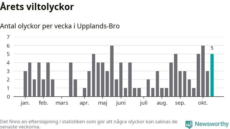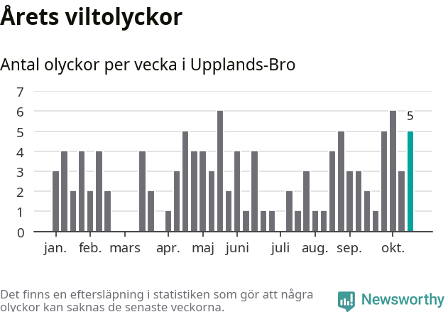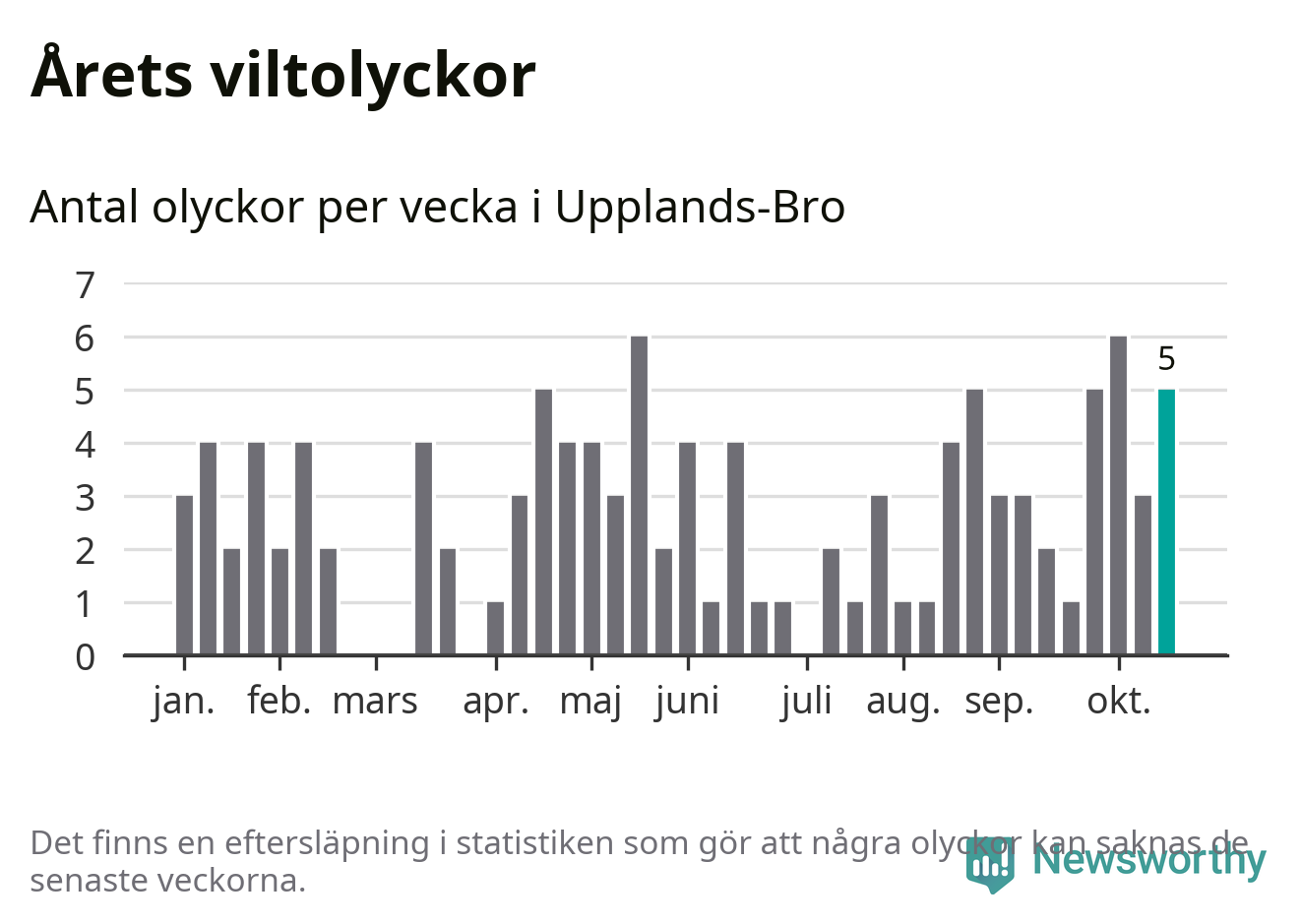 Hittills har fem viltolyckor rapporterats in i Upplands-Bro kommun från vecka 43. Se listan här.