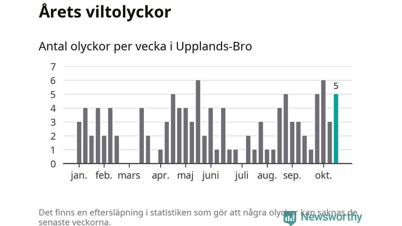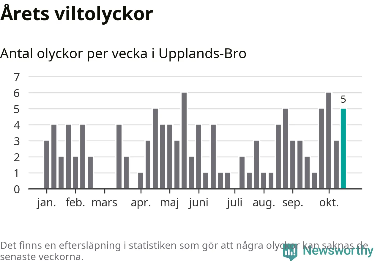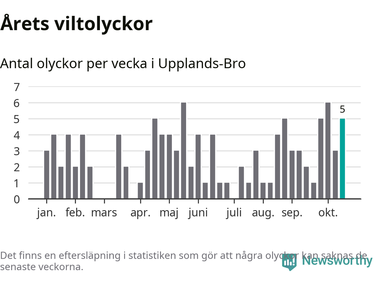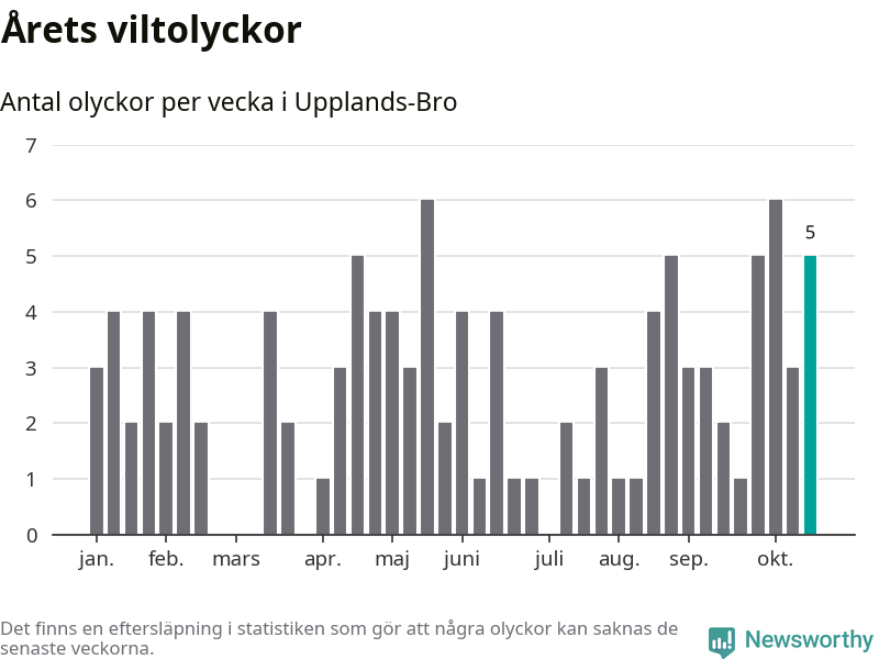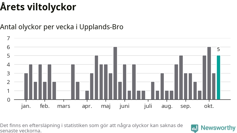 Hittills har fem viltolyckor rapporterats in i Upplands-Bro kommun från vecka 43. Se listan här.