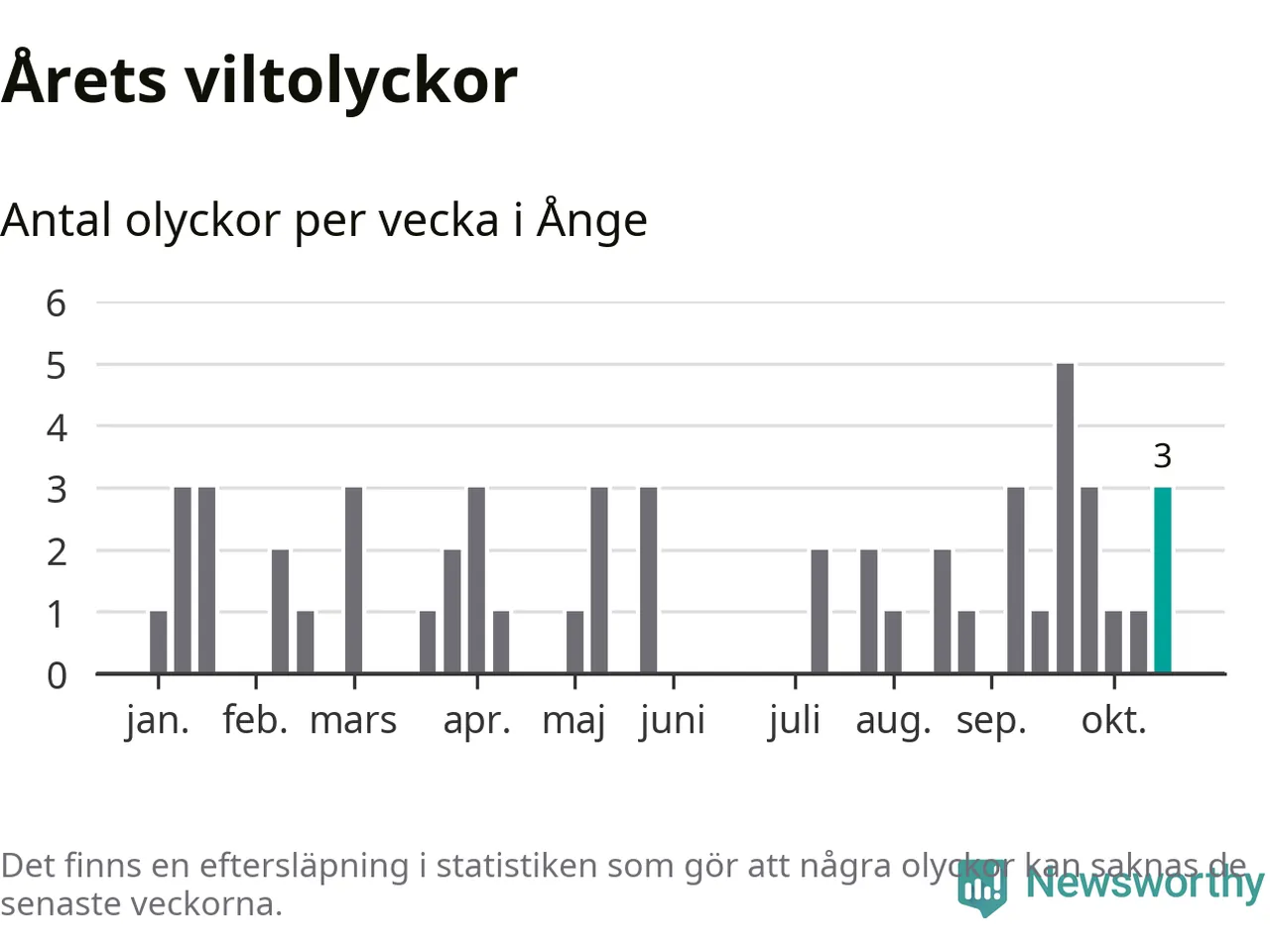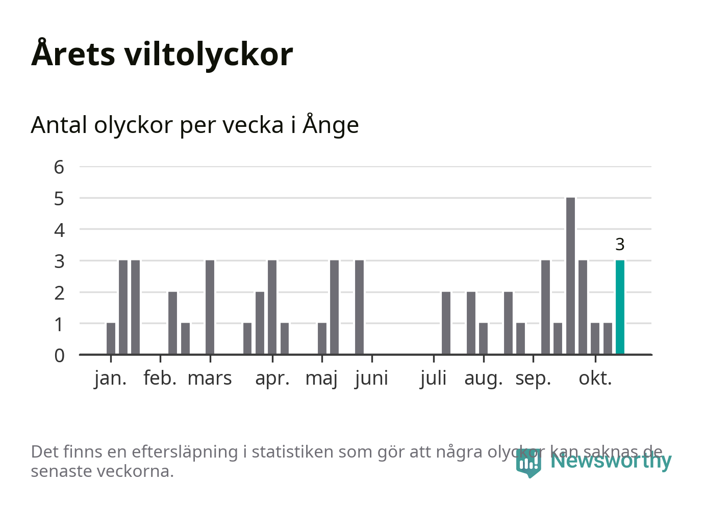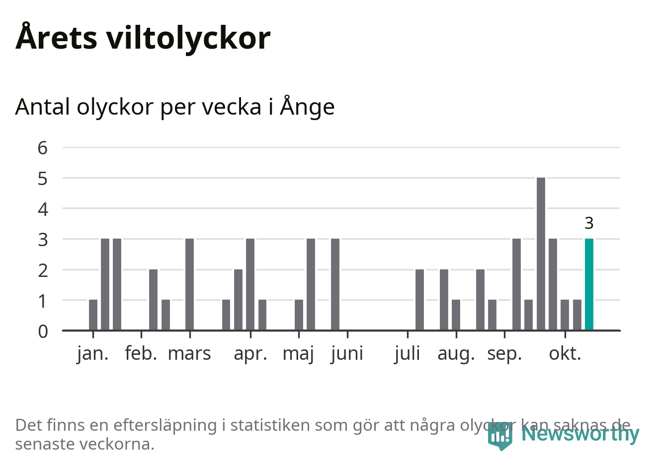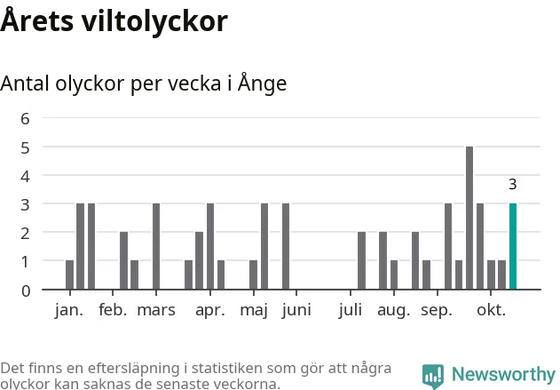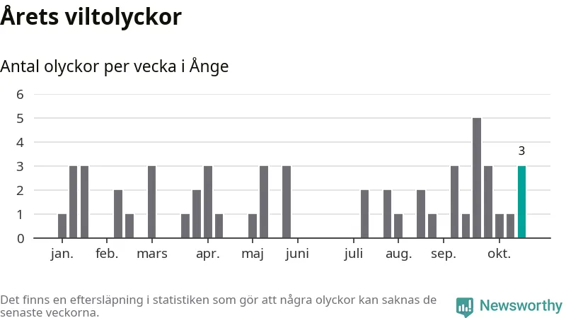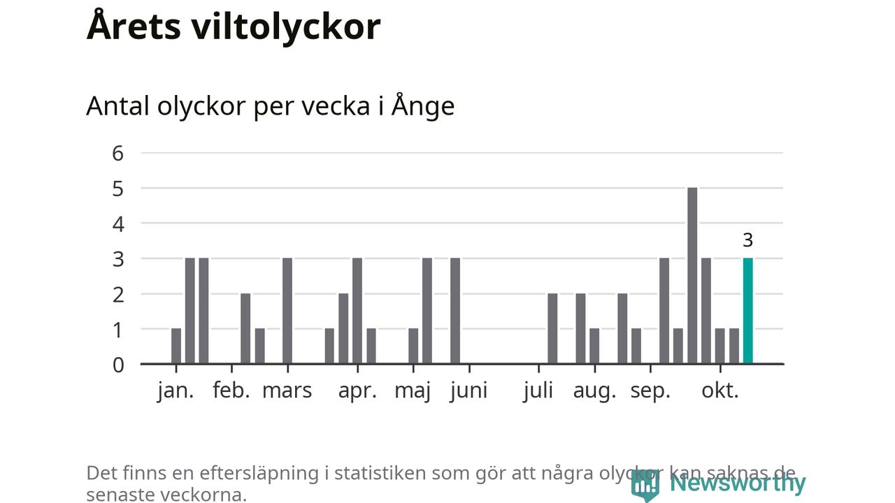 Hittills har tre viltolyckor rapporterats in i Ånge kommun från vecka 43. Se listan här.