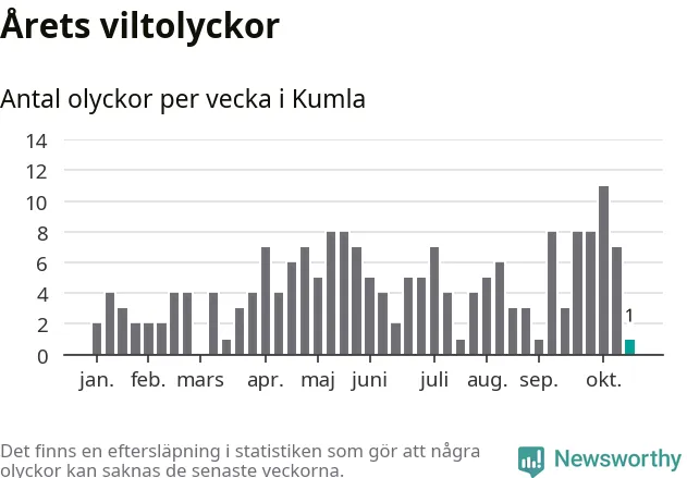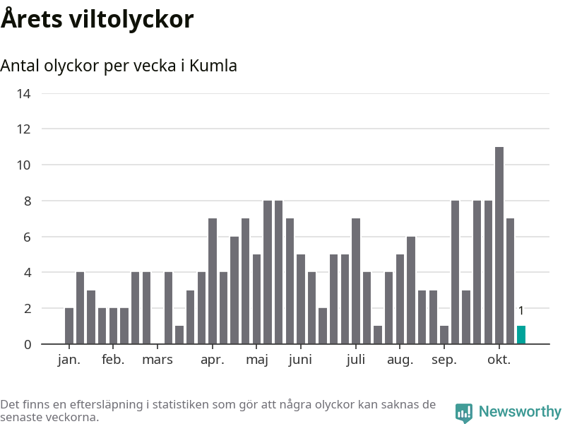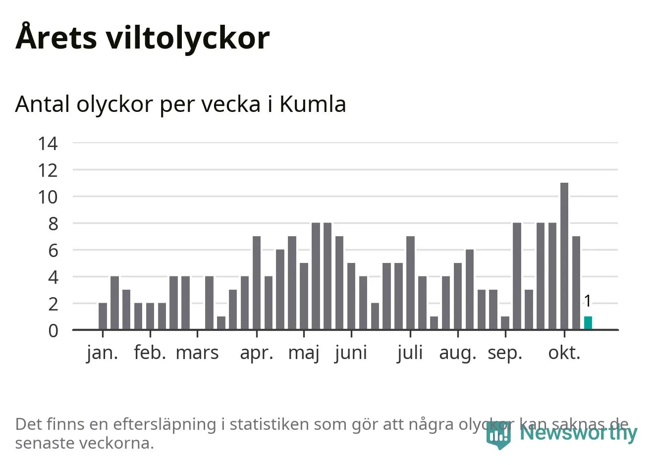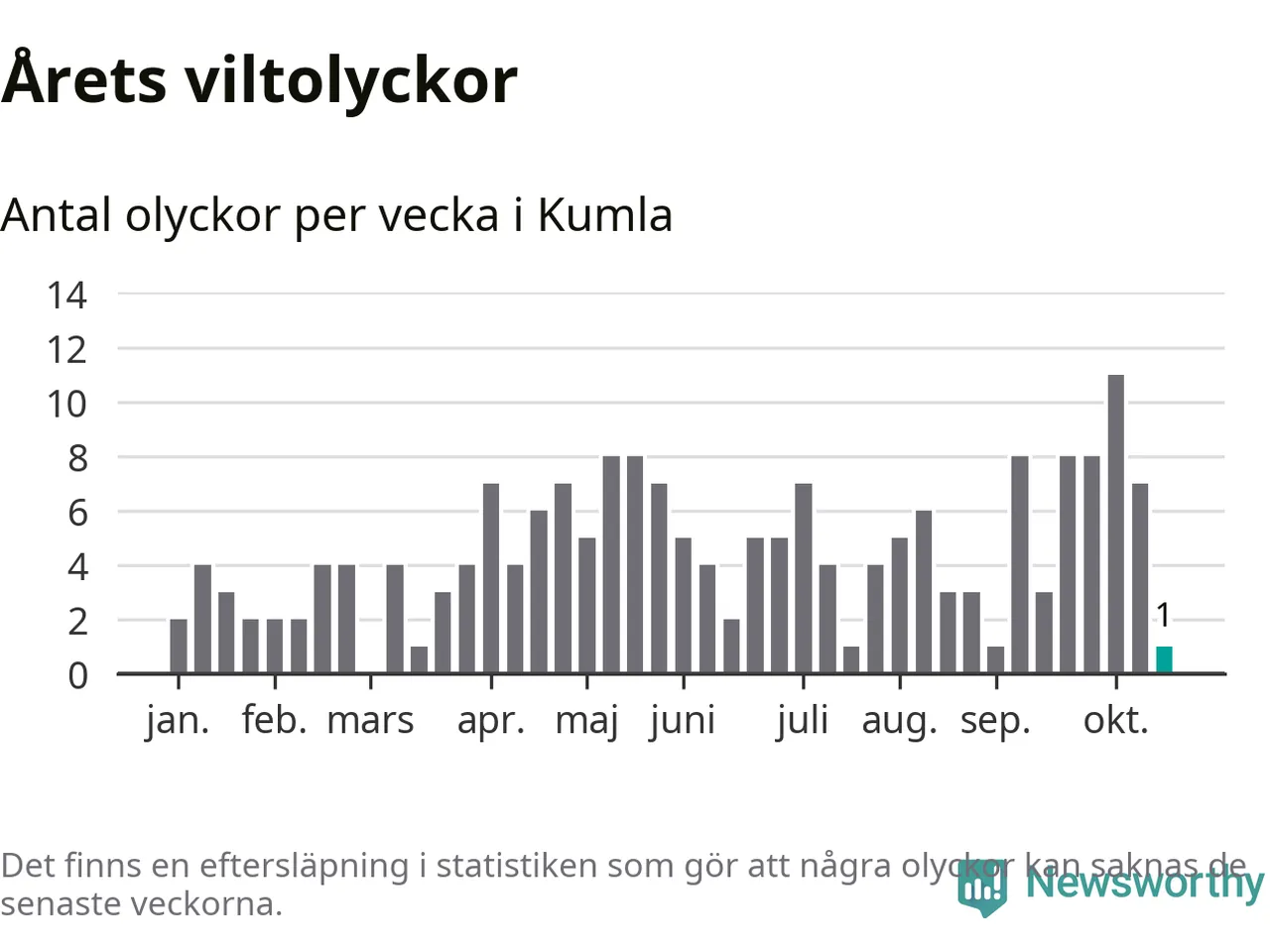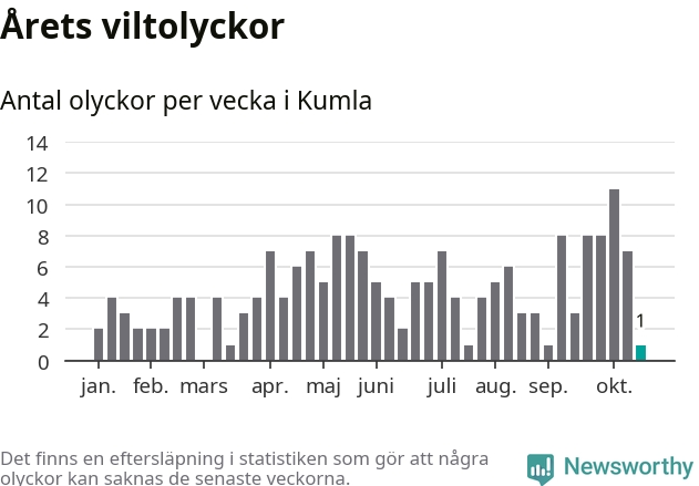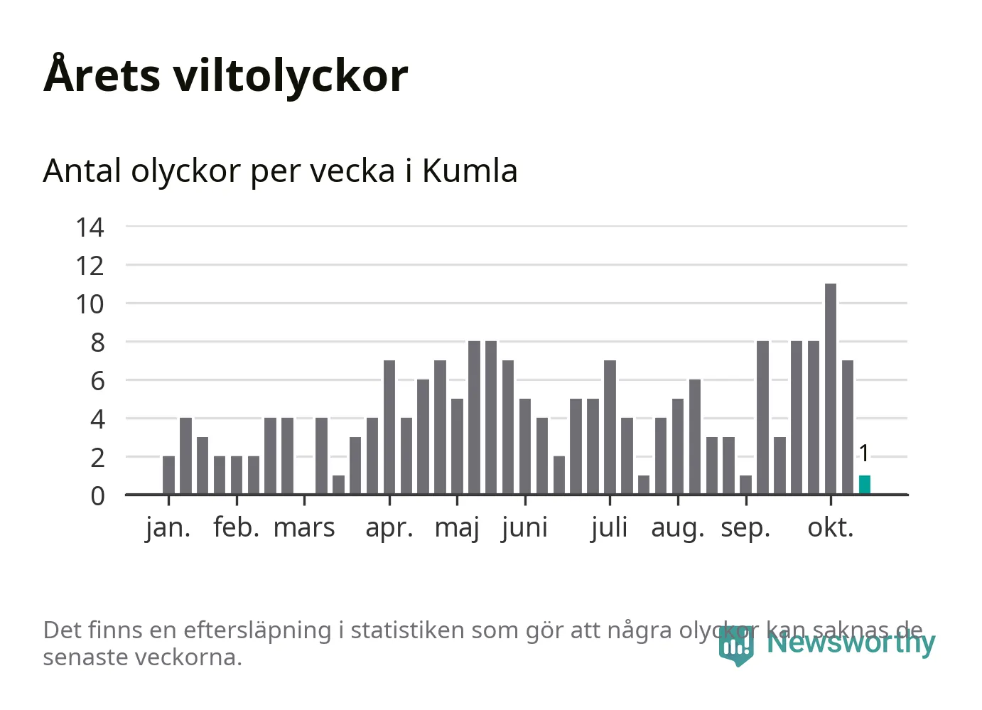 Från förra veckan (vecka 43) har hittills en viltolycka rapporterats in i Kumla kommun.
