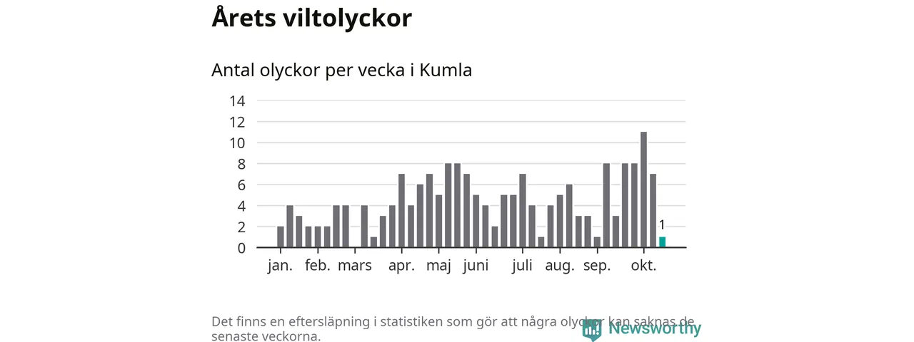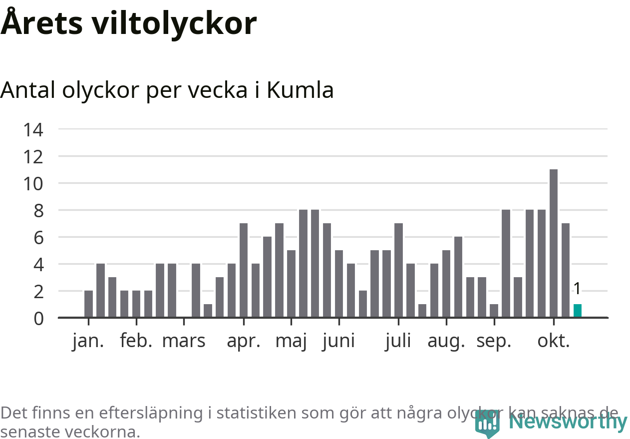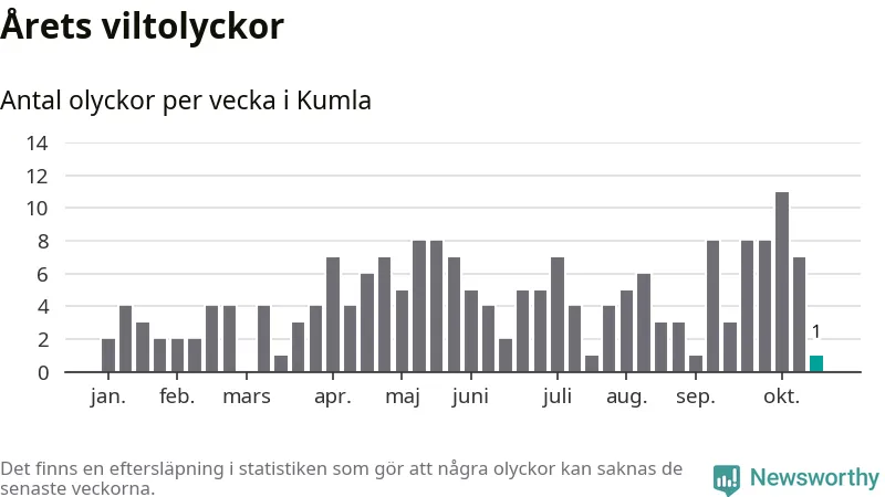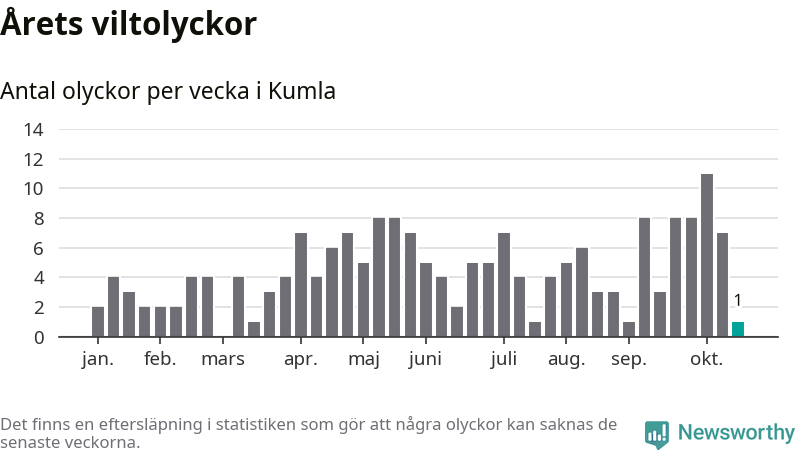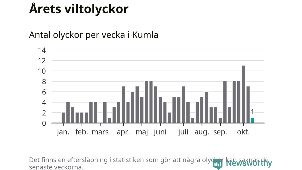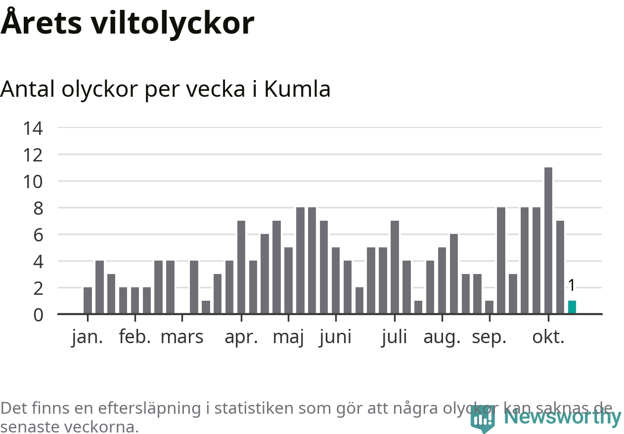 Från förra veckan (vecka 43) har hittills en viltolycka rapporterats in i Kumla kommun.