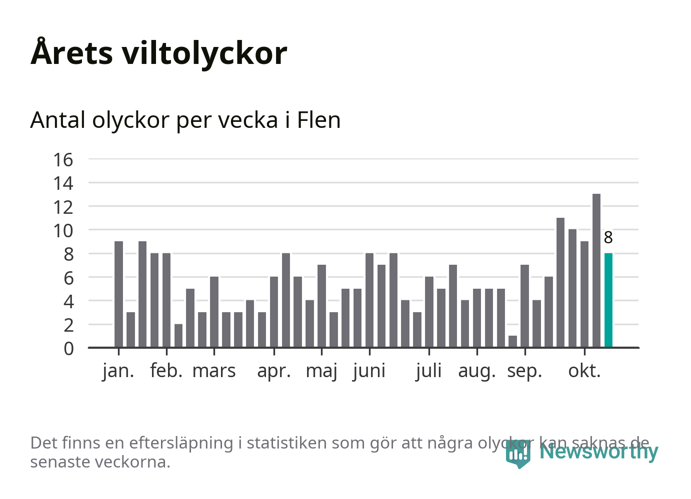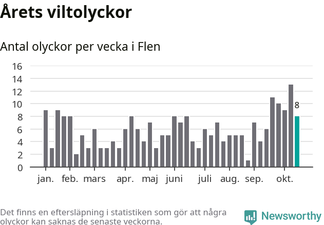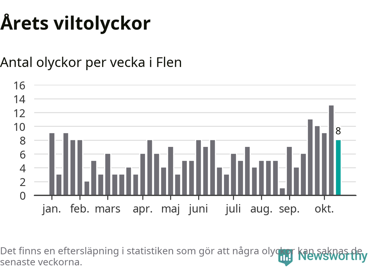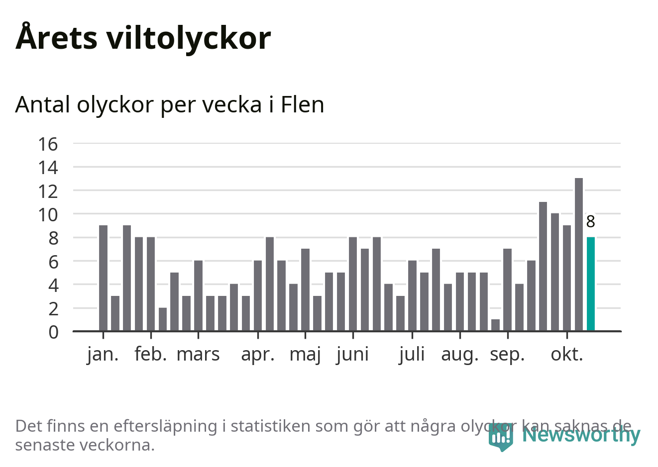 Hittills har åtta viltolyckor rapporterats in i Flens kommun från vecka 43. Se listan här.