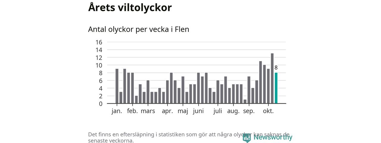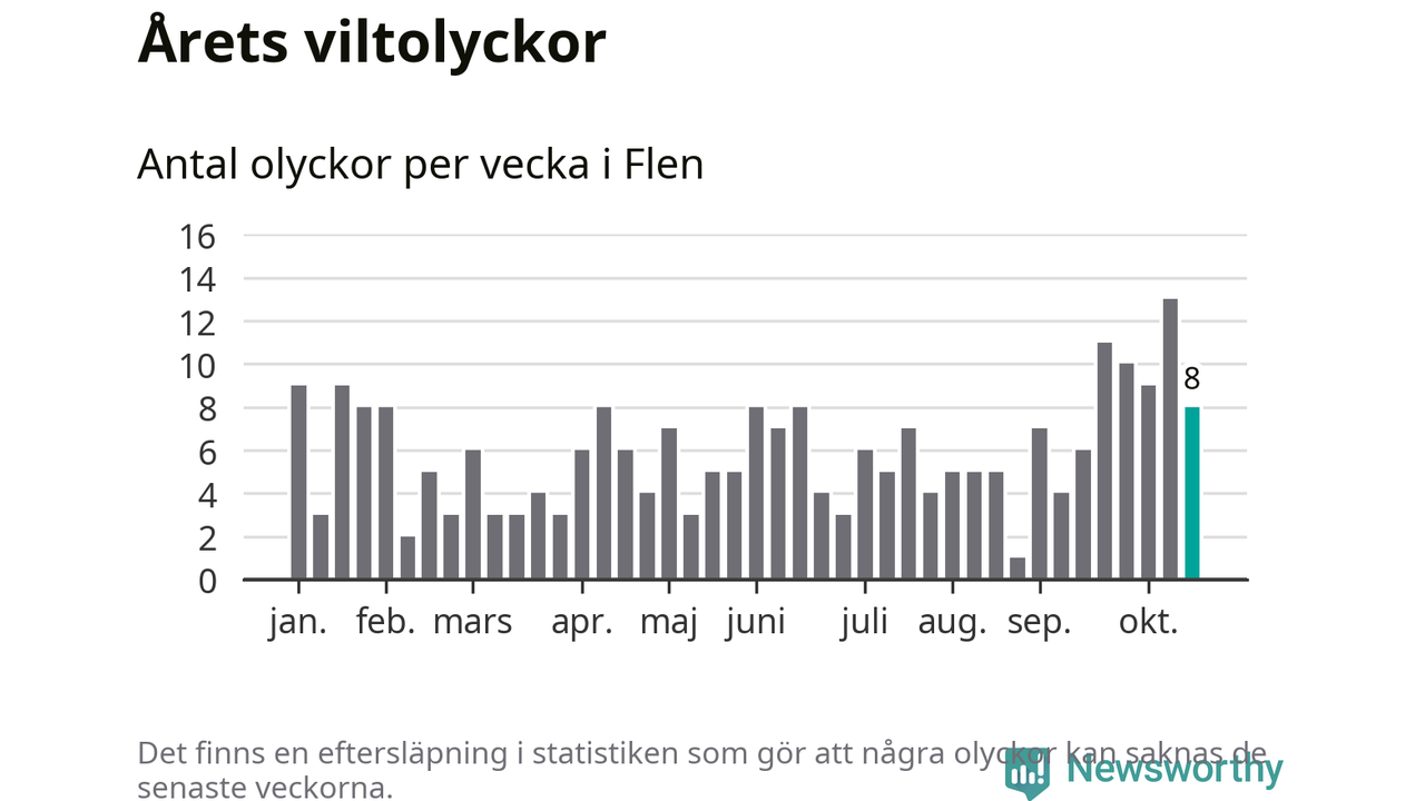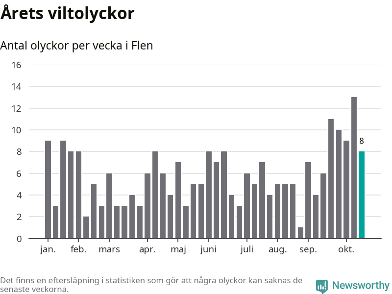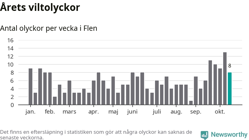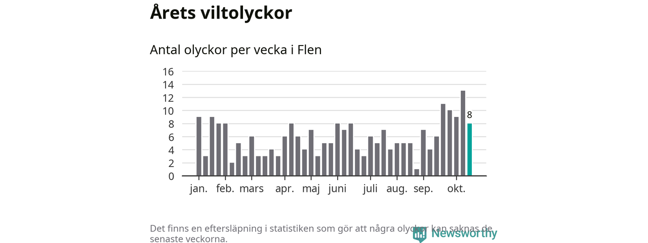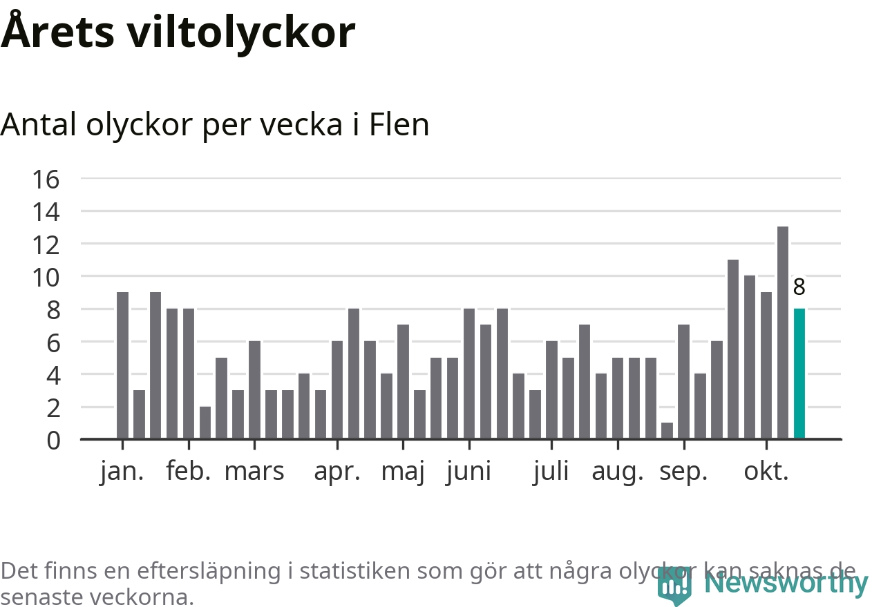 Hittills har åtta viltolyckor rapporterats in i Flens kommun från vecka 43. Se listan här.