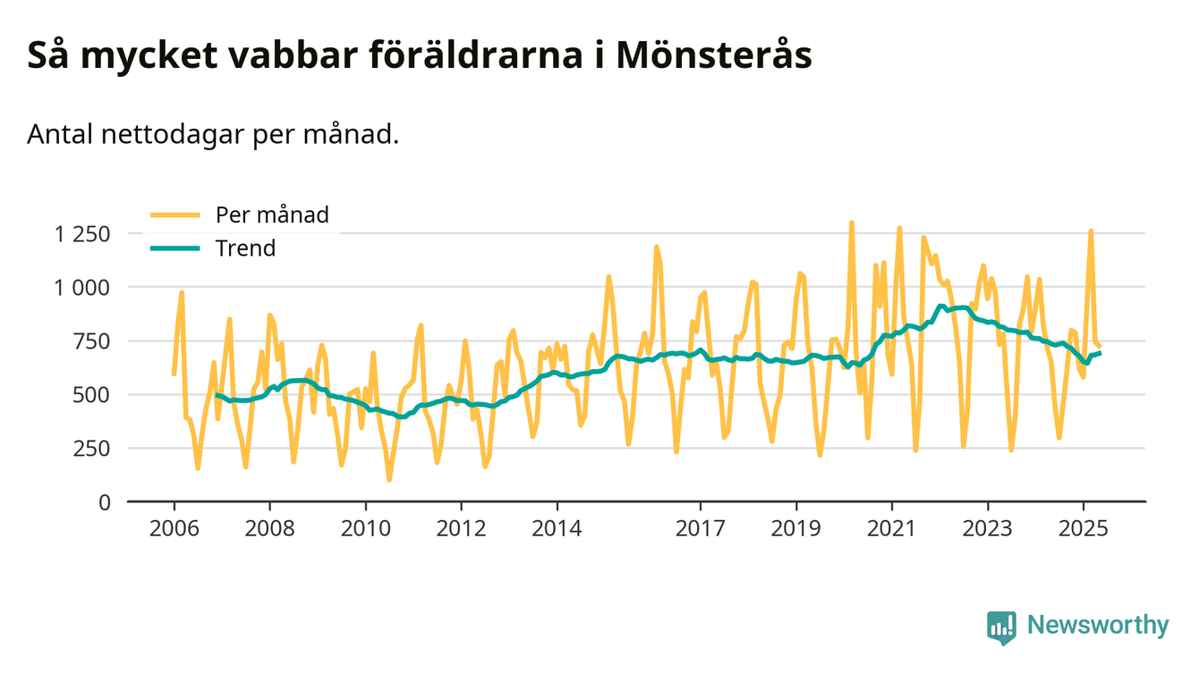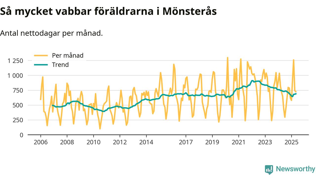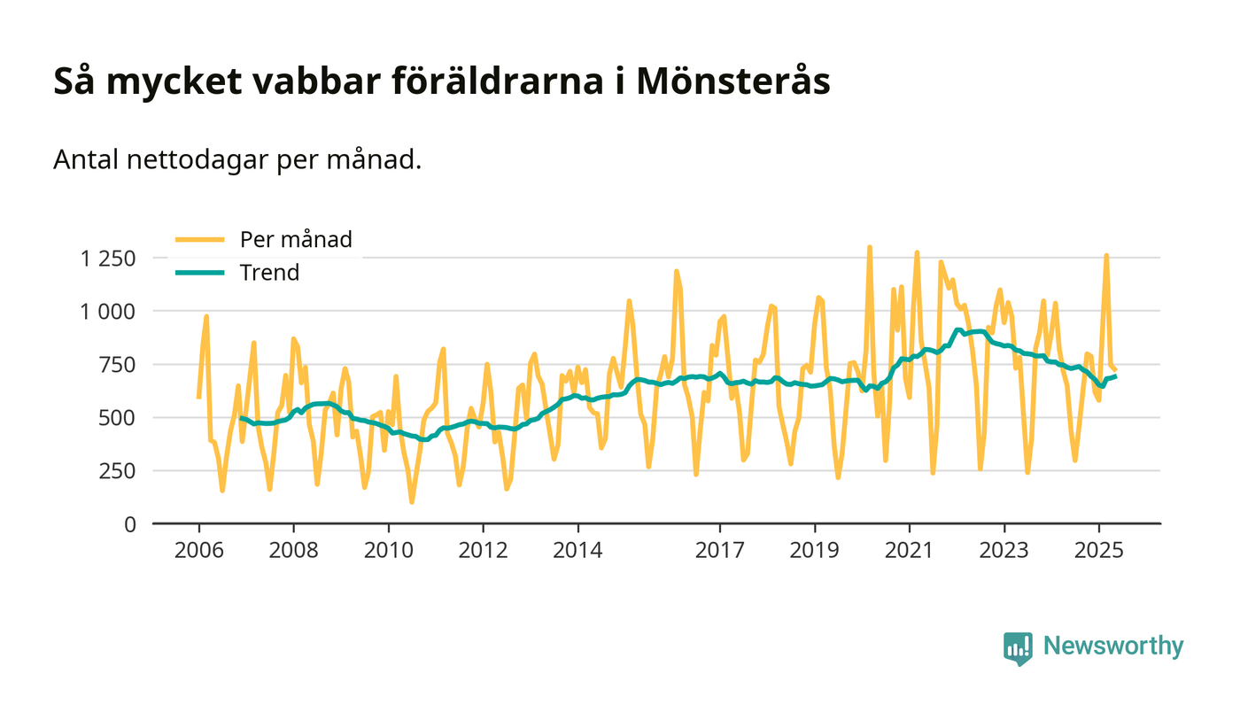 När coronapandemin drog in i mars 2020 peakade antalet vabbdagar både i Mönsterås kommun och i riket som helhet. Under de senaste två åren har vabbuttaget börjat minska igen.