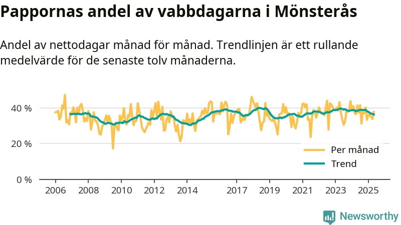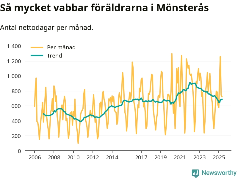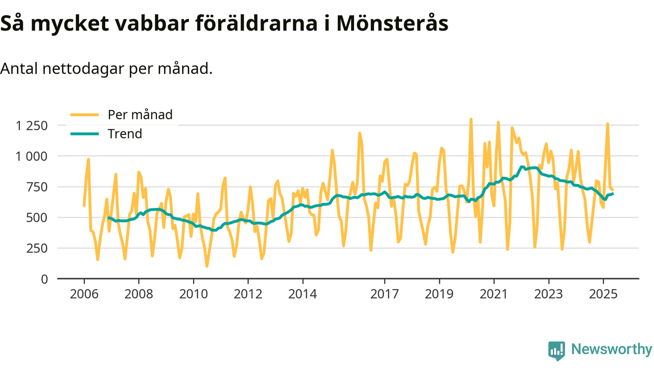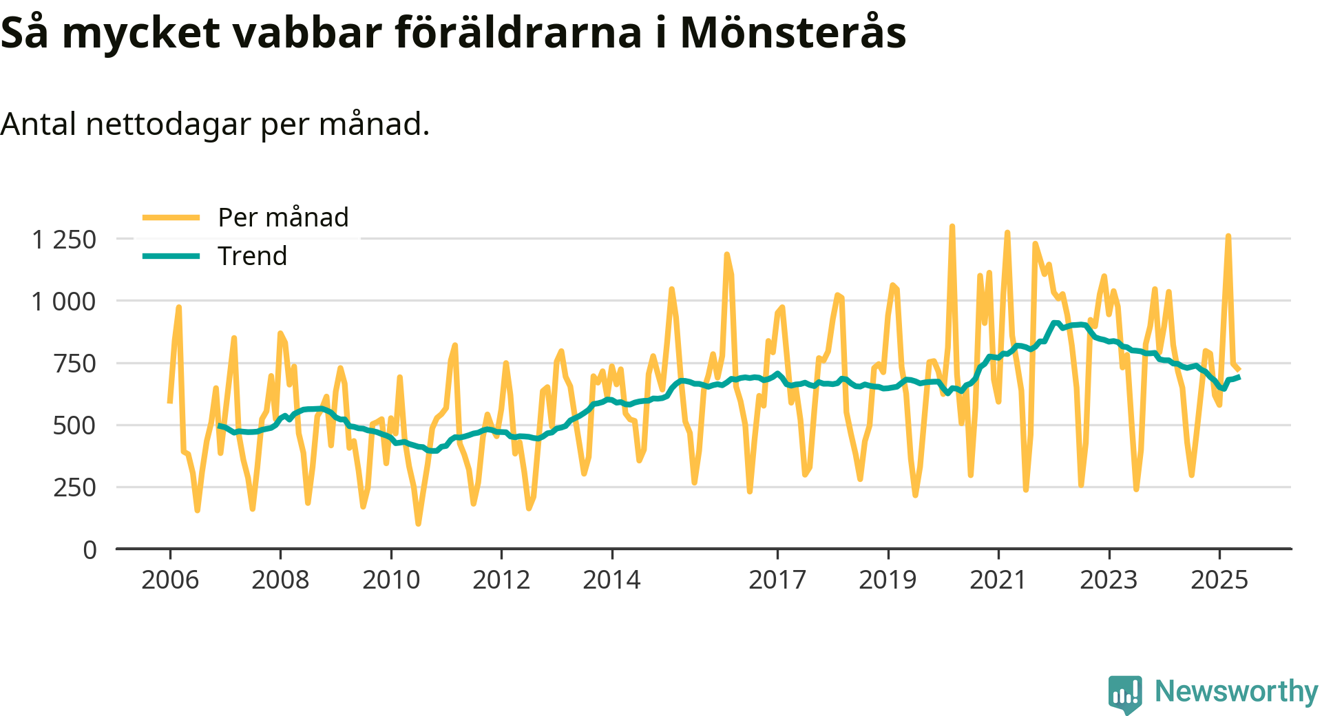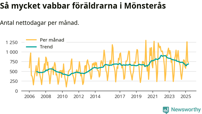 När coronapandemin drog in i mars 2020 peakade antalet vabbdagar både i Mönsterås kommun och i riket som helhet. Under de senaste två åren har vabbuttaget börjat minska igen.