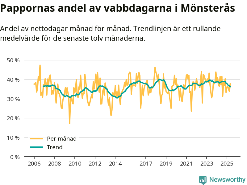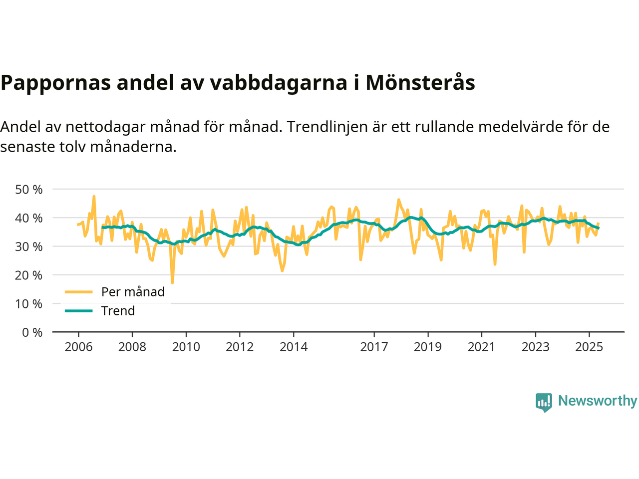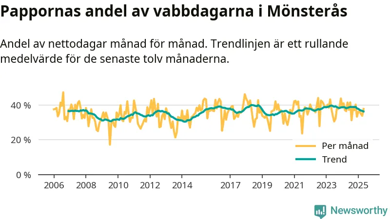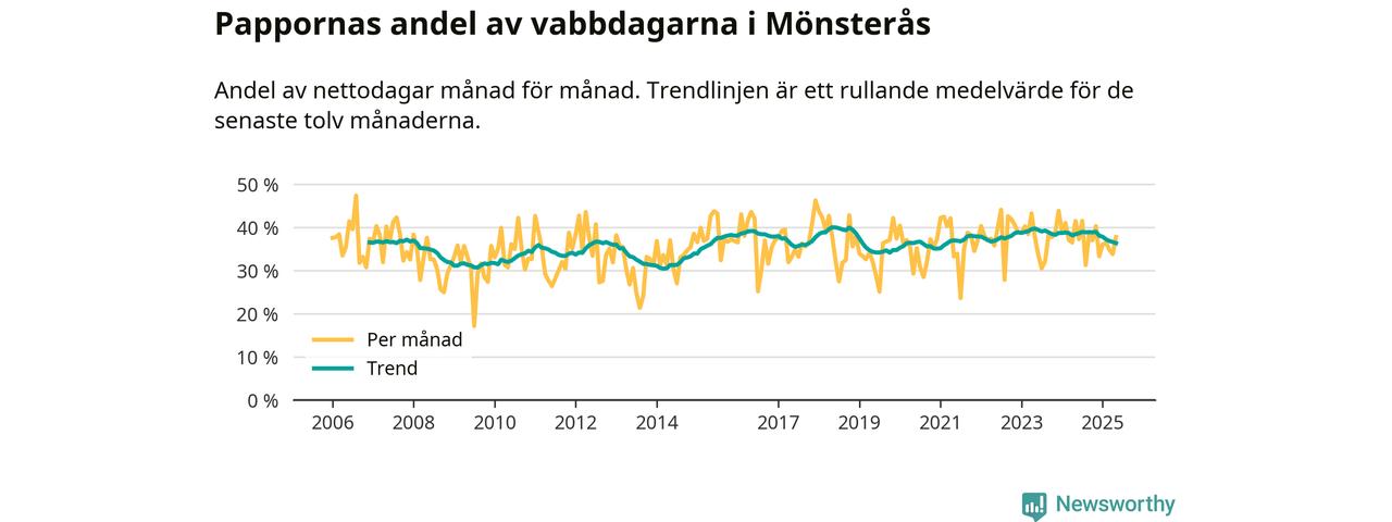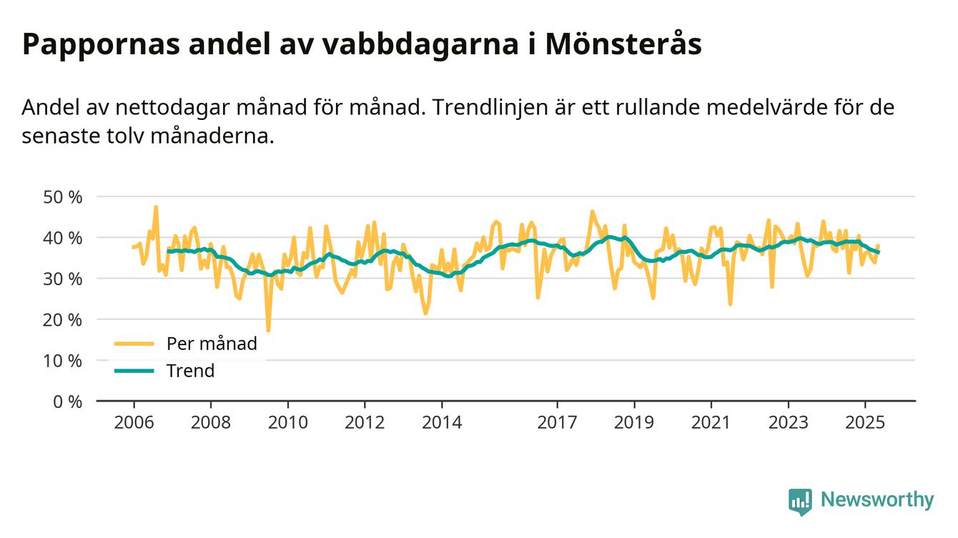 Mönsterås ligger en bit från ett jämställt uttag. Under de senaste tolv månaderna har männen stått för 36 procent av all vabb i kommunen. Det är en lägre andel än på över fyra år.