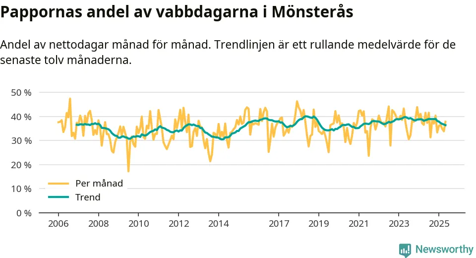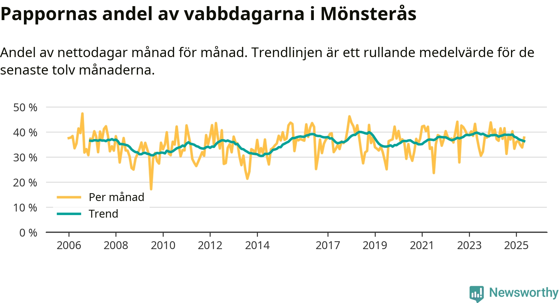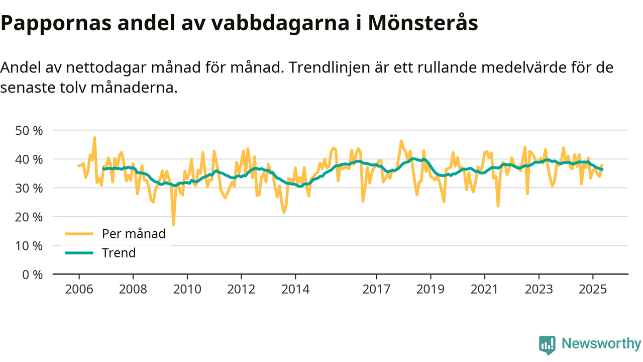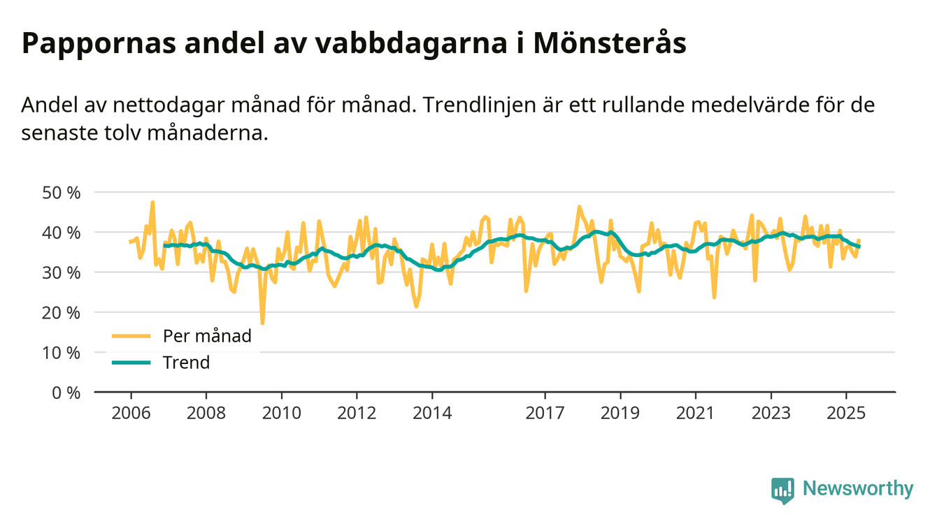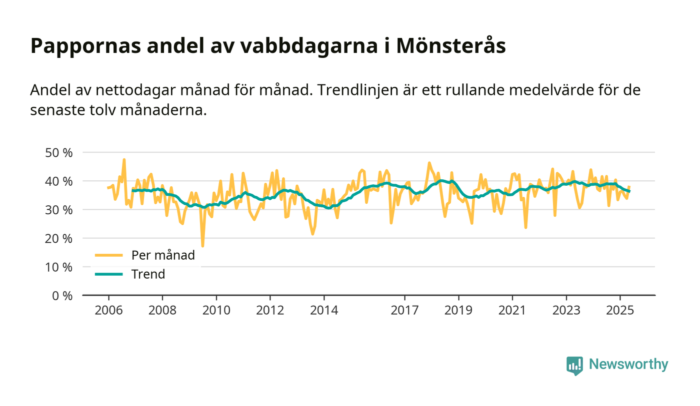 Mönsterås ligger en bit från ett jämställt uttag. Under de senaste tolv månaderna har männen stått för 36 procent av all vabb i kommunen. Det är en lägre andel än på över fyra år.