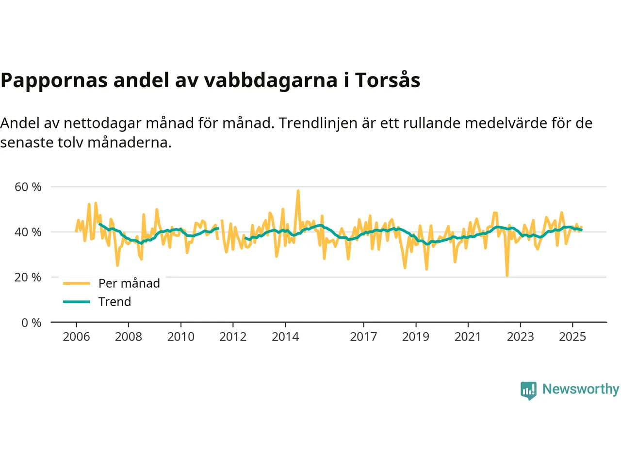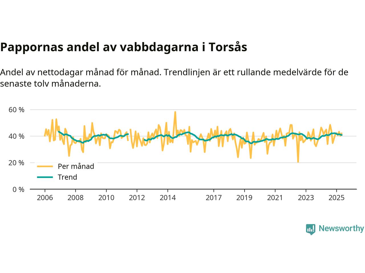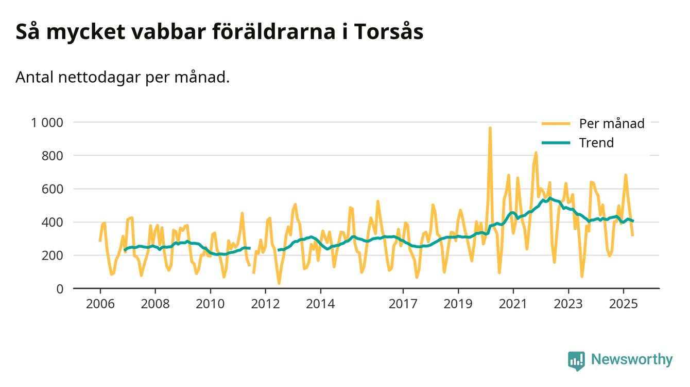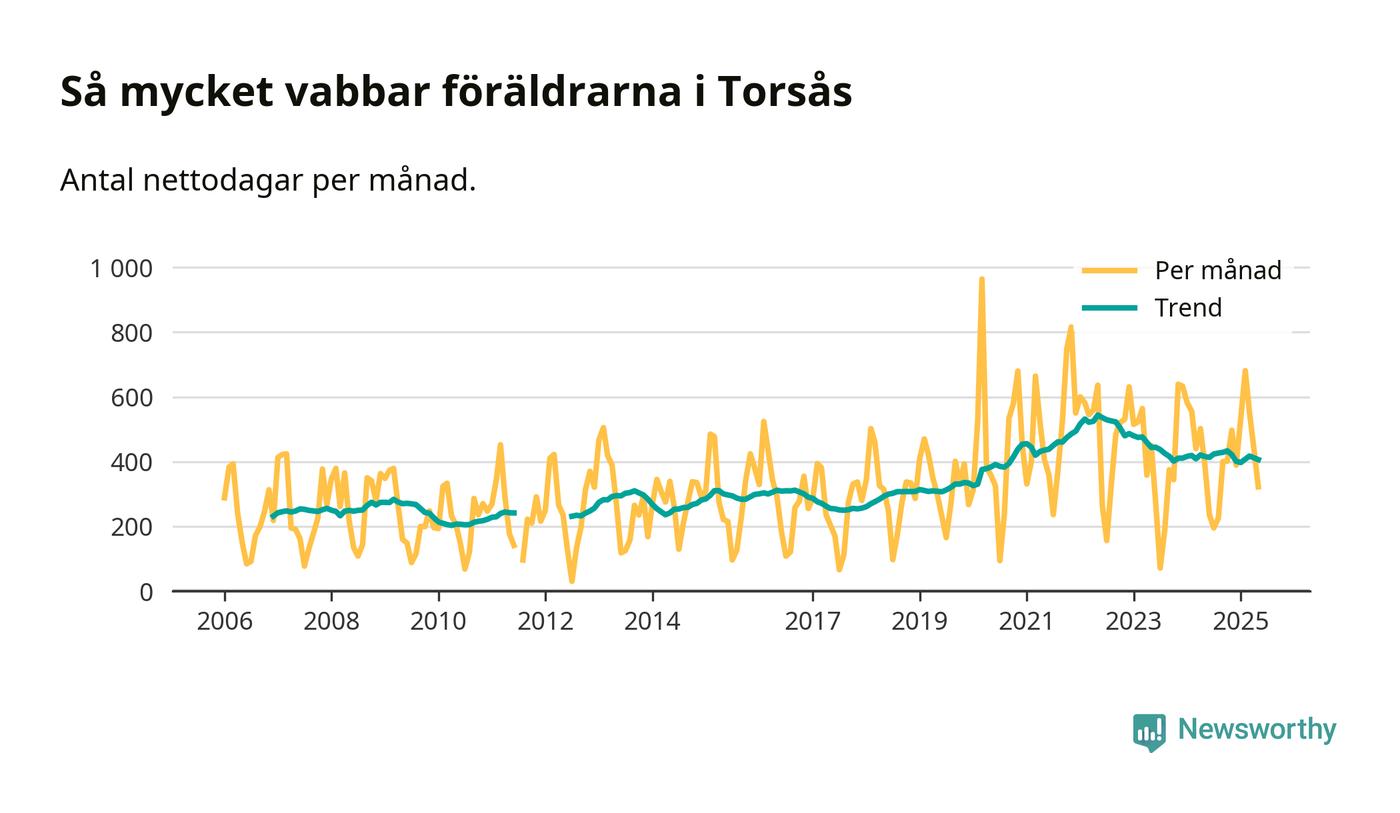 Torsås ligger en bit från ett jämställt uttag. Under de senaste tolv månaderna har männen stått för 41 procent av all vabb i kommunen. Pappornas uttag peakade vintern 2006 då kommunens fäder var uppe i 43 procent av vabbdagarna 1.
