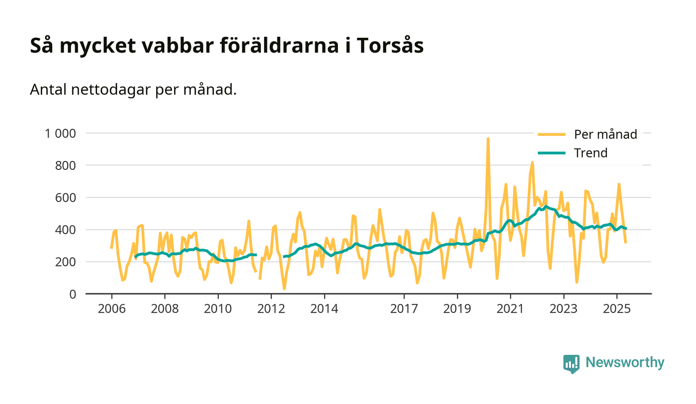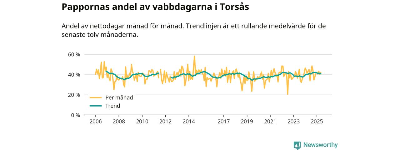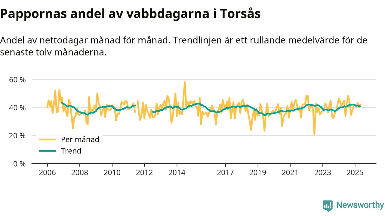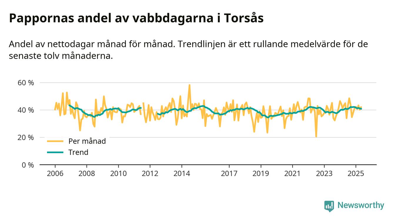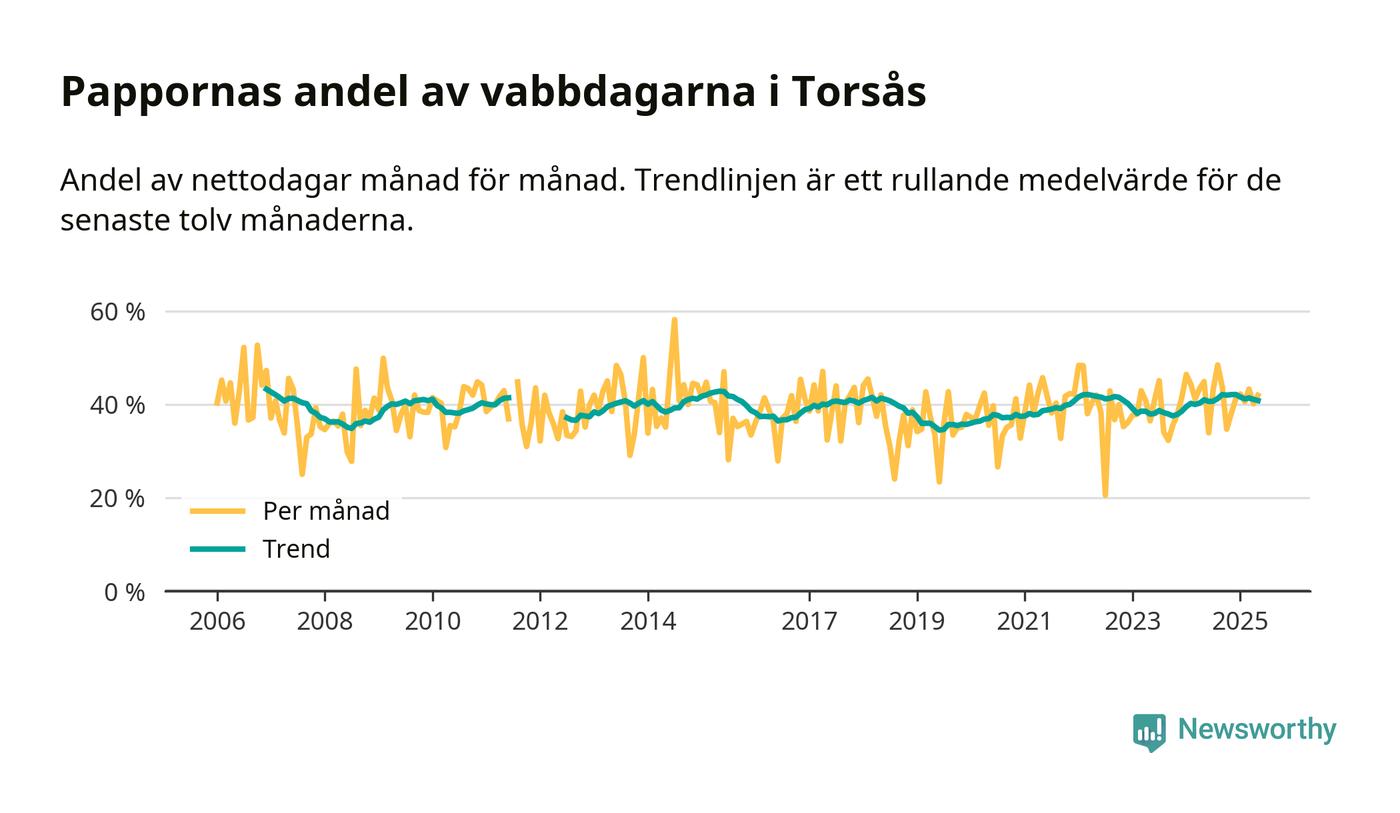 Torsås ligger en bit från ett jämställt uttag. Under de senaste tolv månaderna har männen stått för 41 procent av all vabb i kommunen. Pappornas uttag peakade vintern 2006 då kommunens fäder var uppe i 43 procent av vabbdagarna 1.