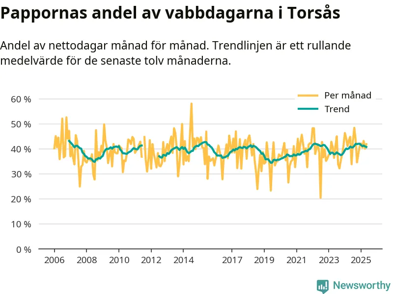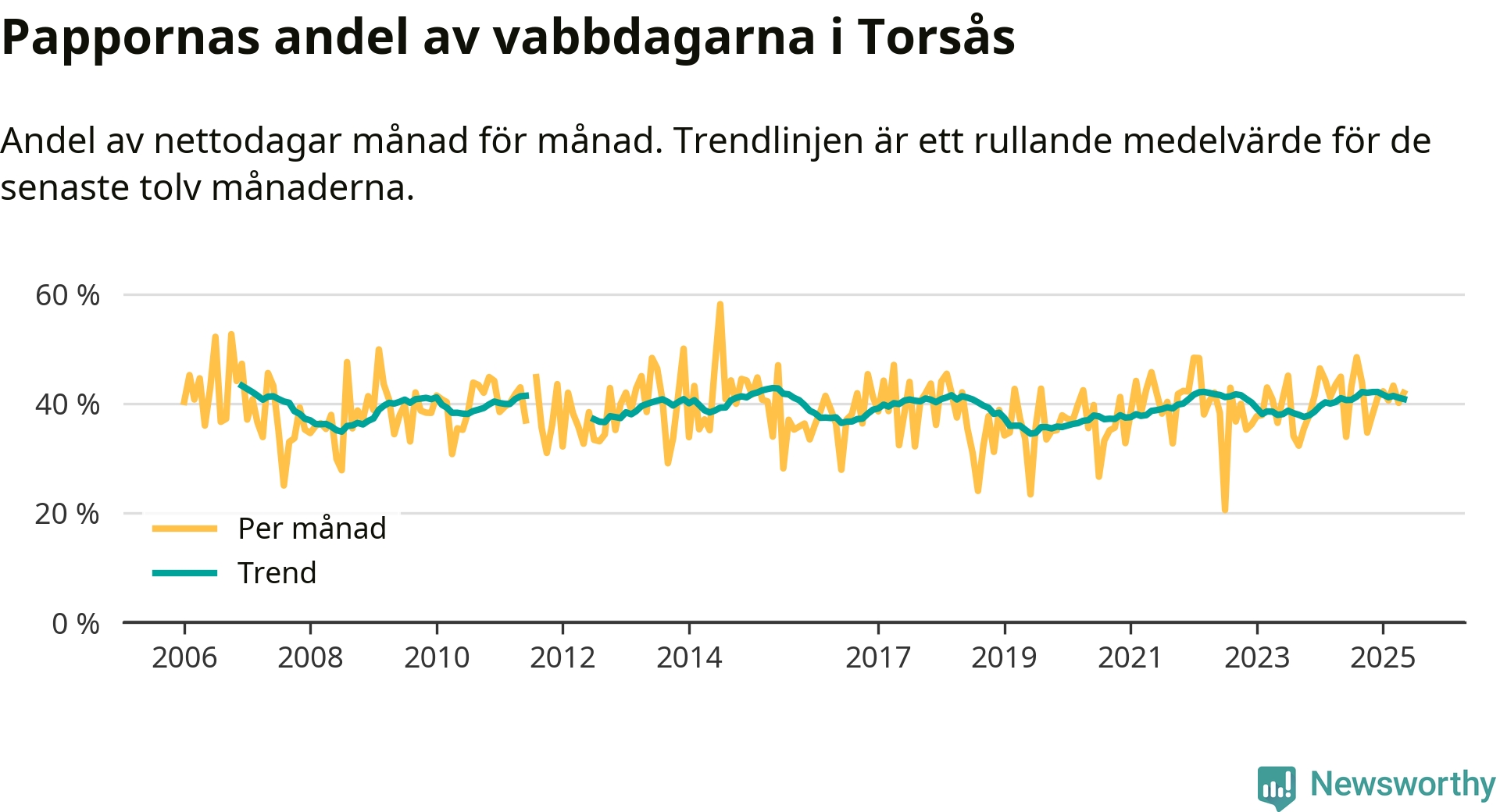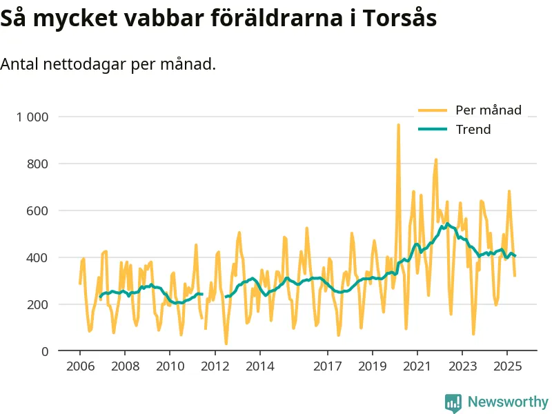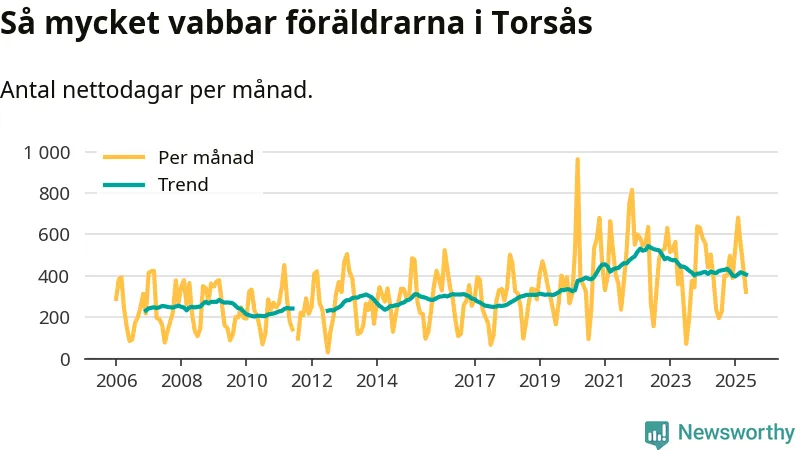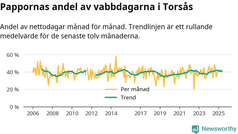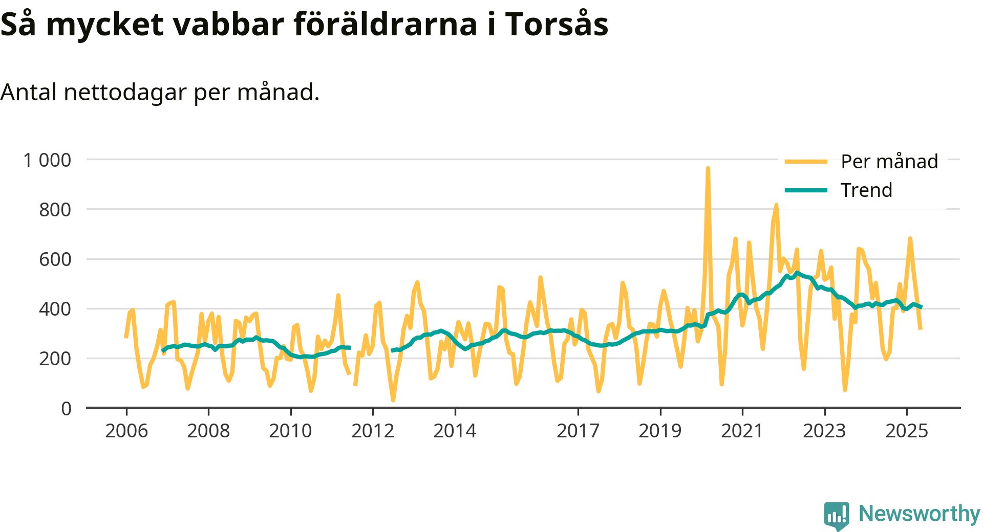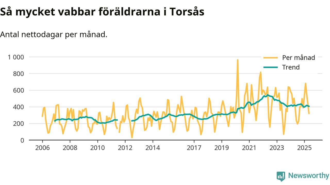 Torsås ligger en bit från ett jämställt uttag. Under de senaste tolv månaderna har männen stått för 41 procent av all vabb i kommunen. Pappornas uttag peakade vintern 2006 då kommunens fäder var uppe i 43 procent av vabbdagarna 1.