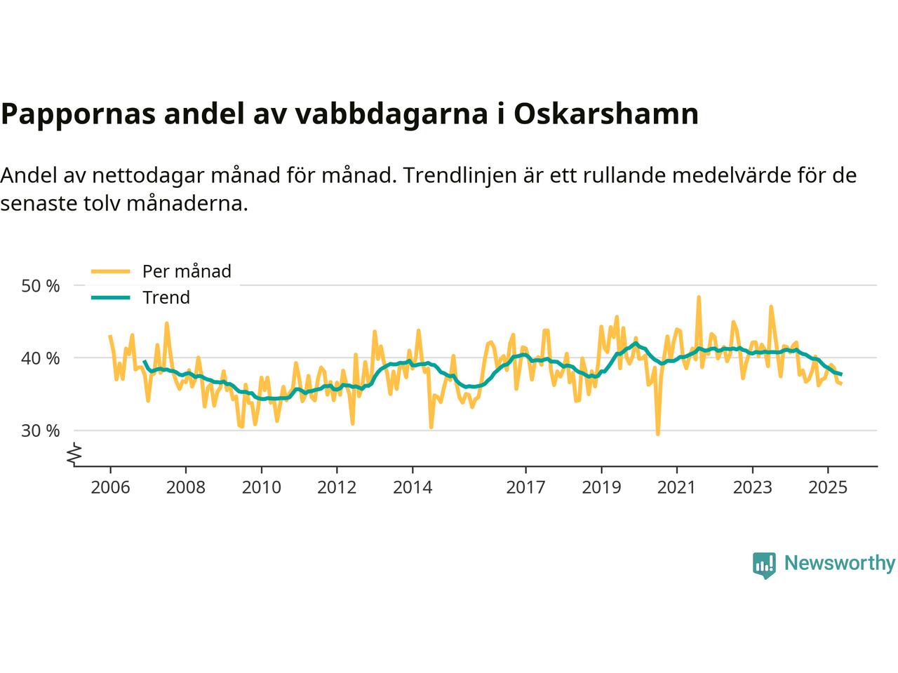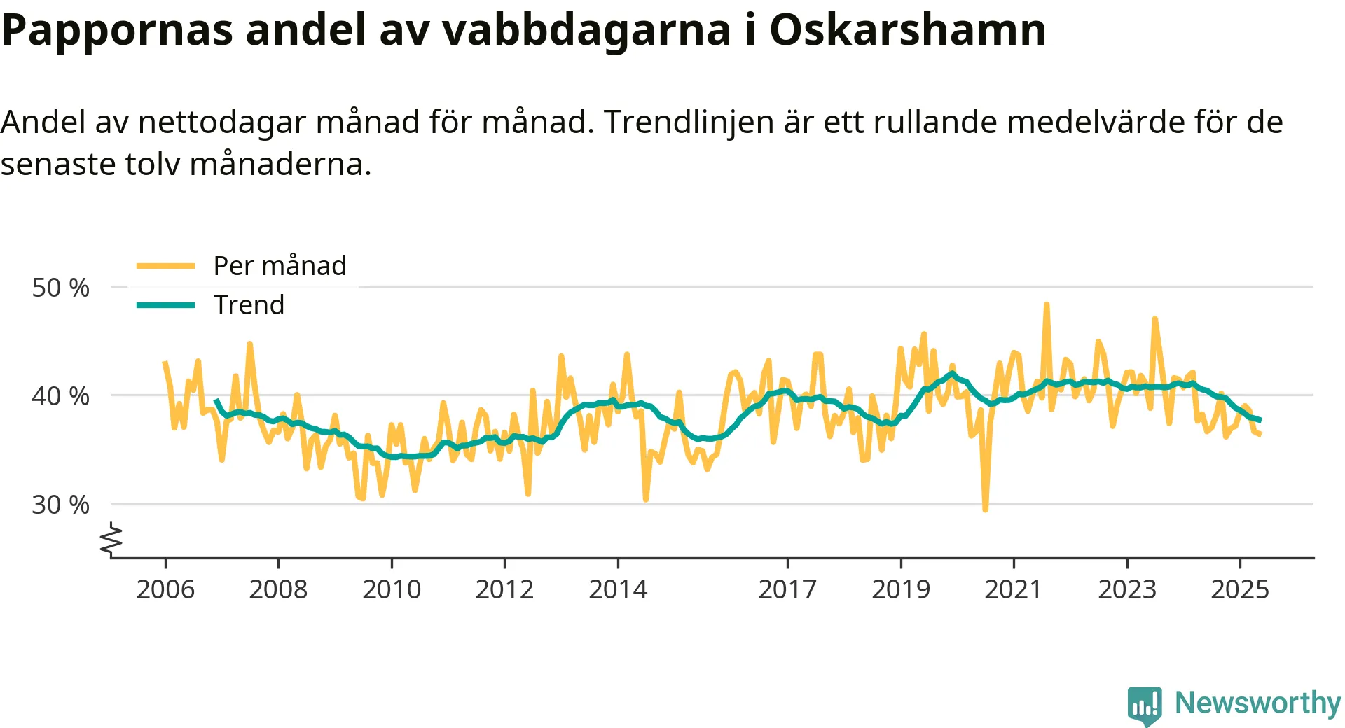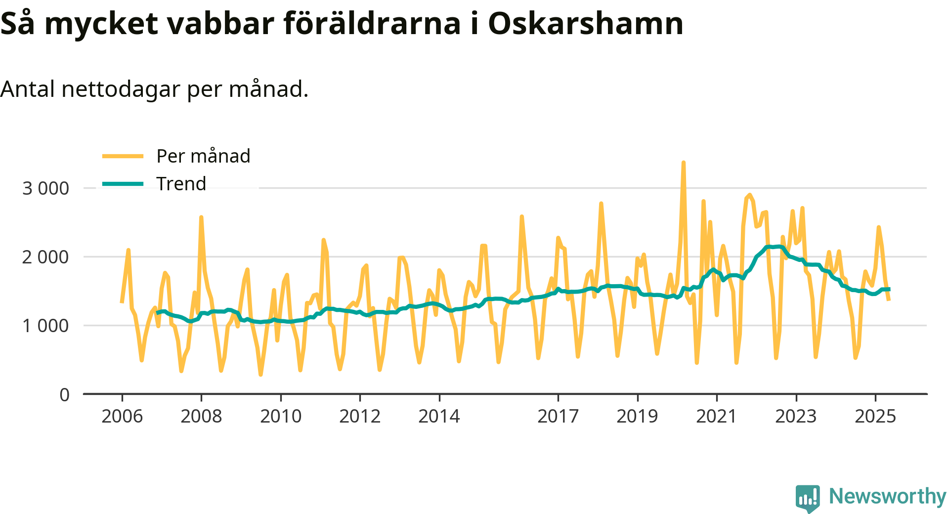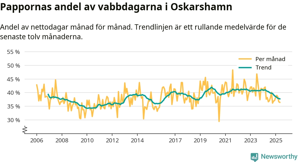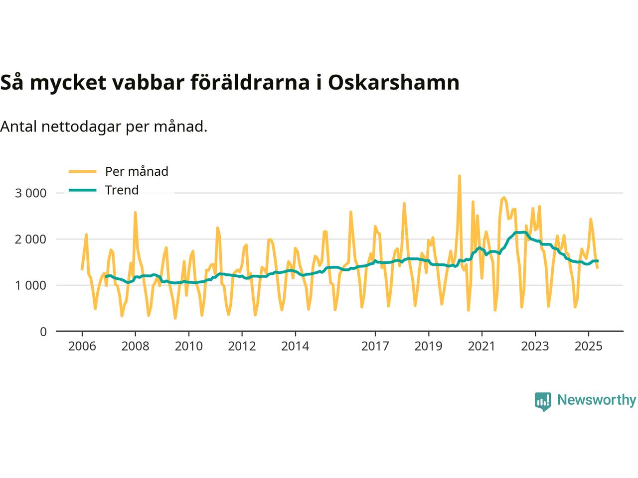När coronapandemin drog in i mars 2020 peakade antalet vabbdagar både i Oskarshamns kommun och i riket som helhet. Under de senaste två åren har vabbuttaget börjat minska igen.