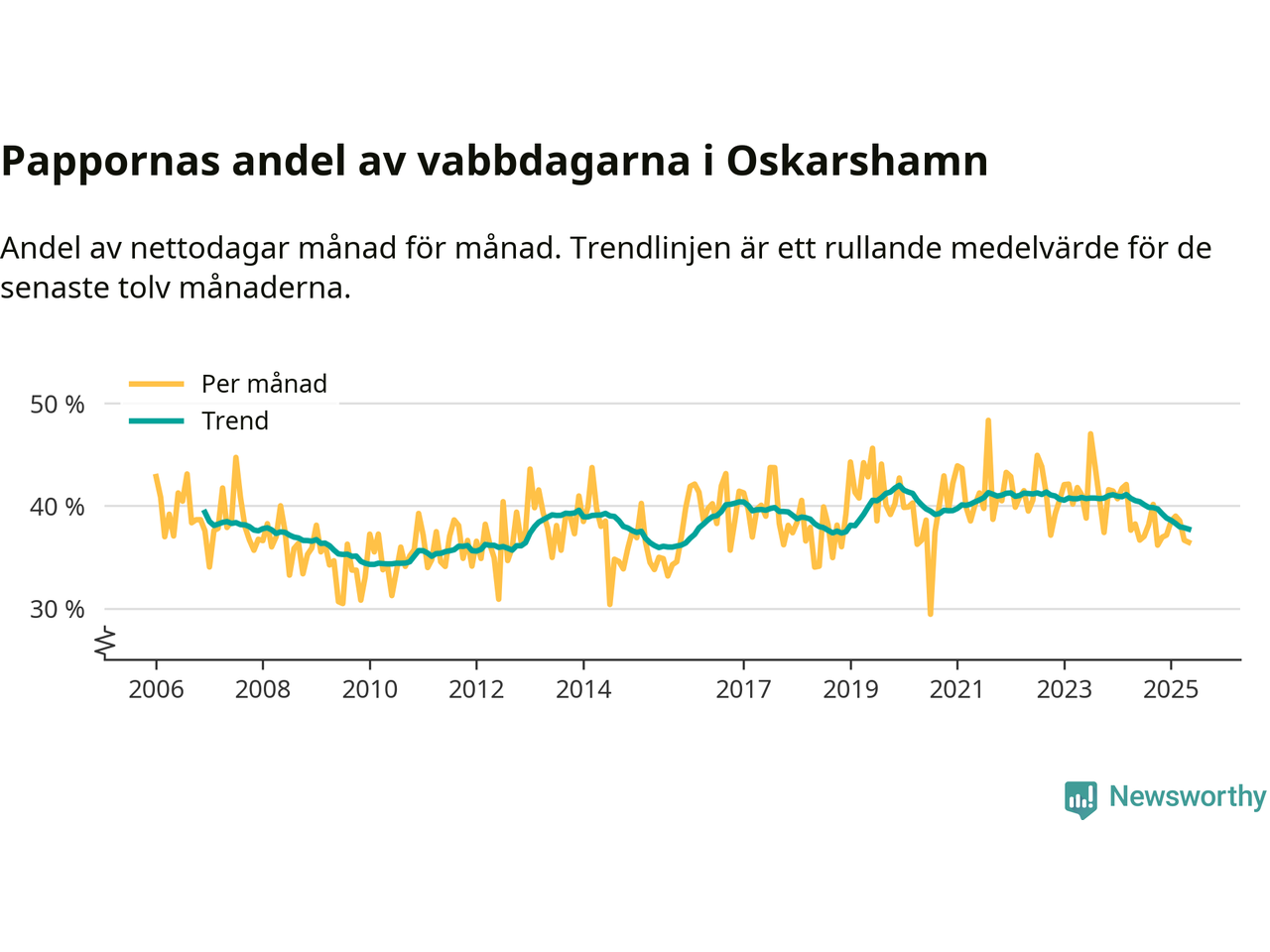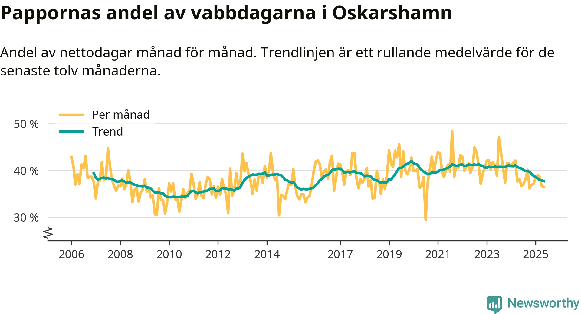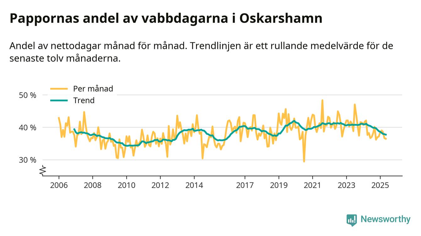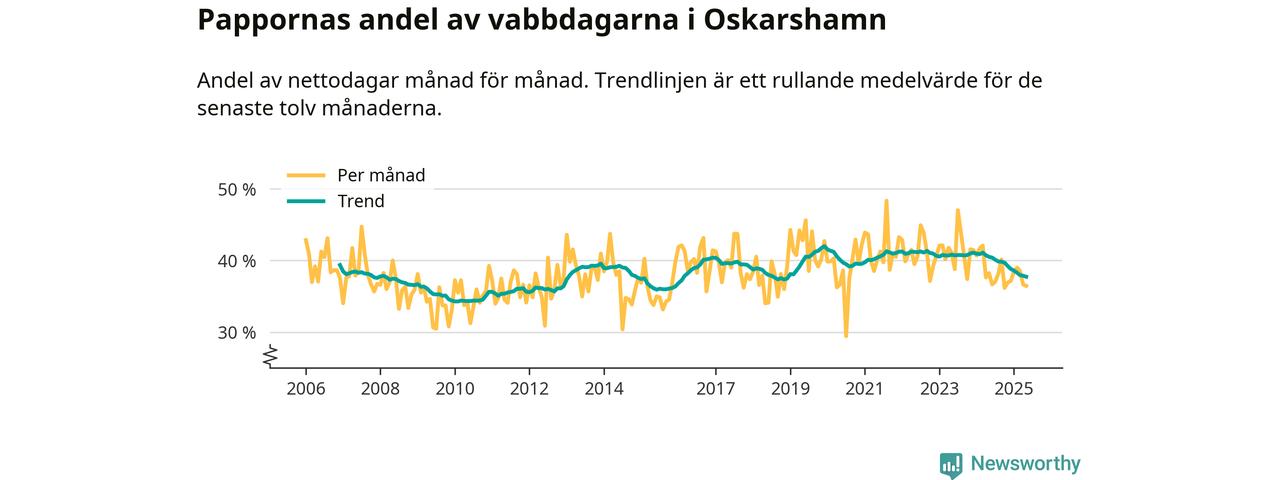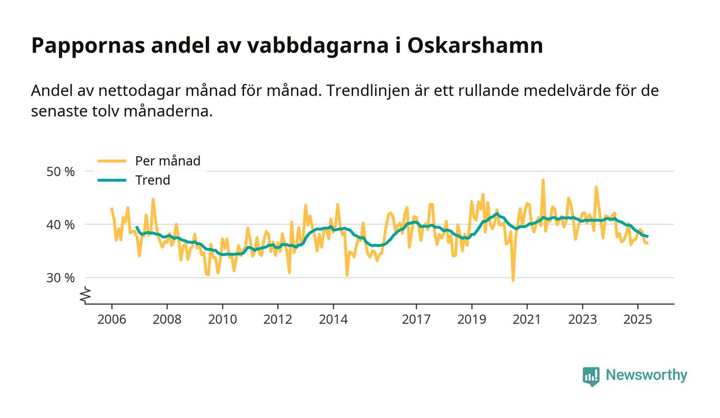 Oskarshamn ligger en bit från ett jämställt uttag. Under de senaste tolv månaderna har männen stått för 38 procent av all vabb i kommunen. Det är en lägre andel än på över sex år.