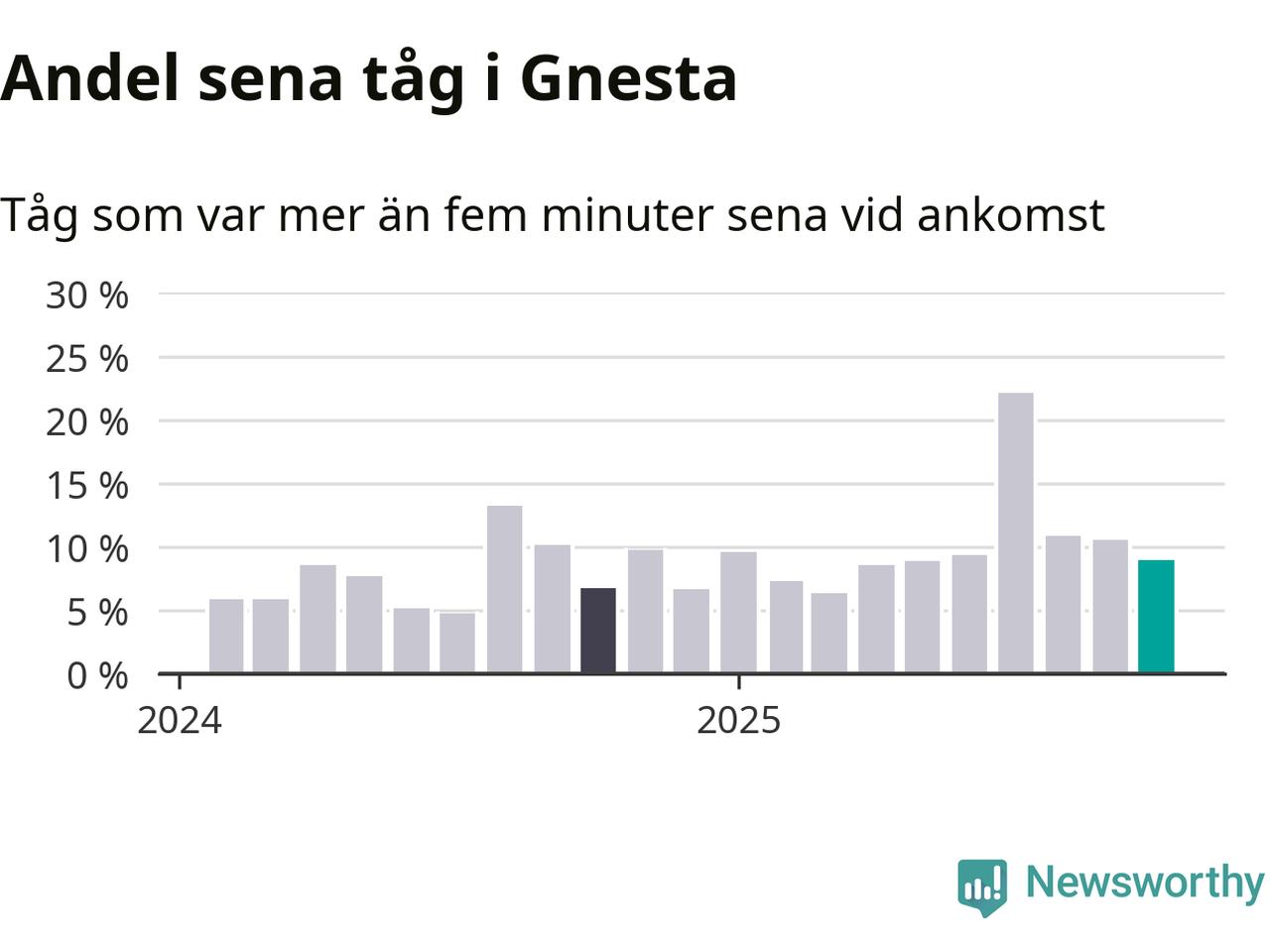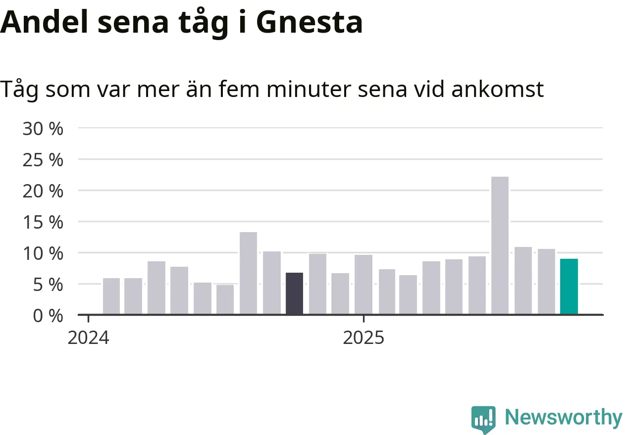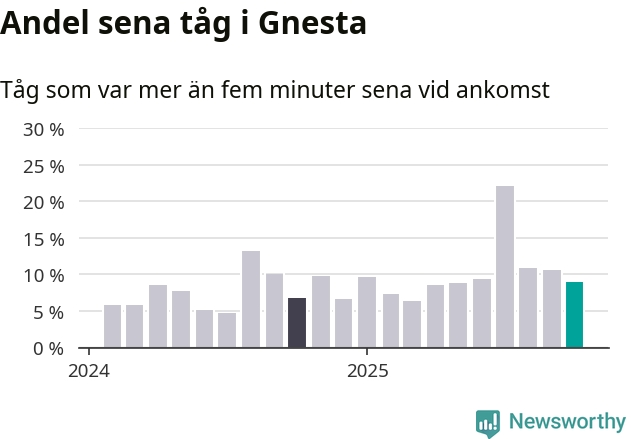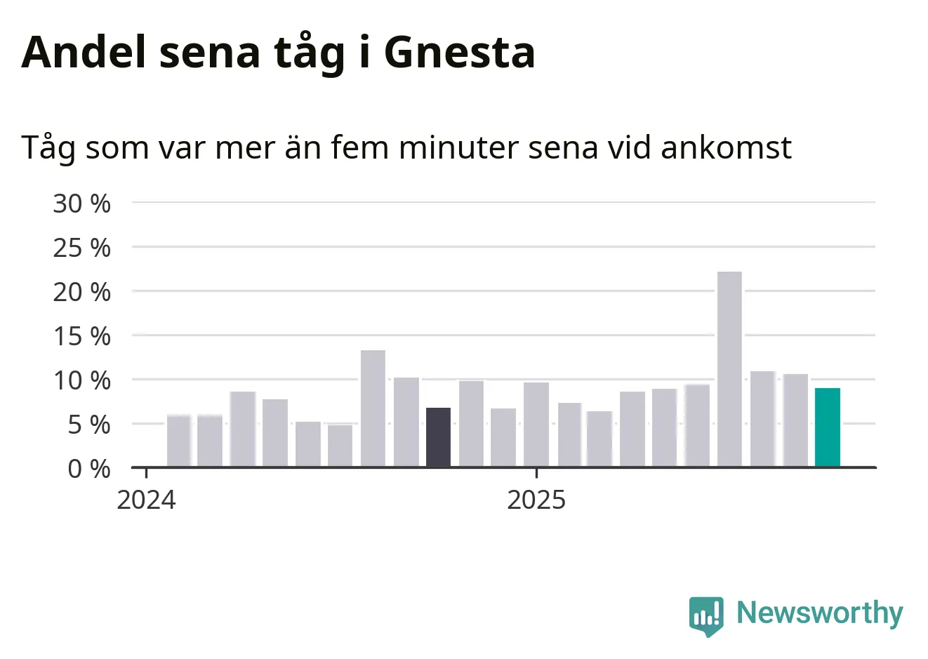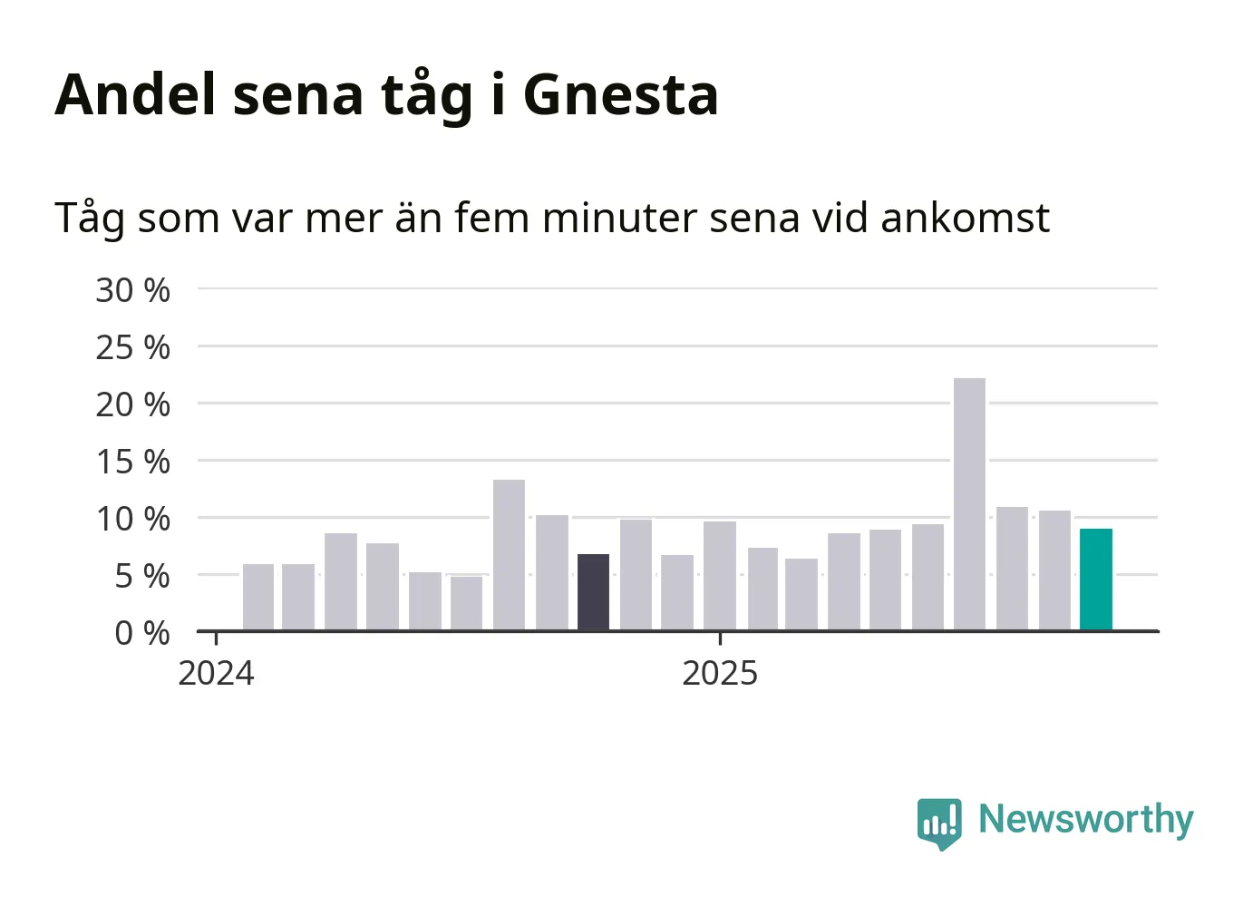 Nio procent kan jämföras med elva procent månaden innan, och sju procent i oktober 2024. Oktober är den tredje månaden i rad med minskande förseningar vid Gnesta station. Siffrorna bygger på realtidsinformation om tågavgångar och ankomster från Trafikverket, som Newsworthy löpande samlar in.