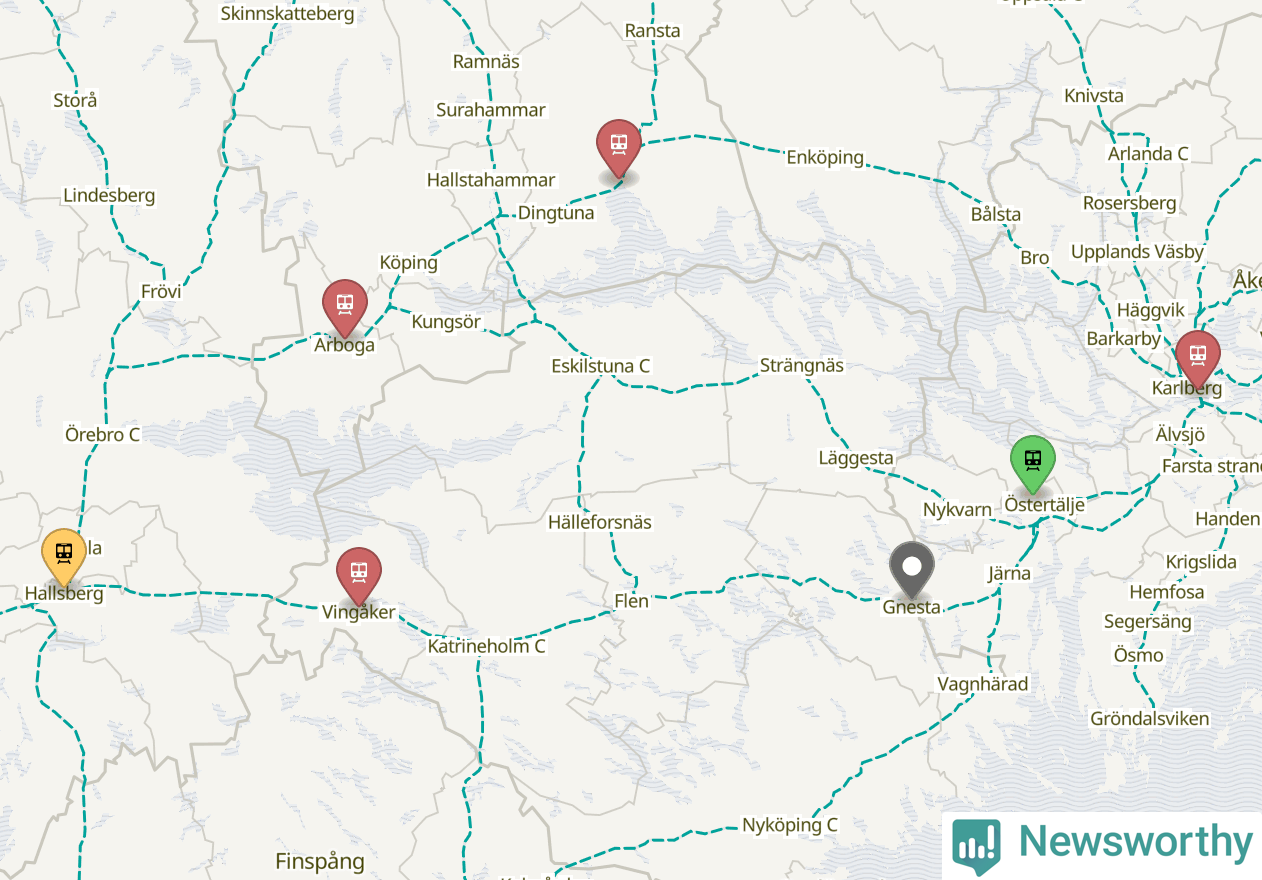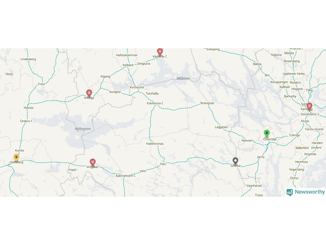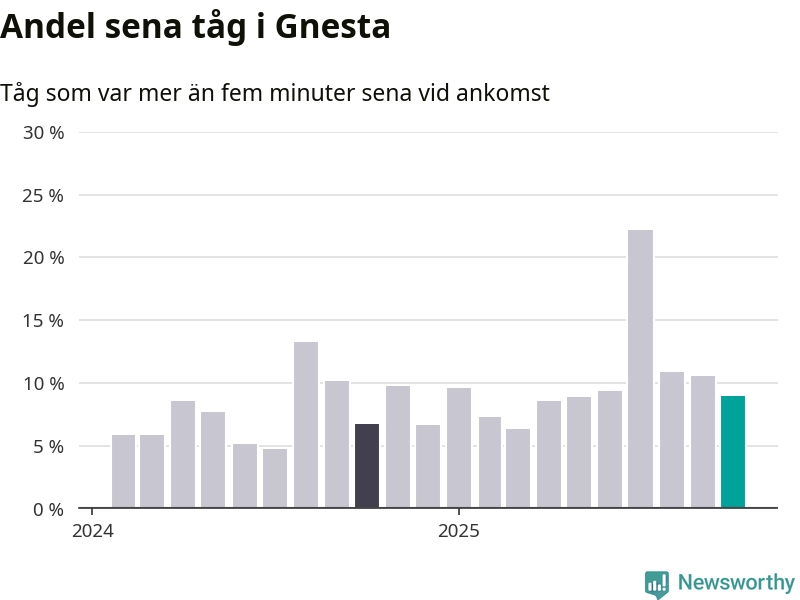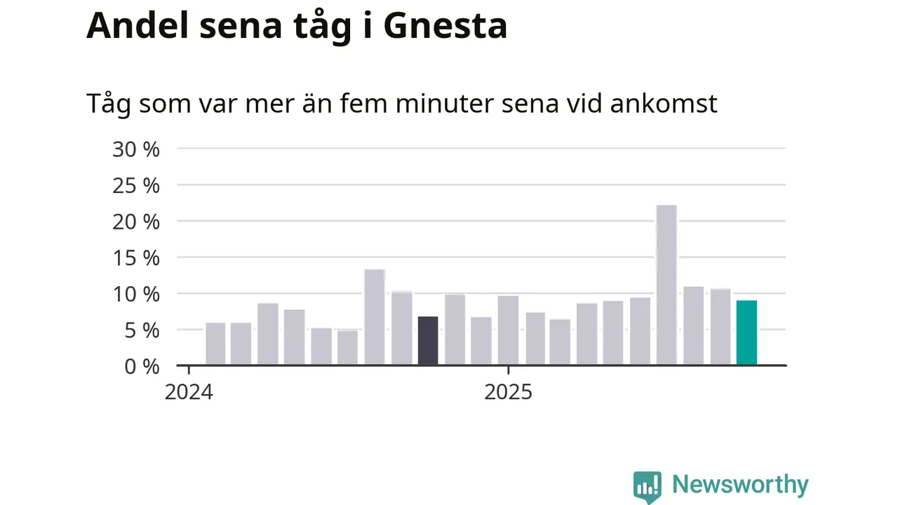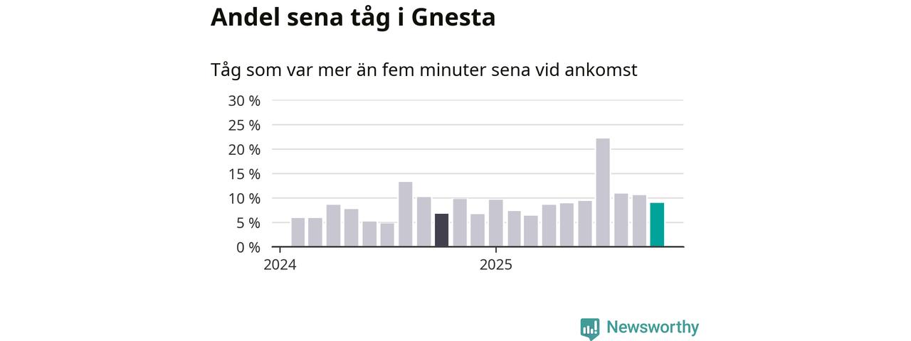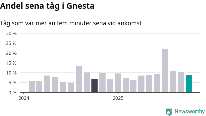 Nio procent kan jämföras med elva procent månaden innan, och sju procent i oktober 2024. Oktober är den tredje månaden i rad med minskande förseningar vid Gnesta station. Siffrorna bygger på realtidsinformation om tågavgångar och ankomster från Trafikverket, som Newsworthy löpande samlar in.