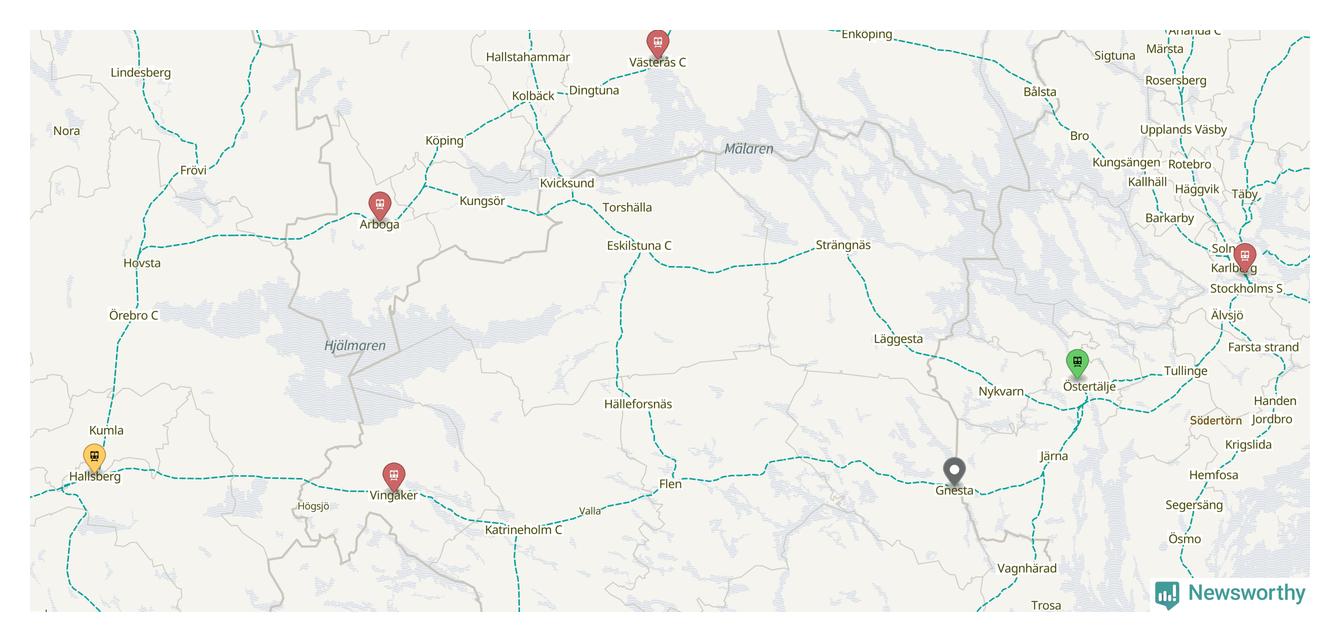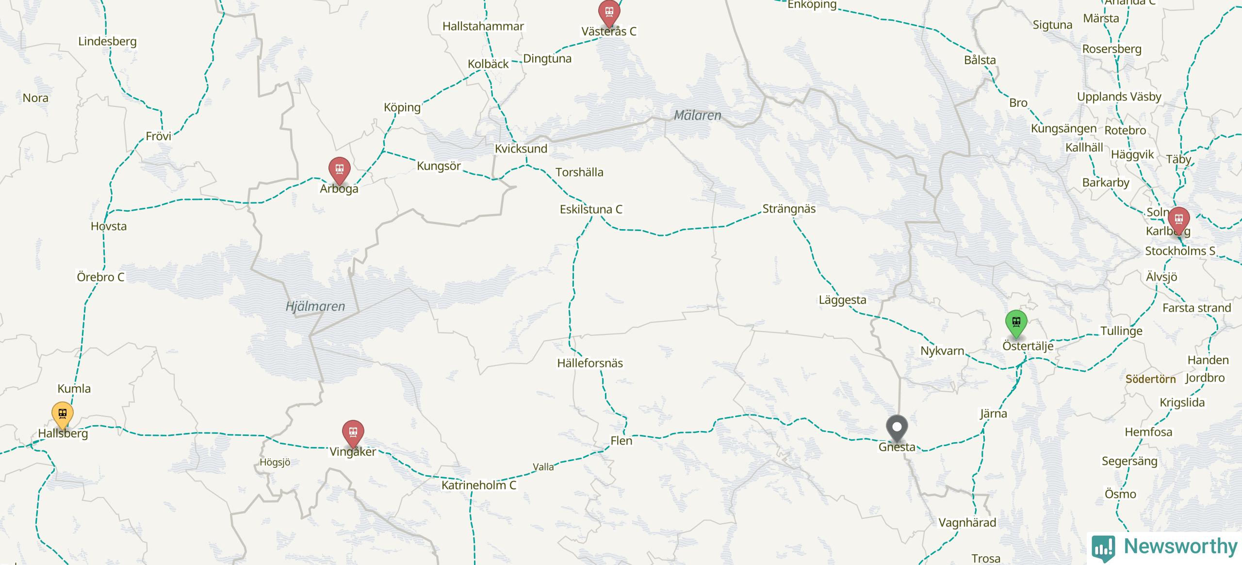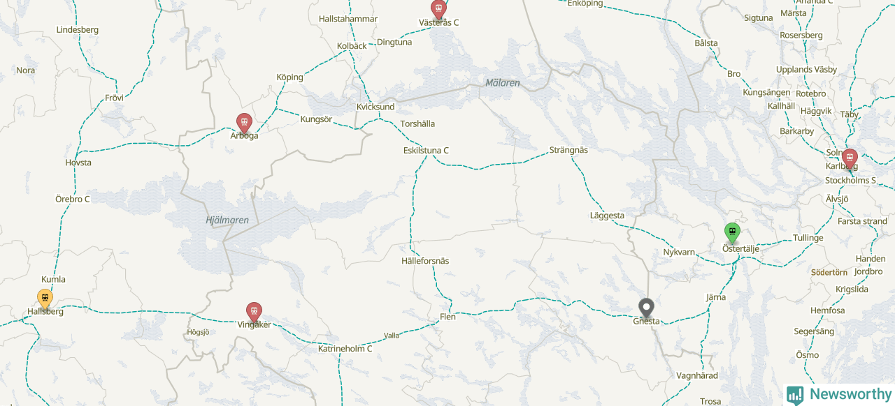 Kartdata från Mapbox, Newsworthy, OpenStreetMap och Trafikverket. Uppgifter om sträckor med passagerartrafik från jarnvag.net.