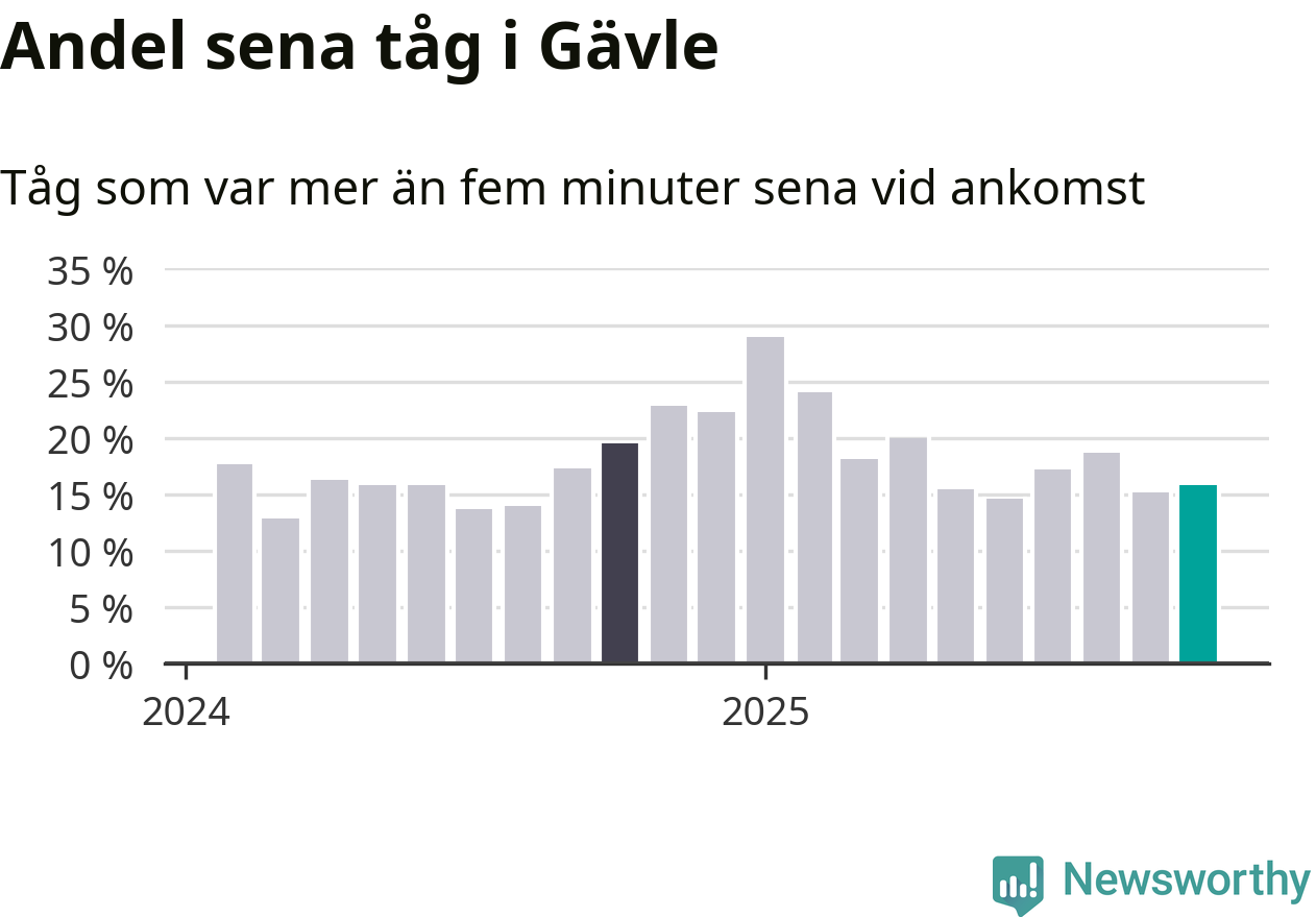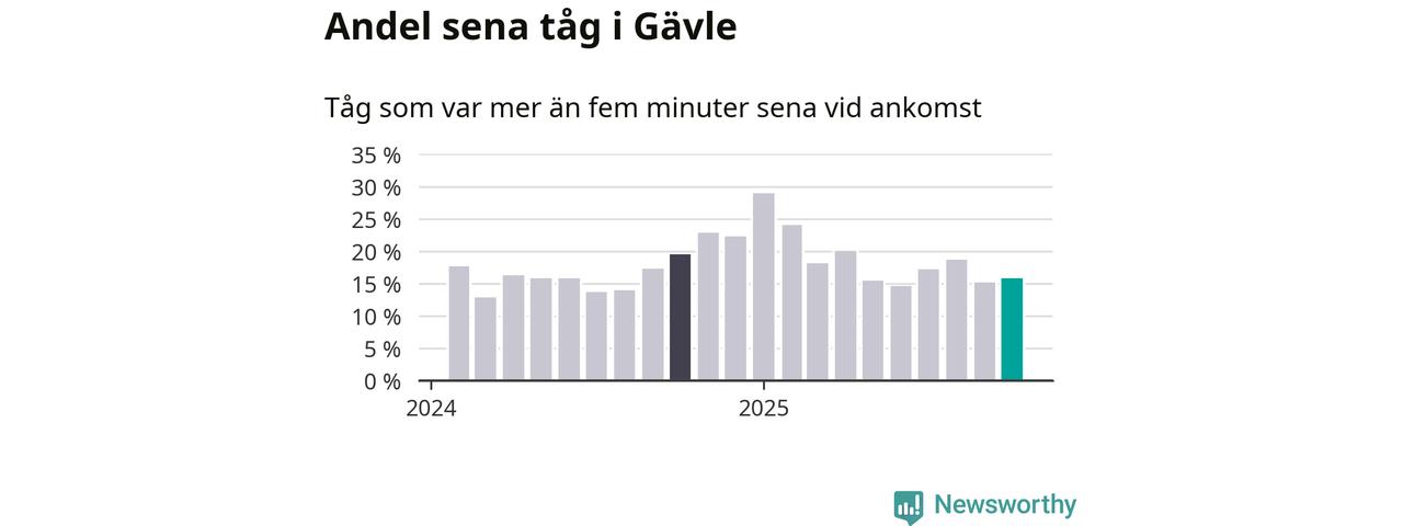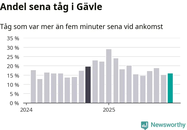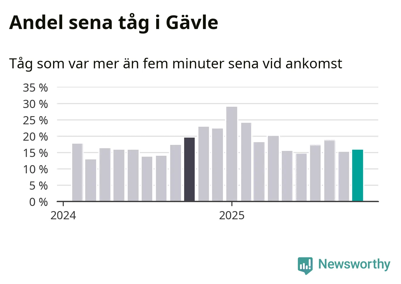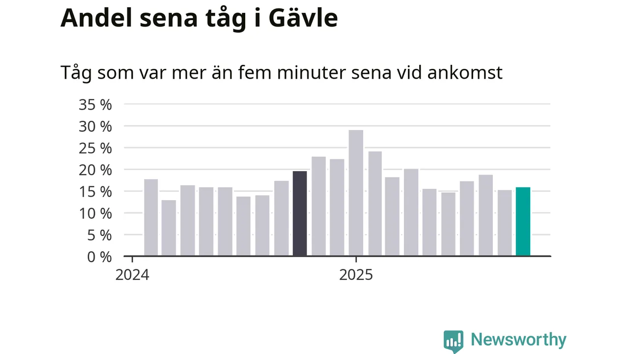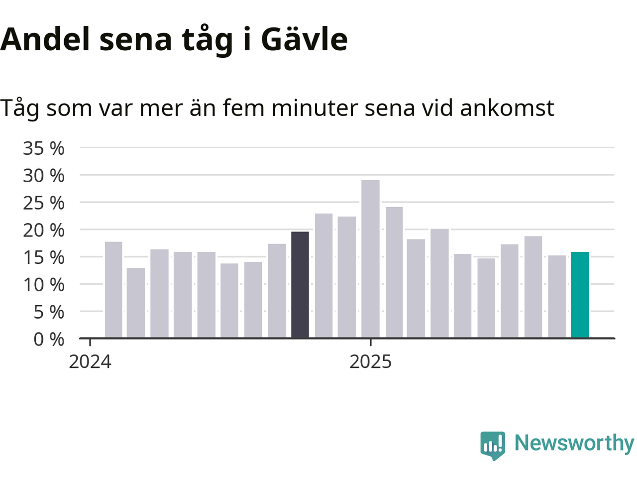 16 procent kan jämföras med 15 procent månaden innan, och 19 procent i oktober 2024. Siffrorna bygger på realtidsinformation om tågavgångar och ankomster från Trafikverket, som Newsworthy löpande samlar in.