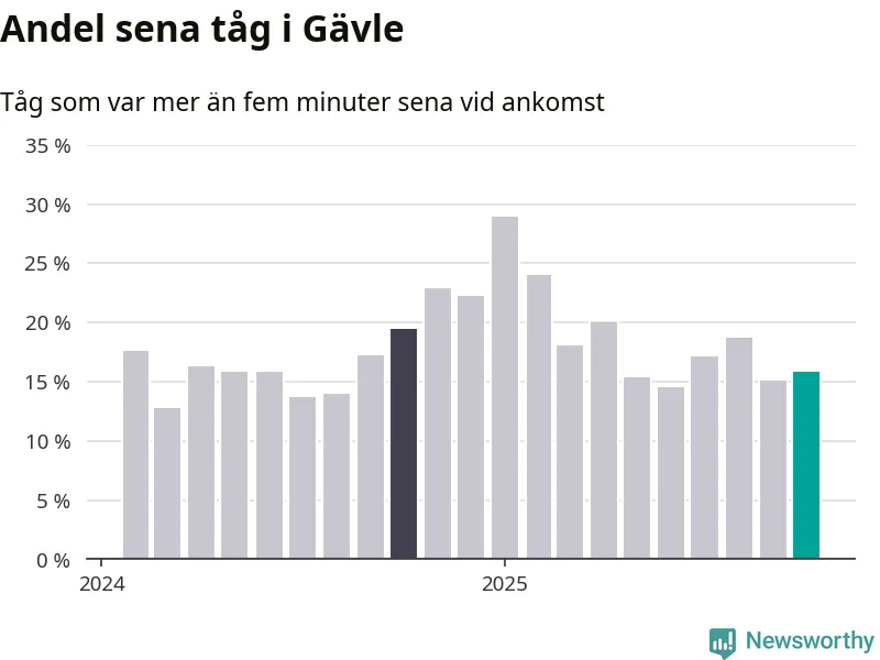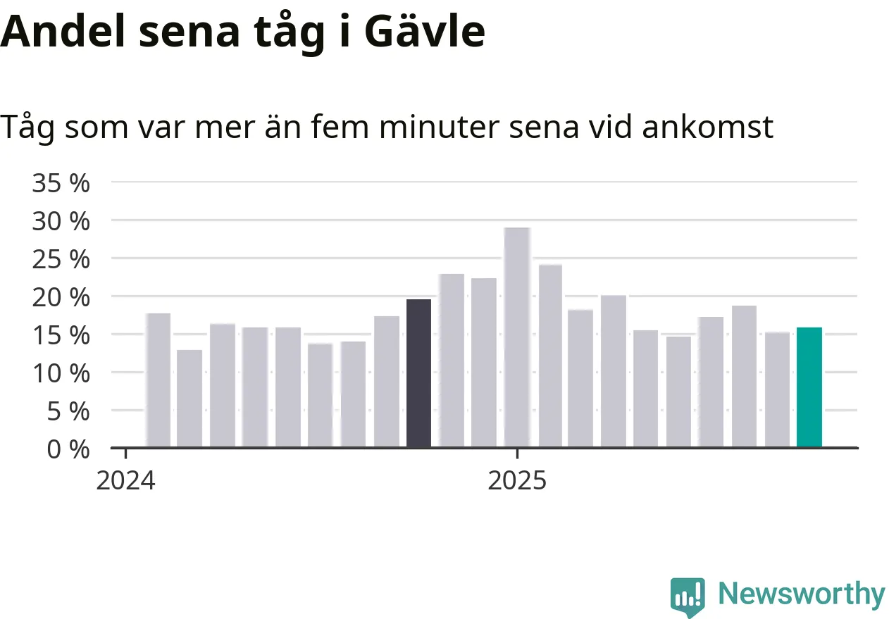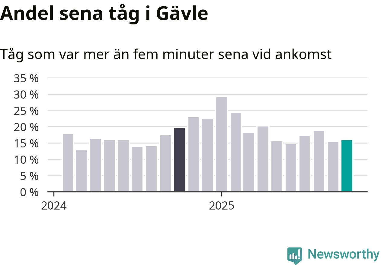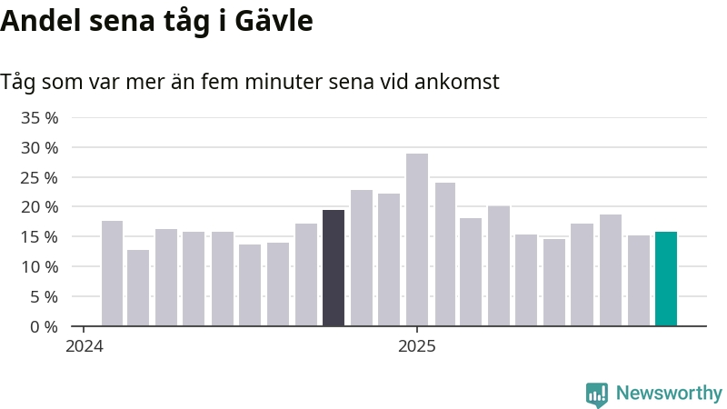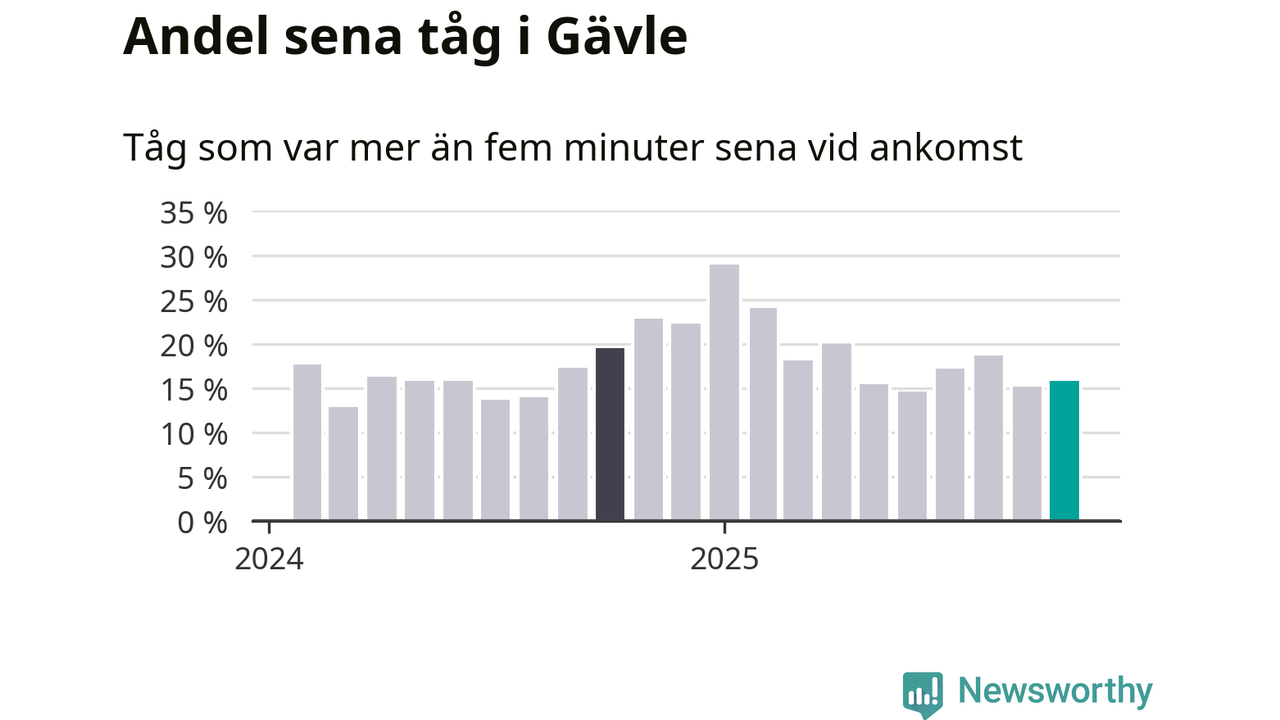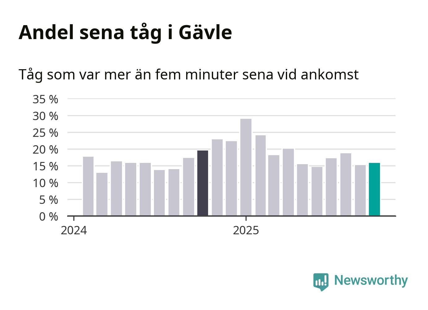 16 procent kan jämföras med 15 procent månaden innan, och 19 procent i oktober 2024. Siffrorna bygger på realtidsinformation om tågavgångar och ankomster från Trafikverket, som Newsworthy löpande samlar in.