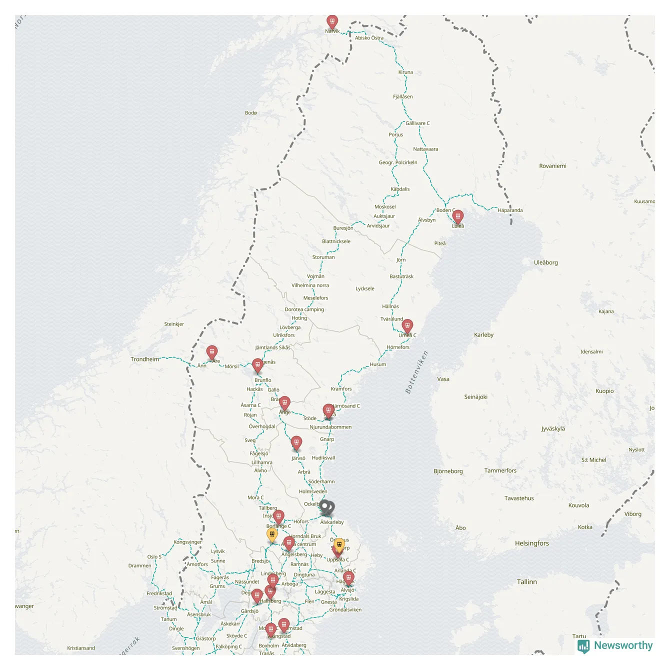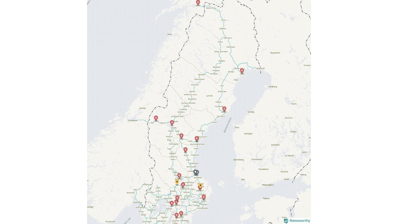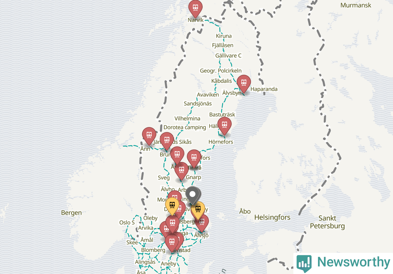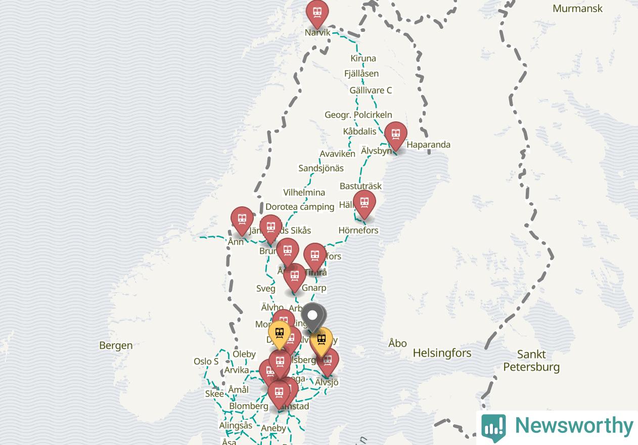 Kartdata från Mapbox, Newsworthy, OpenStreetMap och Trafikverket. Uppgifter om sträckor med passagerartrafik från jarnvag.net.