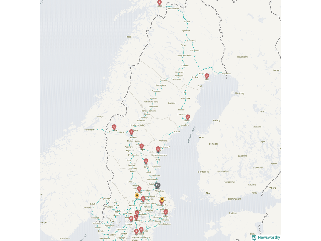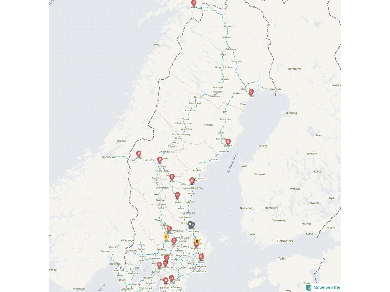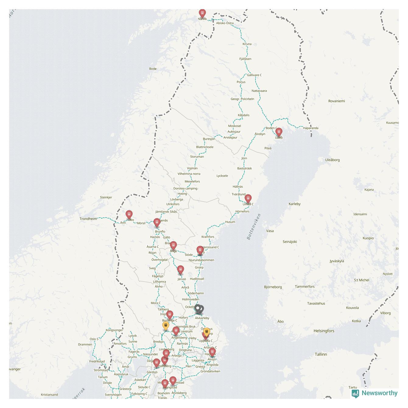 Kartdata från Mapbox, Newsworthy, OpenStreetMap och Trafikverket. Uppgifter om sträckor med passagerartrafik från jarnvag.net.