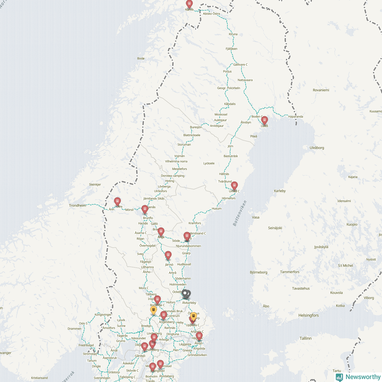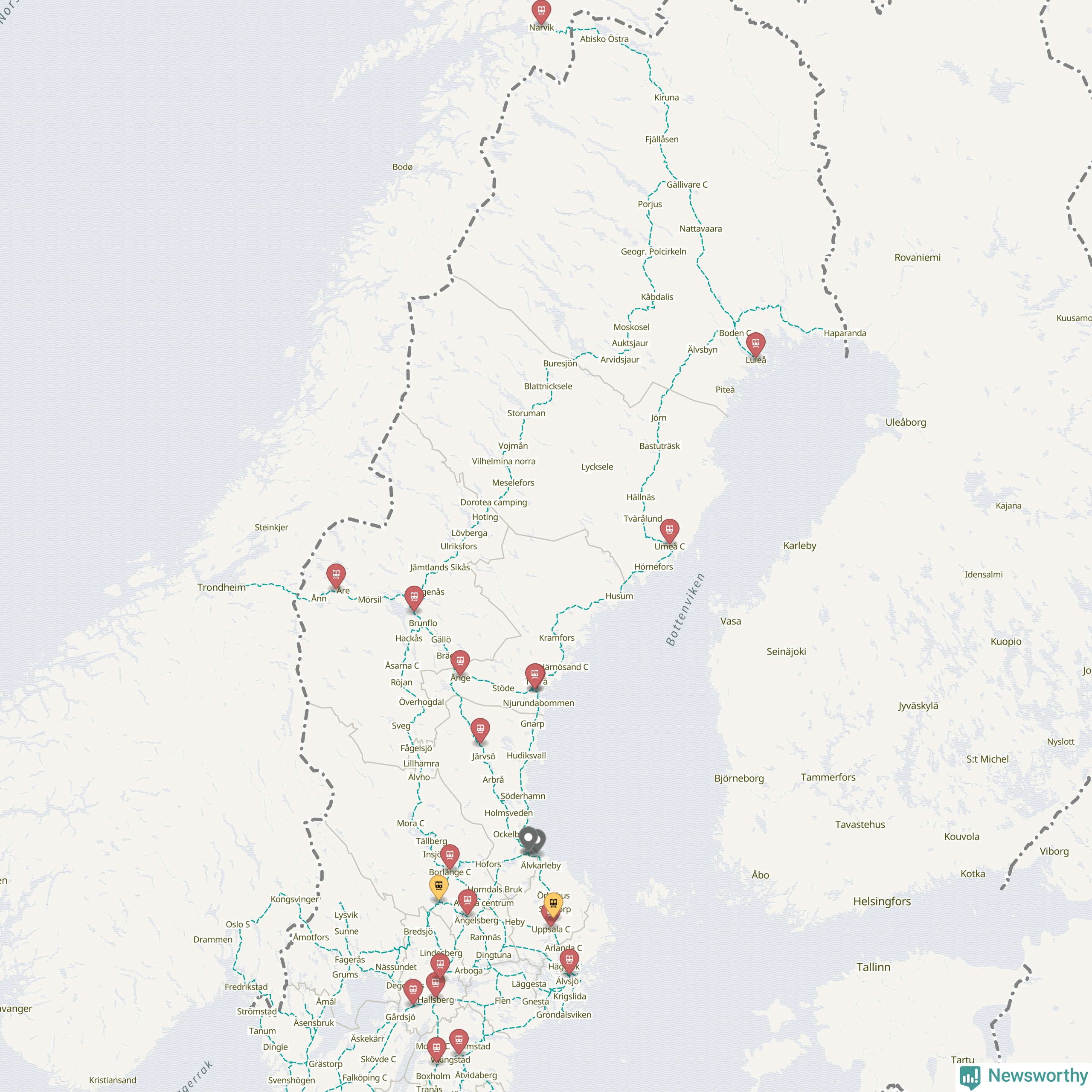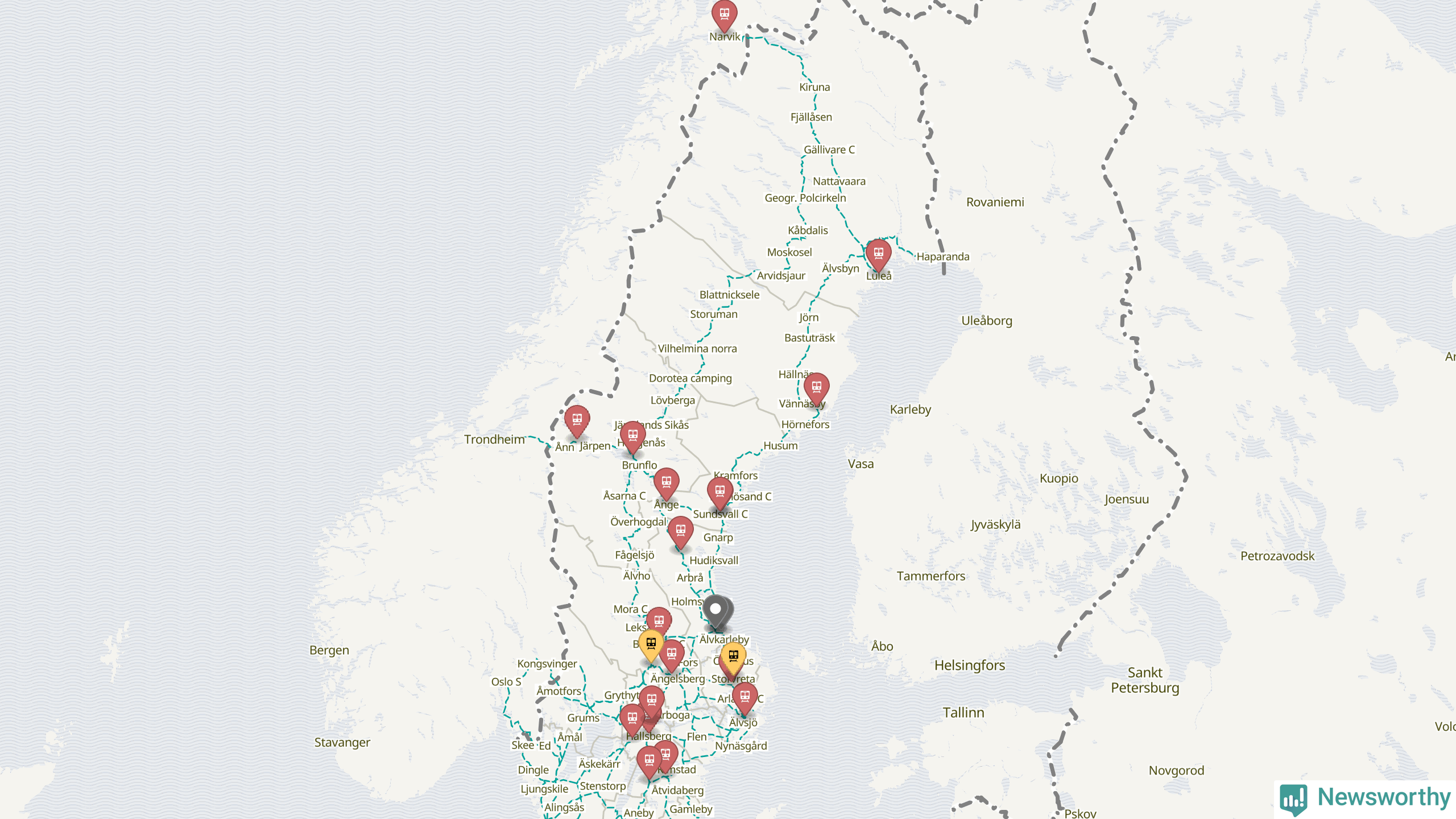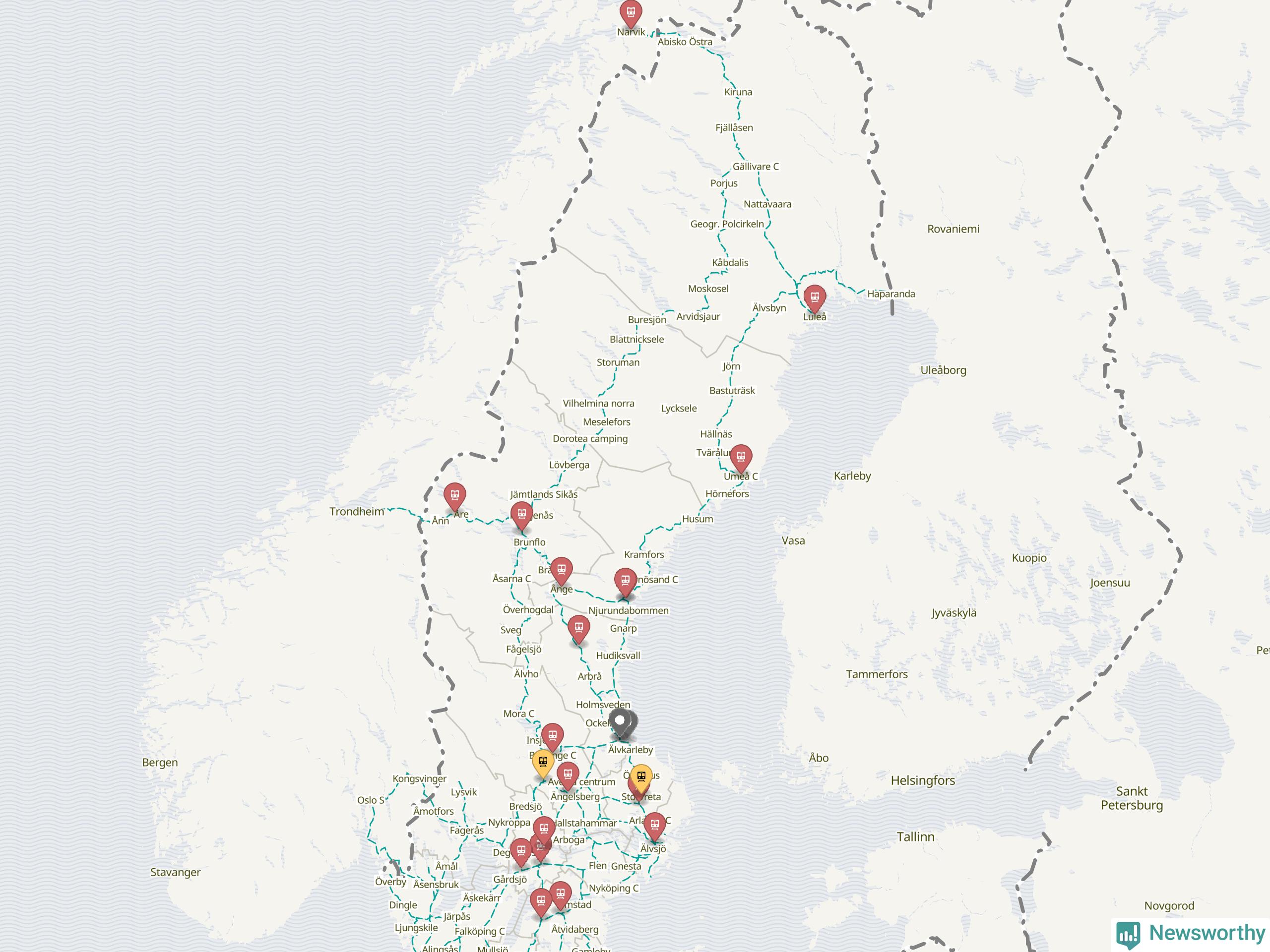 Kartdata från Mapbox, Newsworthy, OpenStreetMap och Trafikverket. Uppgifter om sträckor med passagerartrafik från jarnvag.net.