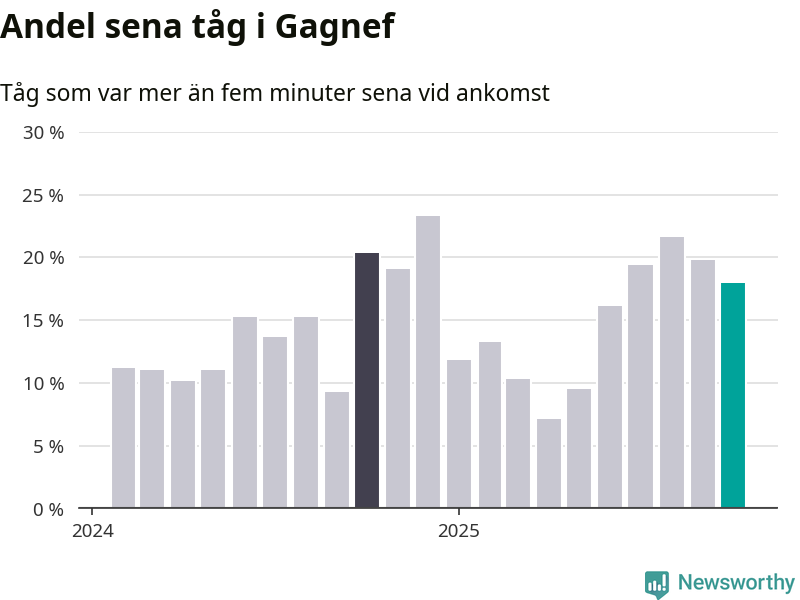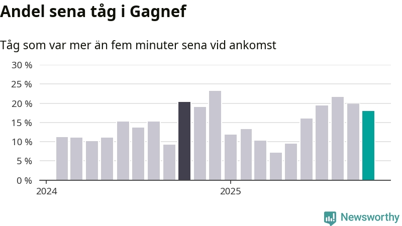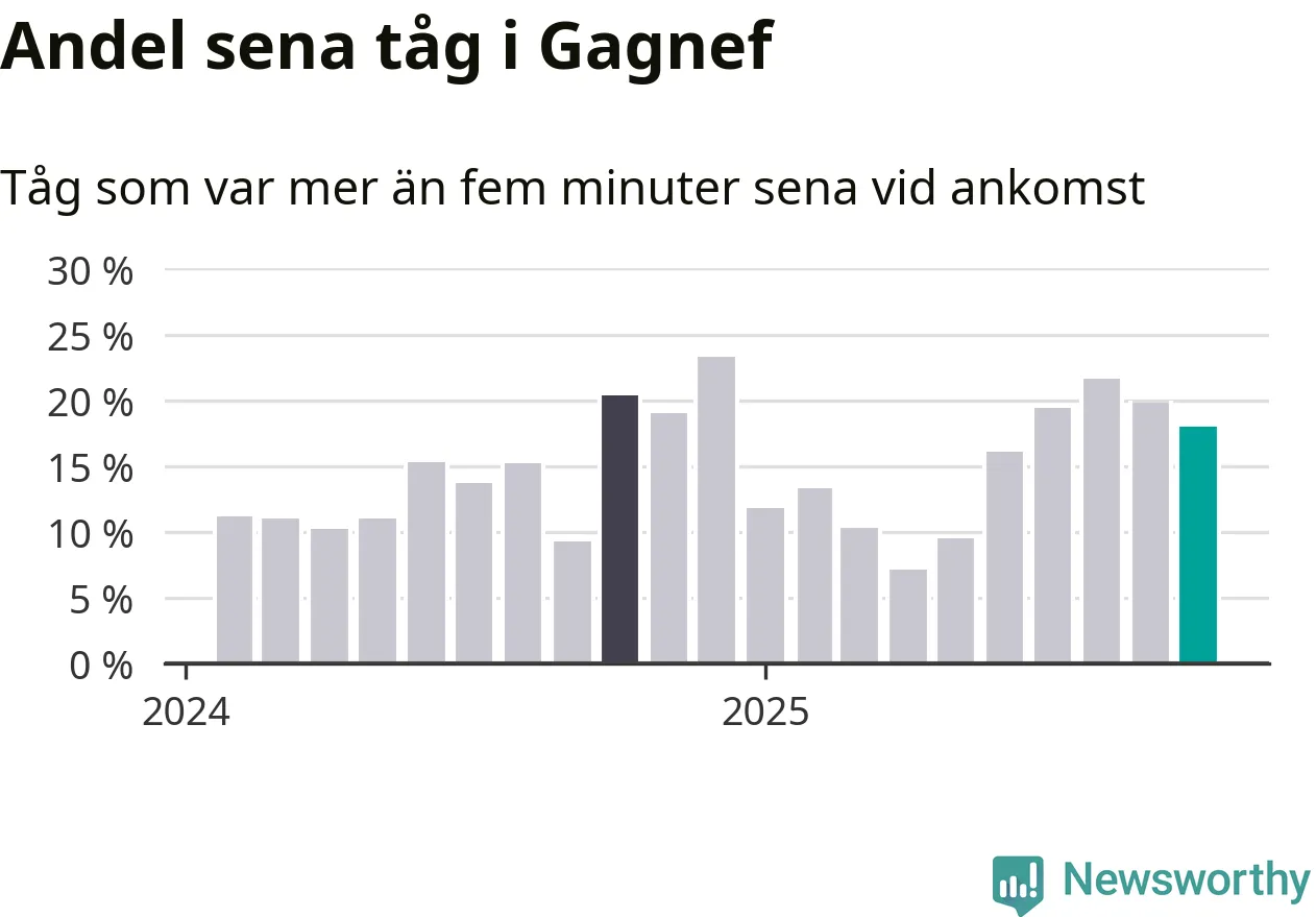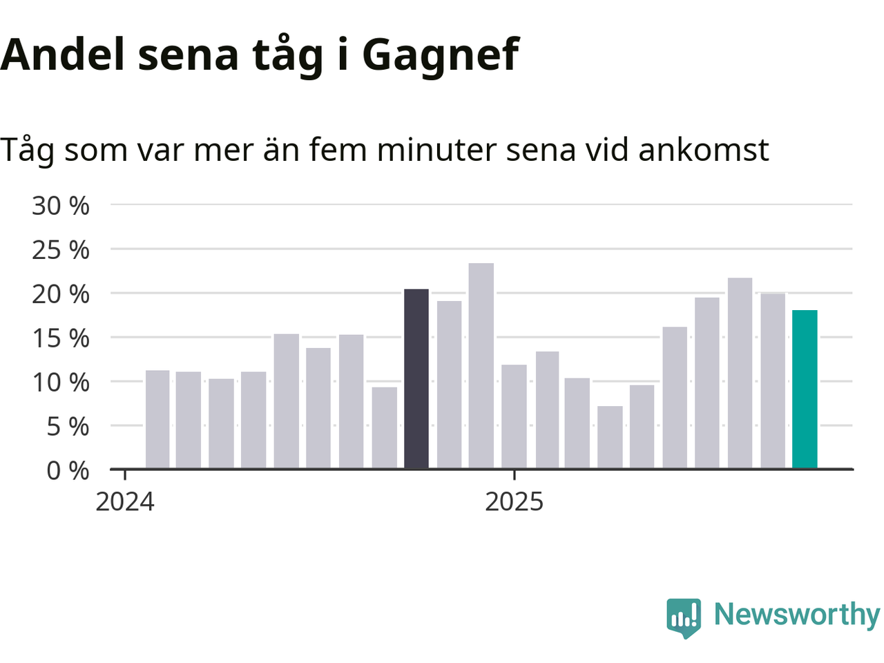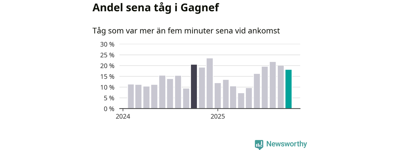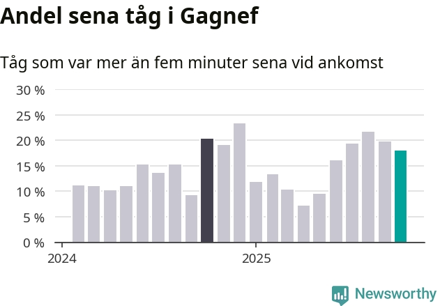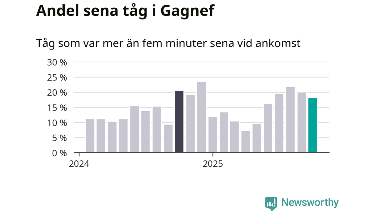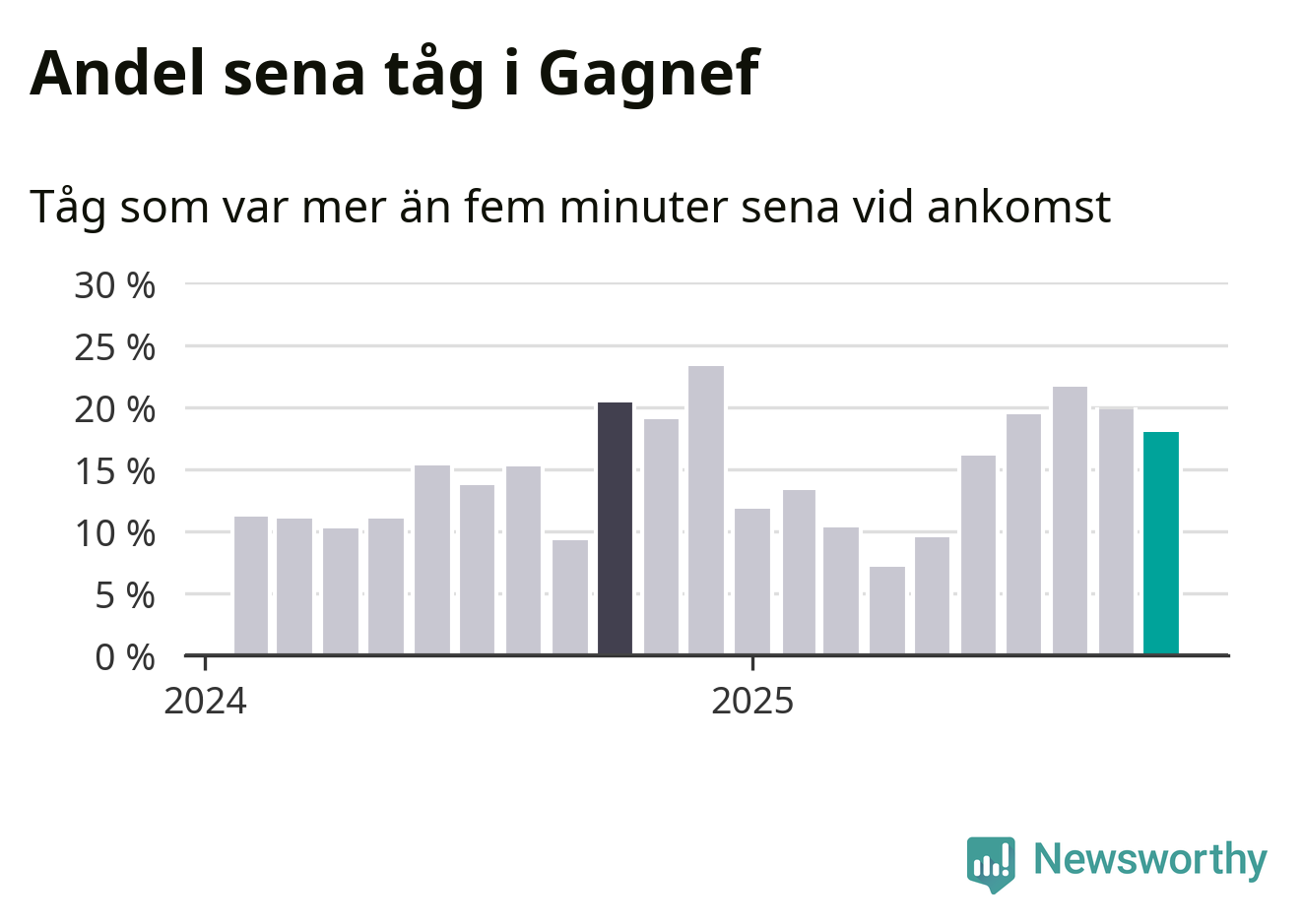 18 procent kan jämföras med 20 procent månaden innan, och 20 procent i oktober 2024. Siffrorna bygger på realtidsinformation om tågavgångar och ankomster från Trafikverket, som Newsworthy löpande samlar in.