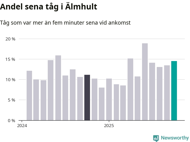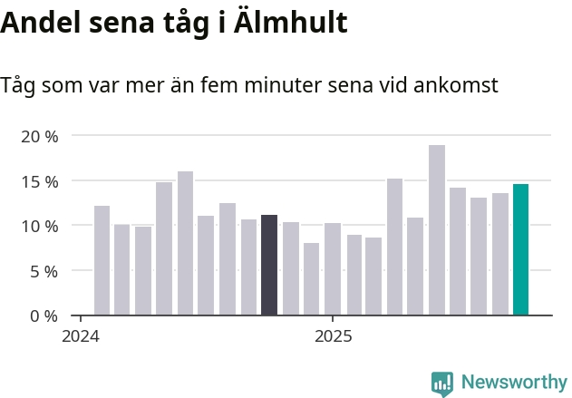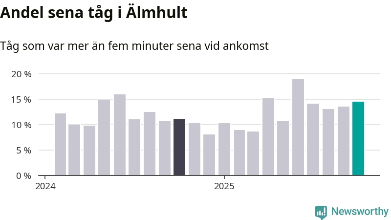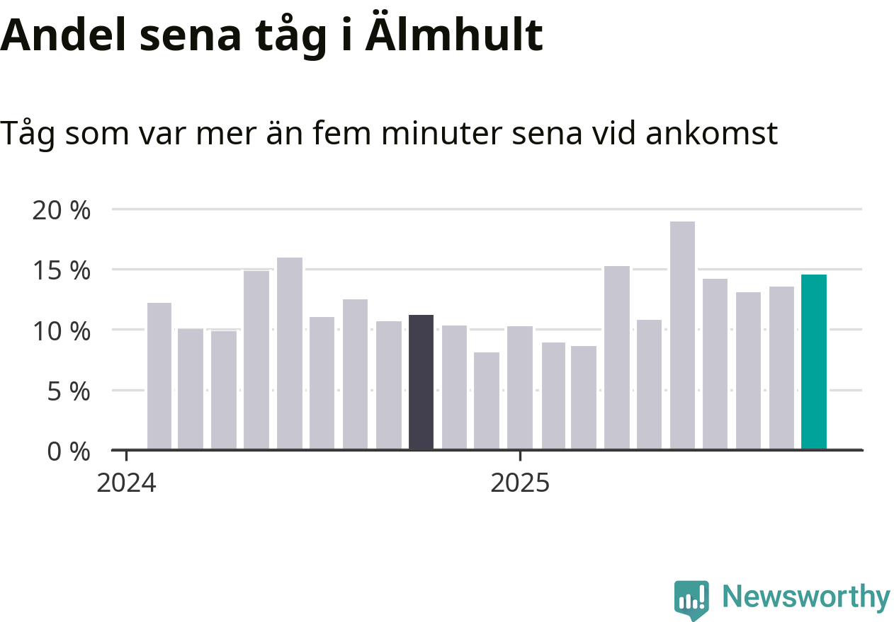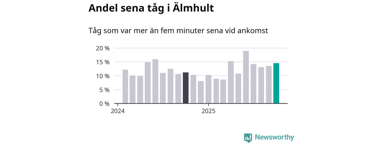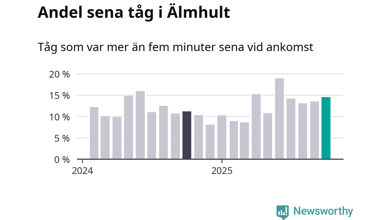 15 procent kan jämföras med 14 procent månaden innan, och elva procent i oktober 2024. Siffrorna bygger på realtidsinformation om tågavgångar och ankomster från Trafikverket, som Newsworthy löpande samlar in.