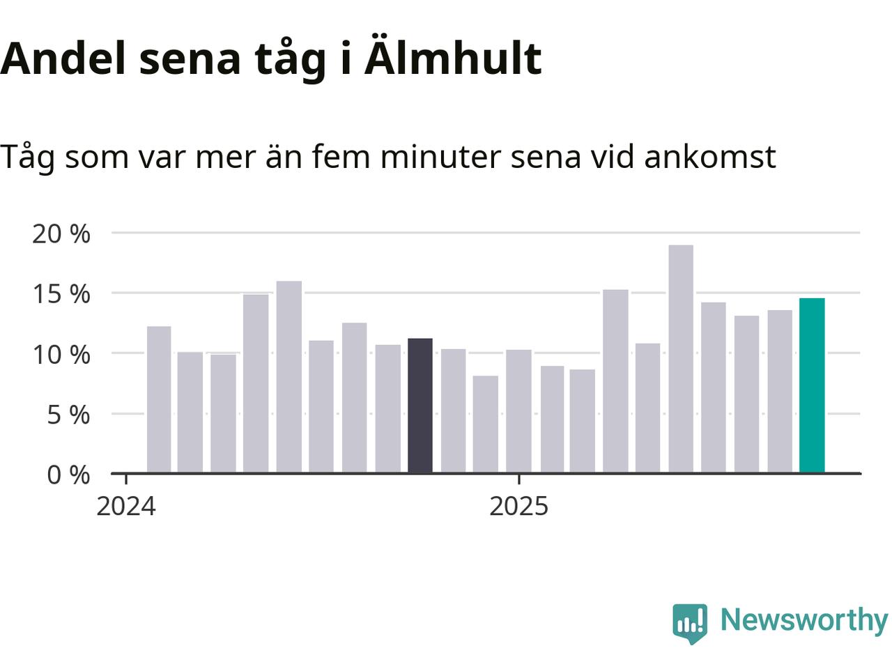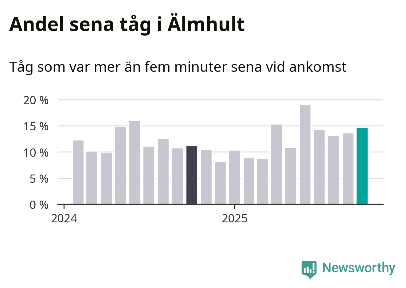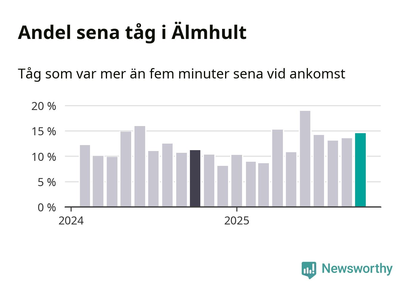 15 procent kan jämföras med 14 procent månaden innan, och elva procent i oktober 2024. Siffrorna bygger på realtidsinformation om tågavgångar och ankomster från Trafikverket, som Newsworthy löpande samlar in.