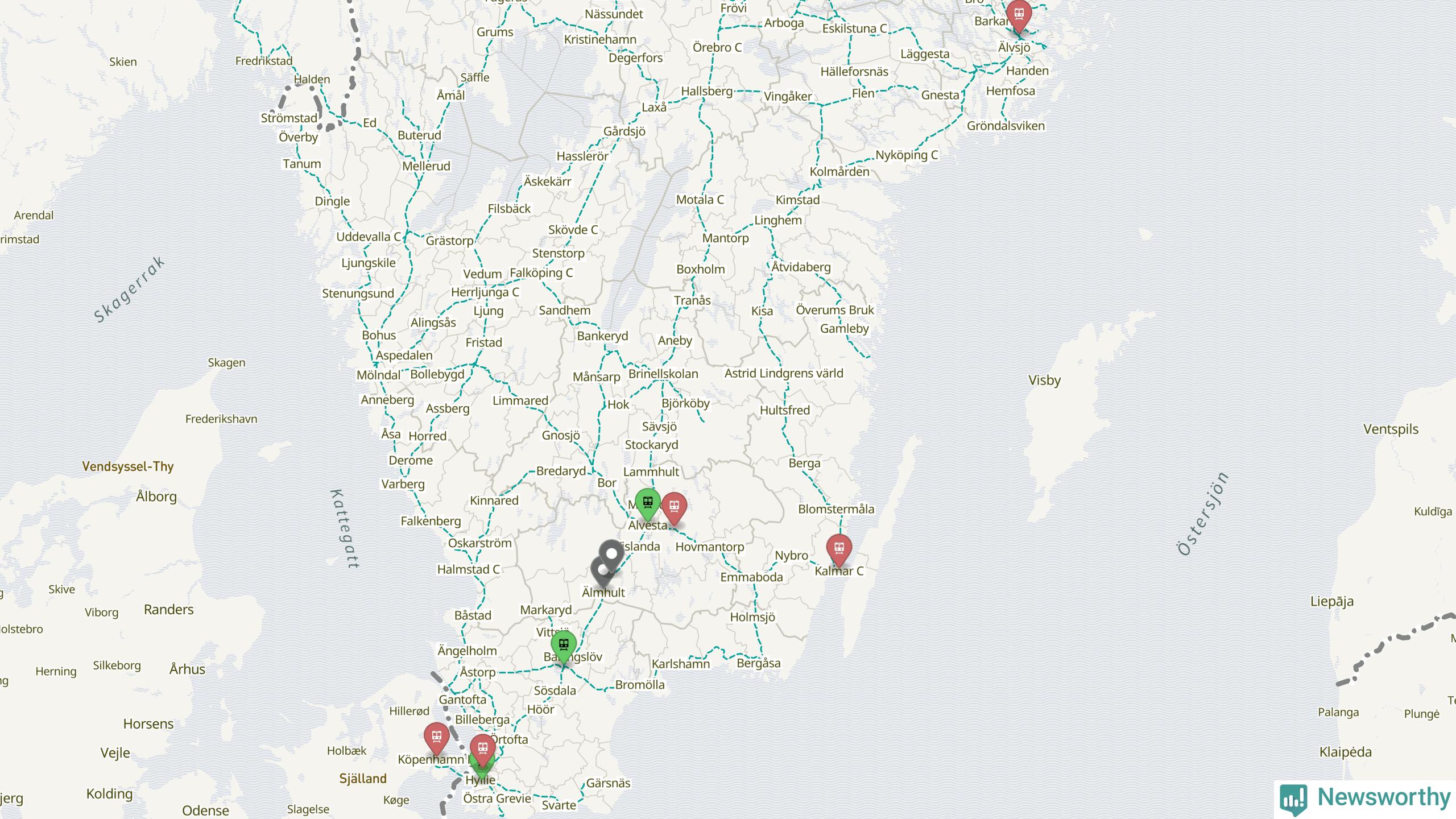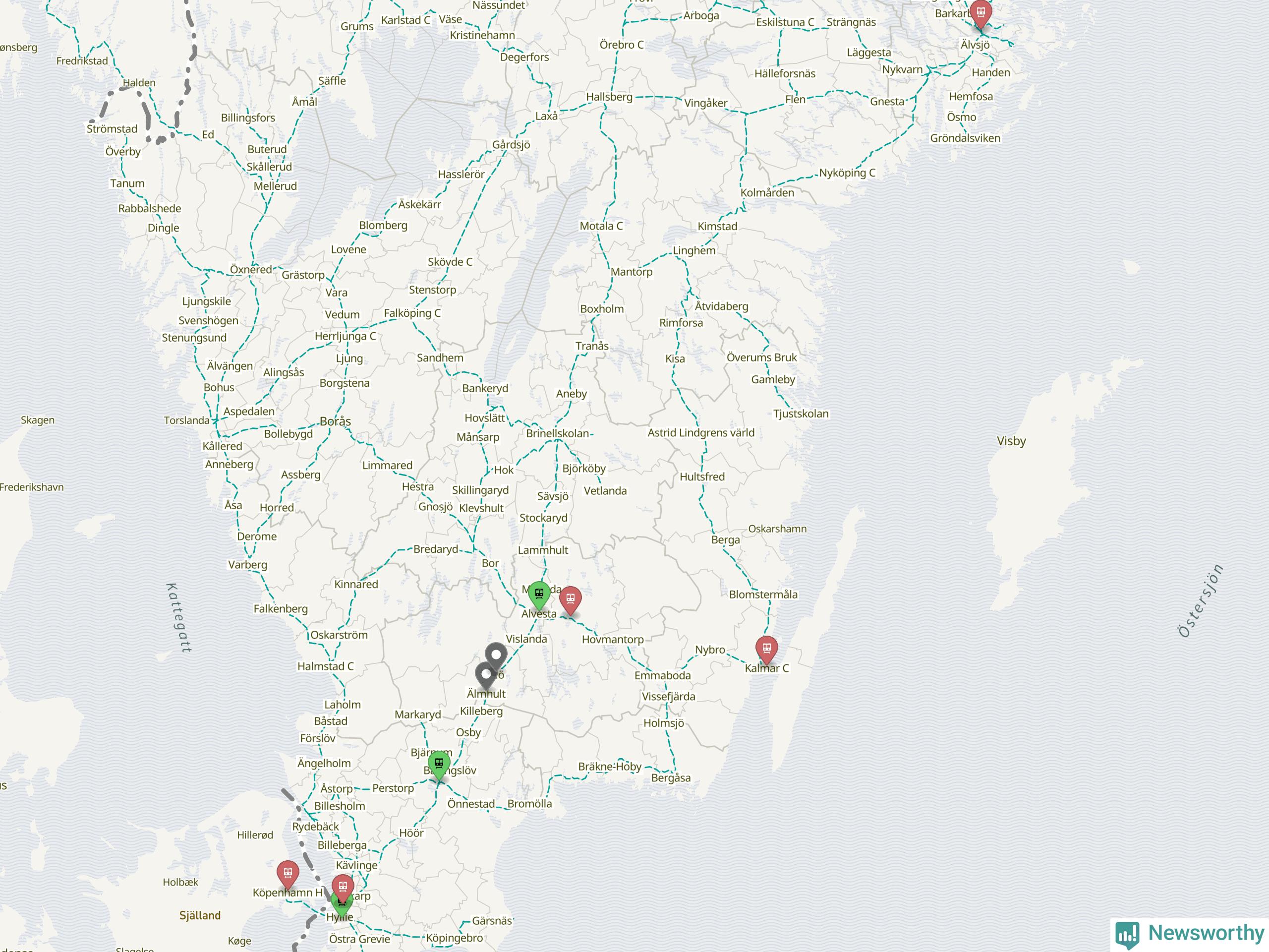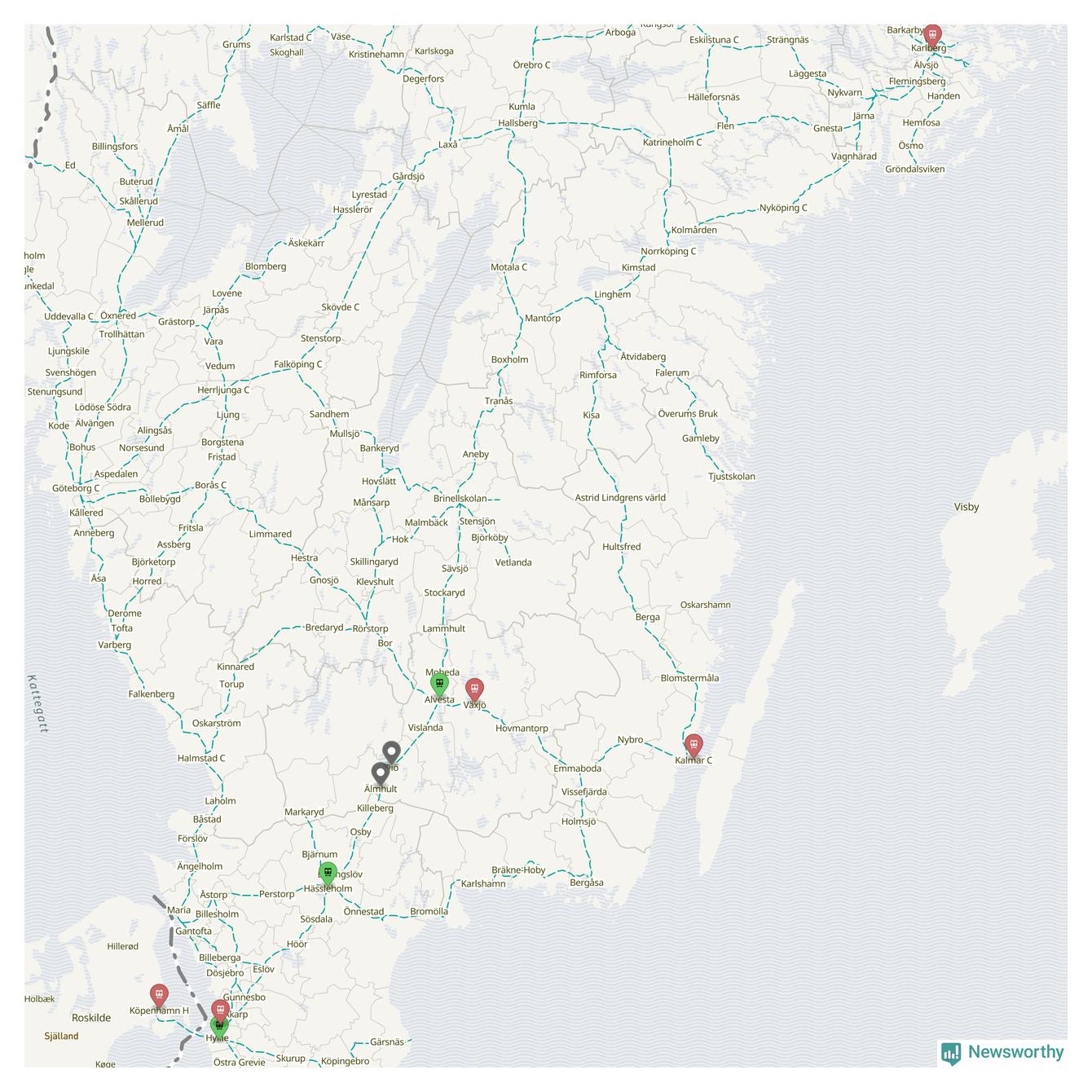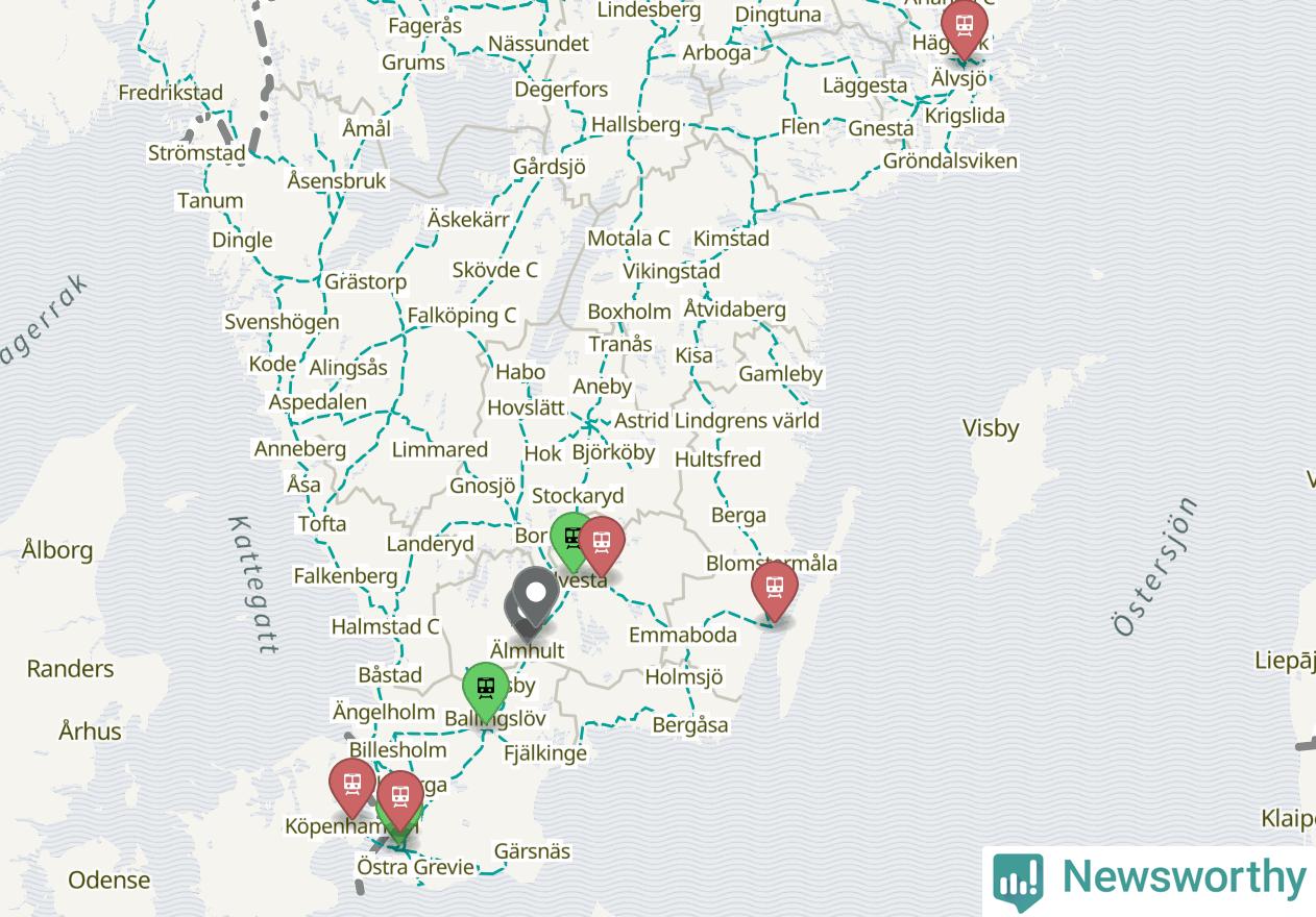 Kartdata från Mapbox, Newsworthy, OpenStreetMap och Trafikverket. Uppgifter om sträckor med passagerartrafik från jarnvag.net.