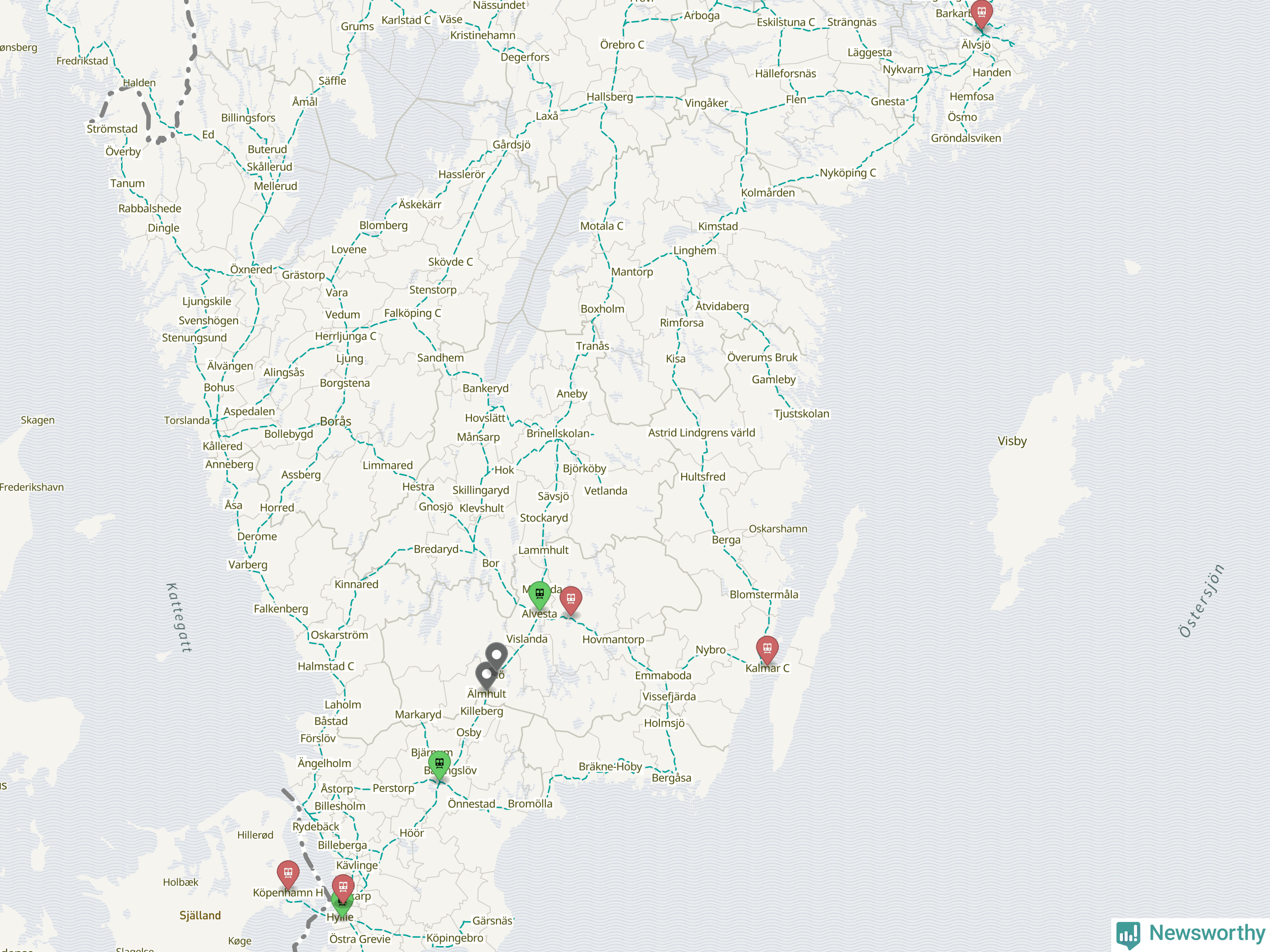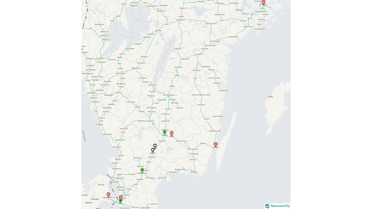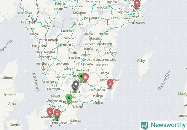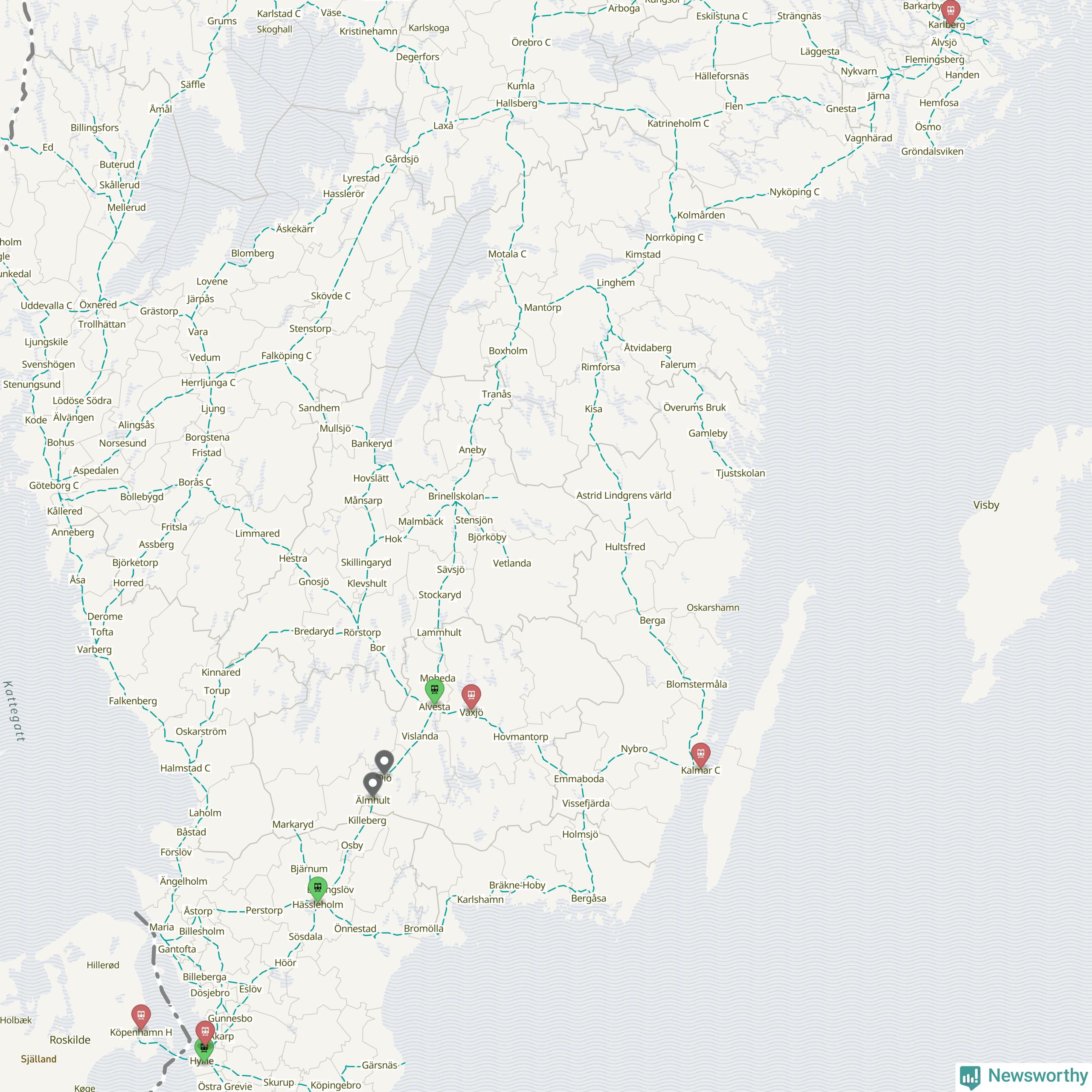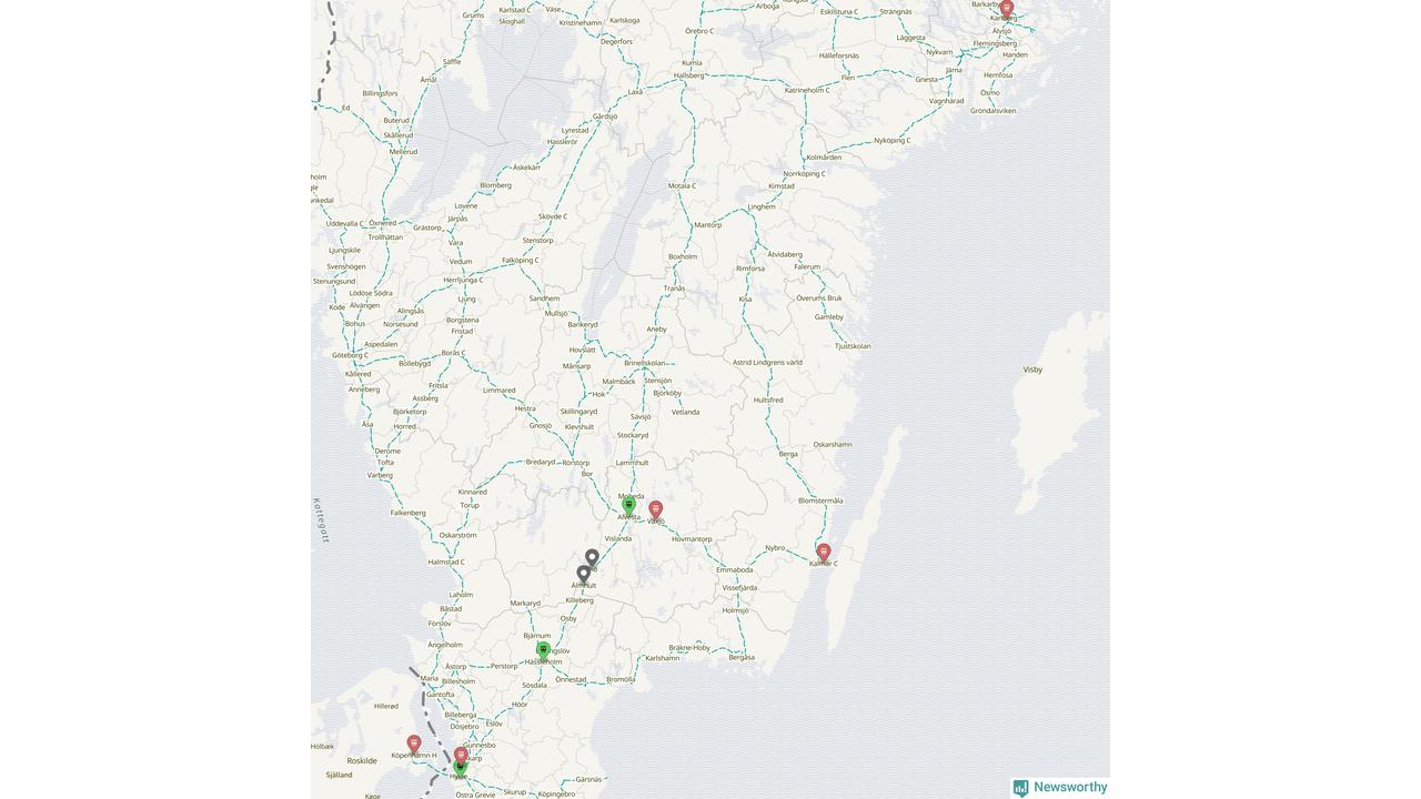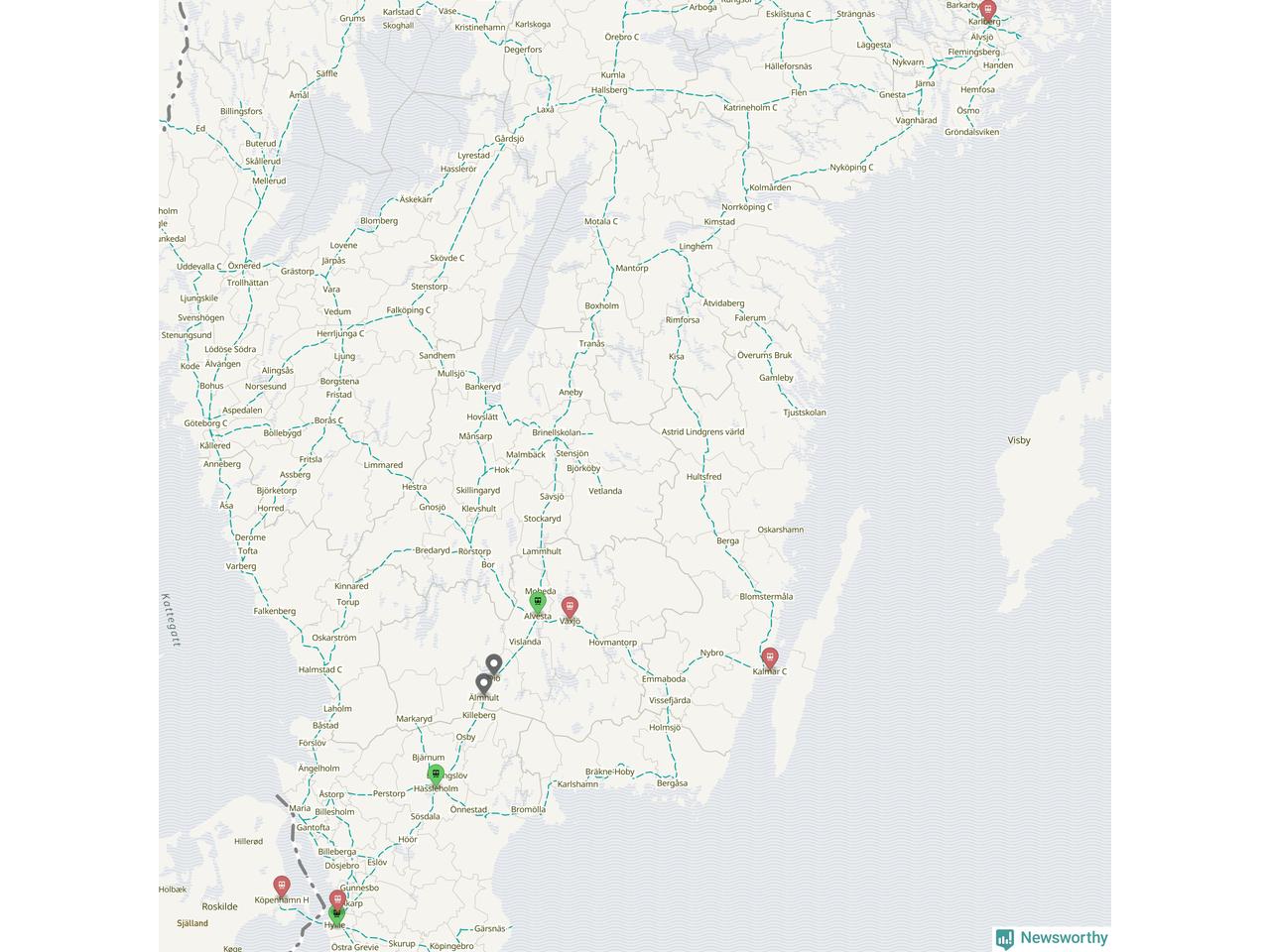 Kartdata från Mapbox, Newsworthy, OpenStreetMap och Trafikverket. Uppgifter om sträckor med passagerartrafik från jarnvag.net.