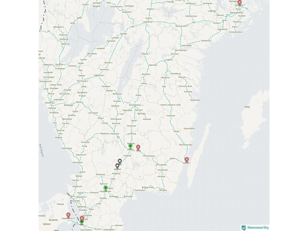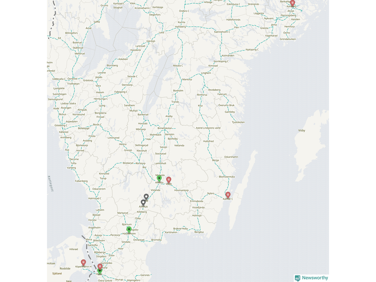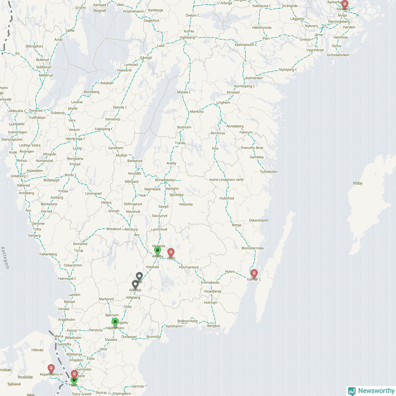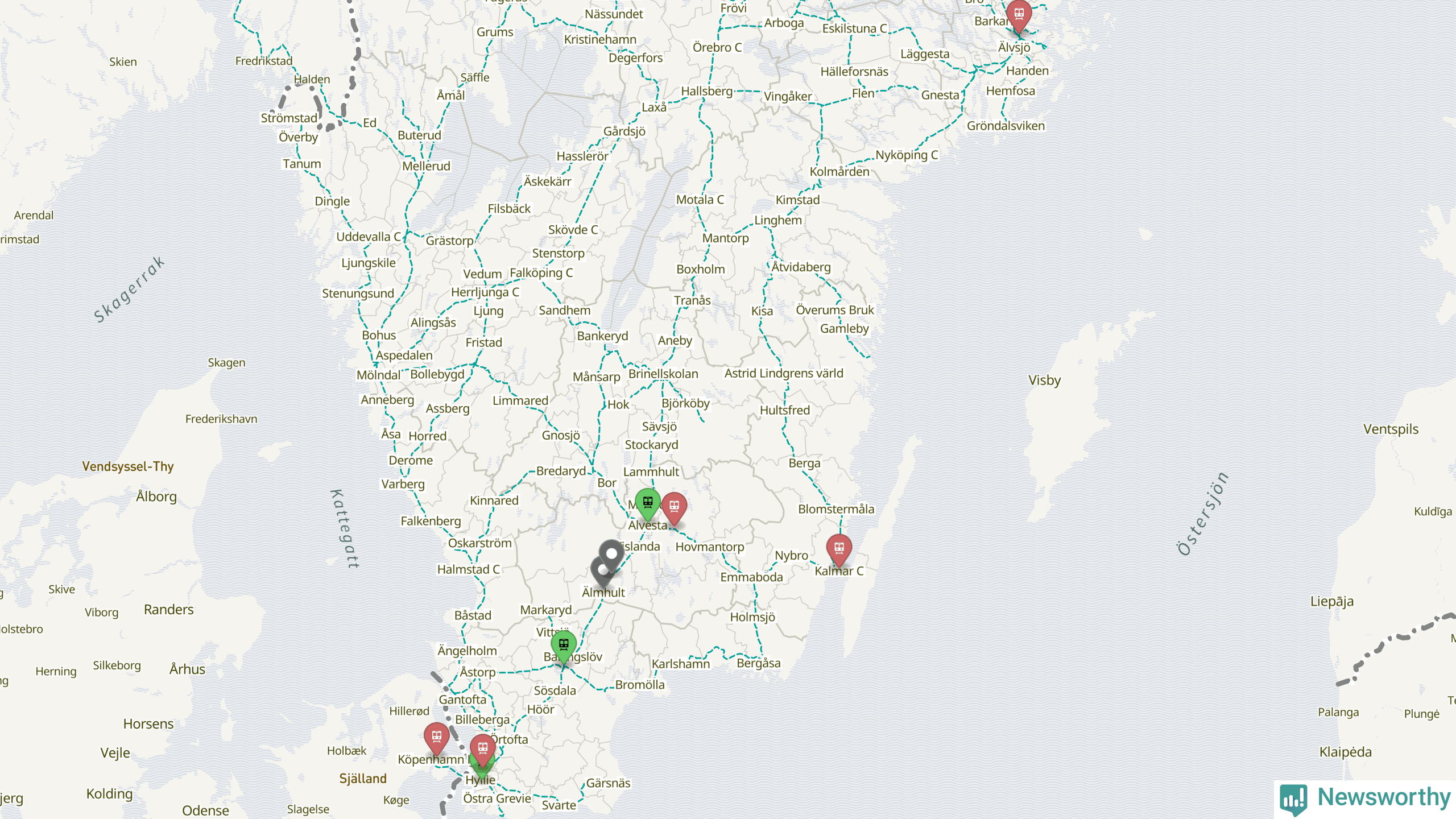 Kartdata från Mapbox, Newsworthy, OpenStreetMap och Trafikverket. Uppgifter om sträckor med passagerartrafik från jarnvag.net.