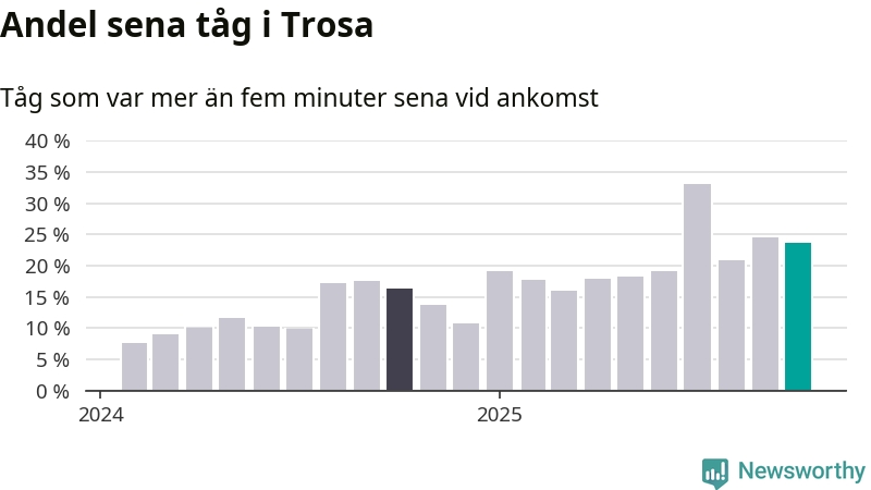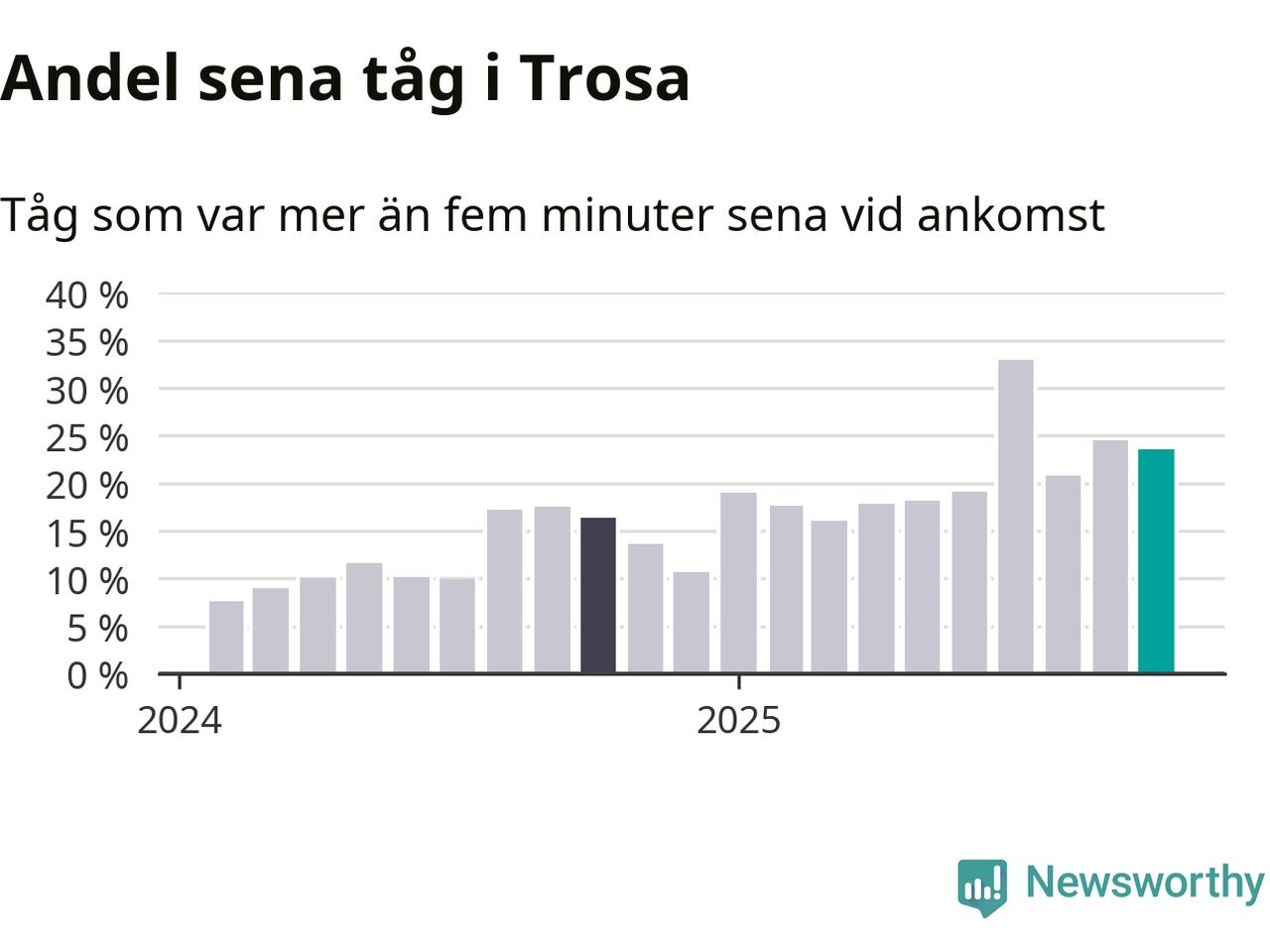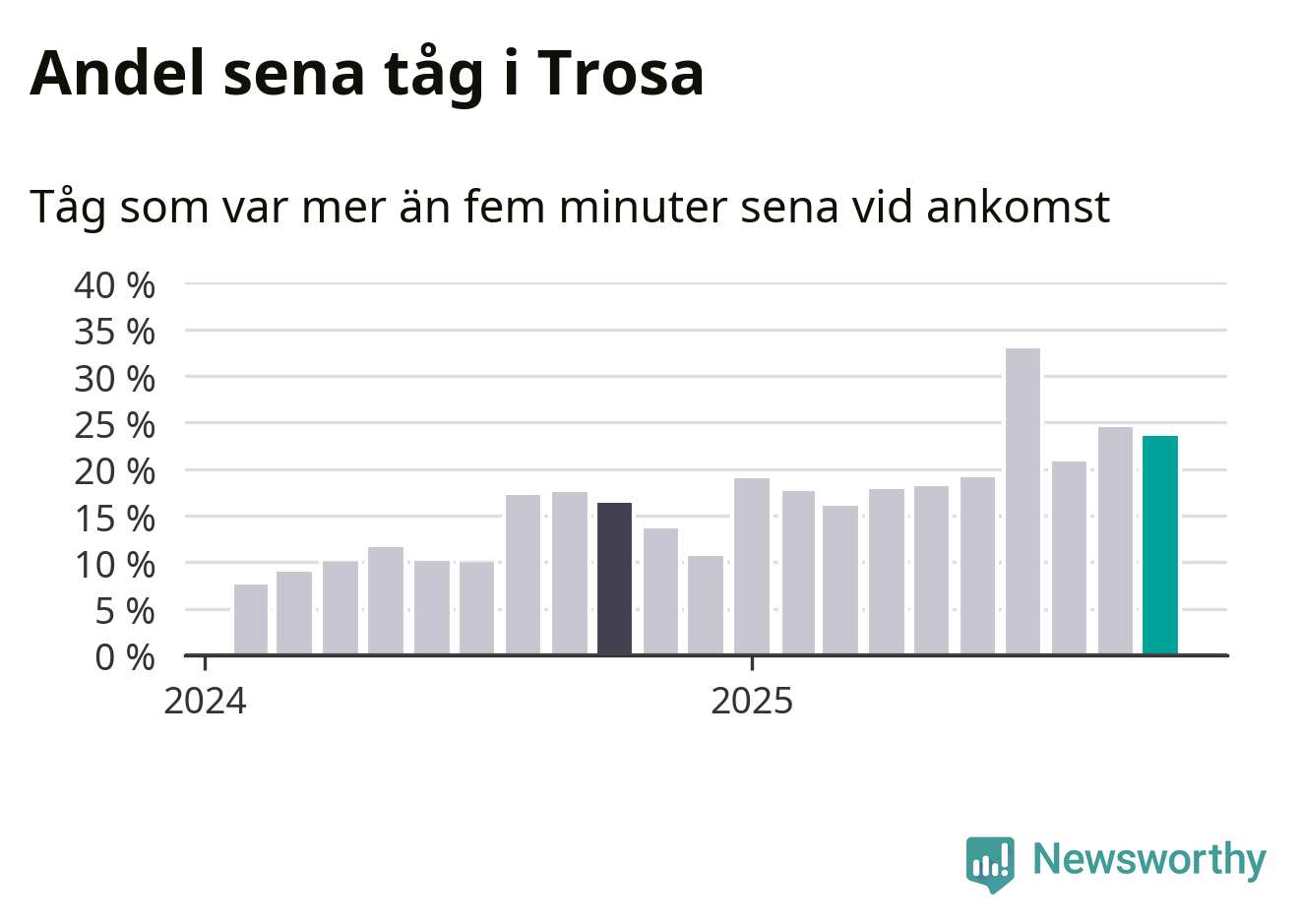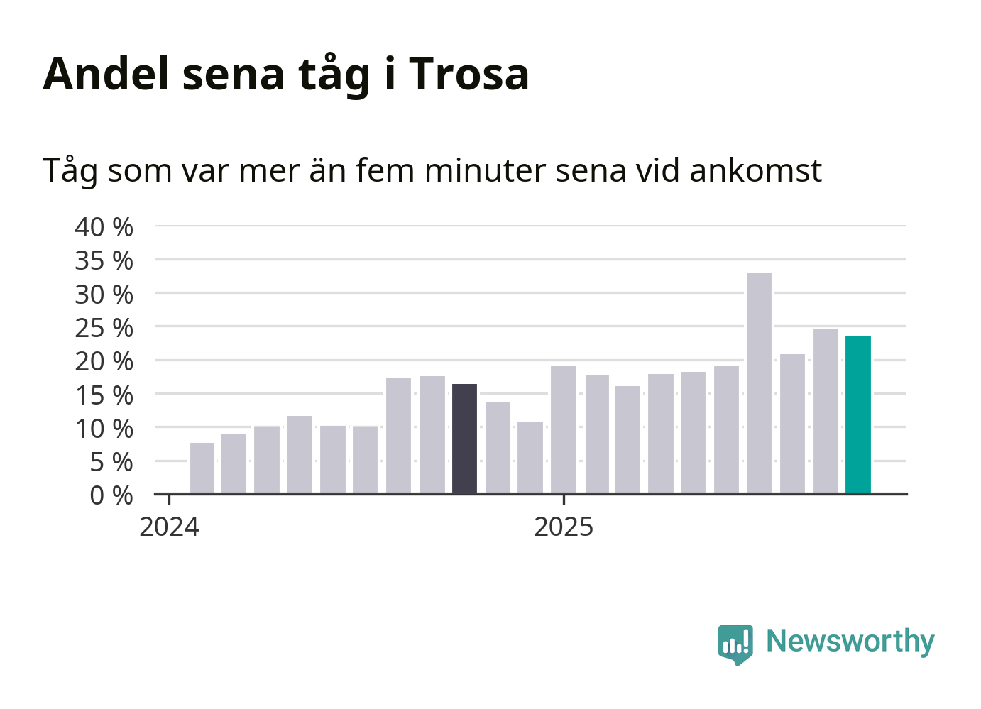 24 procent är marginellt mindre än månaden innan, och kan jämföras med 16 procent i oktober 2024. Siffrorna bygger på realtidsinformation om tågavgångar och ankomster från Trafikverket, som Newsworthy löpande samlar in.