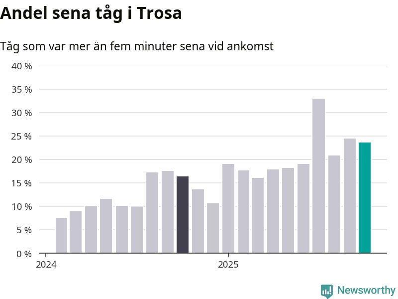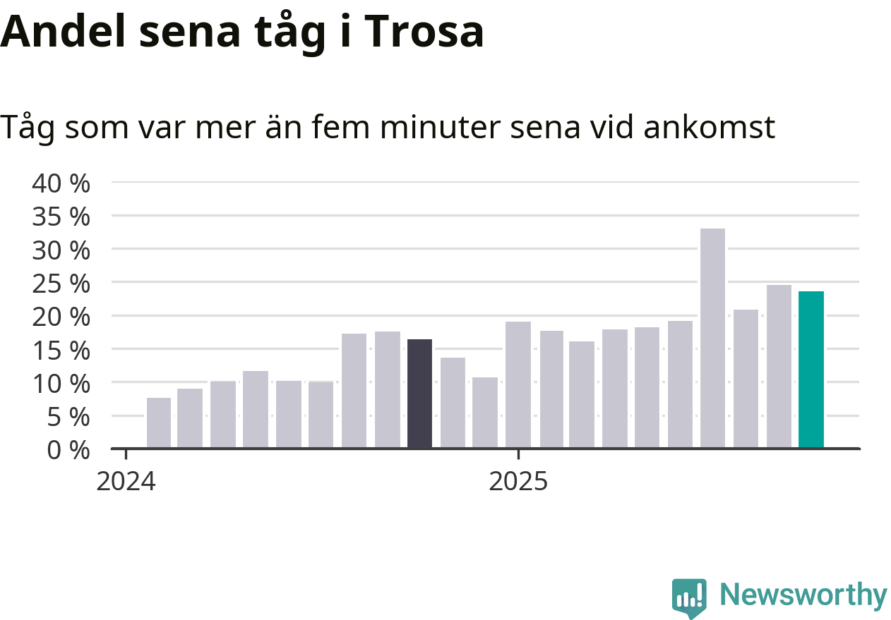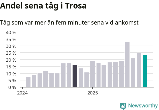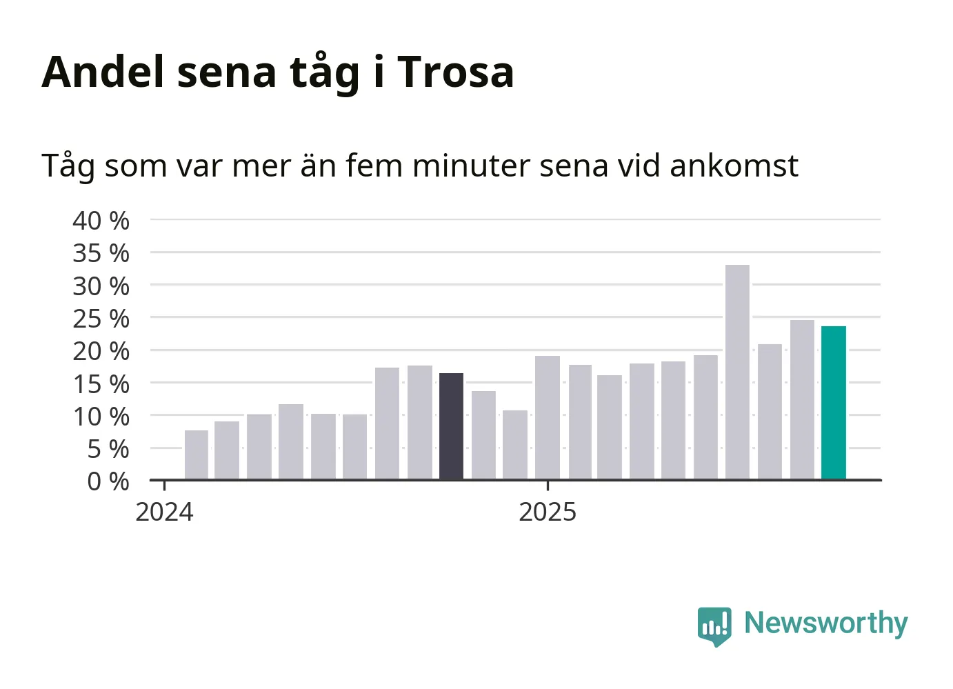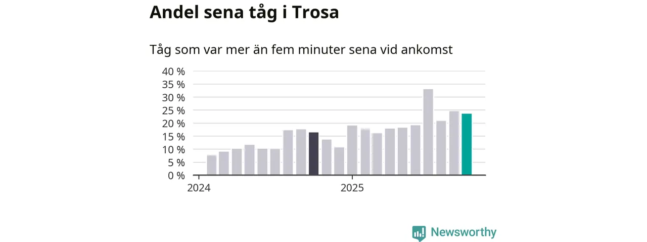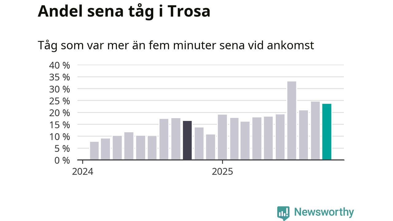 24 procent är marginellt mindre än månaden innan, och kan jämföras med 16 procent i oktober 2024. Siffrorna bygger på realtidsinformation om tågavgångar och ankomster från Trafikverket, som Newsworthy löpande samlar in.