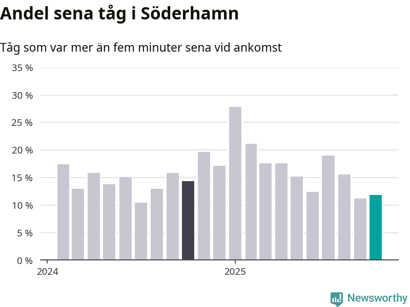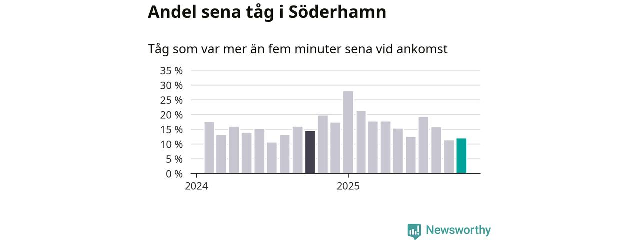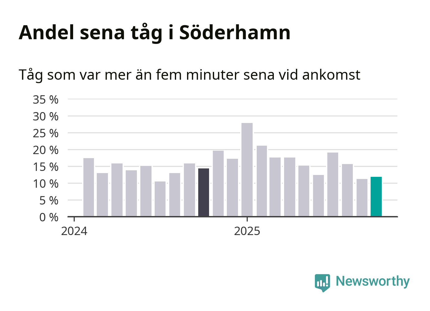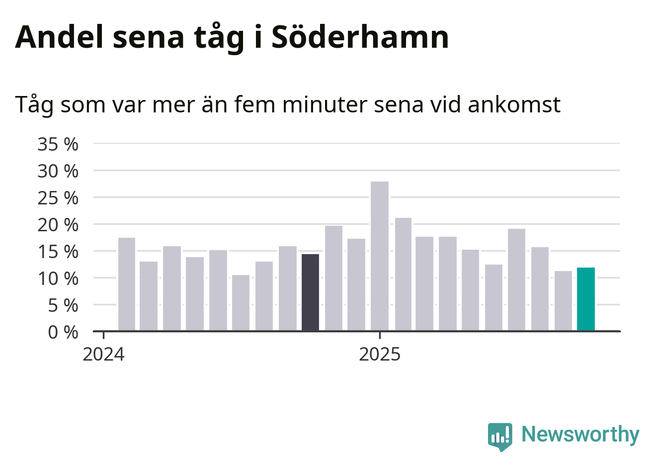 Tolv procent kan jämföras med elva procent månaden innan, och 14 procent i oktober 2024. Siffrorna bygger på realtidsinformation om tågavgångar och ankomster från Trafikverket, som Newsworthy löpande samlar in.